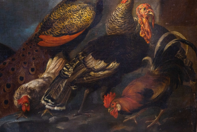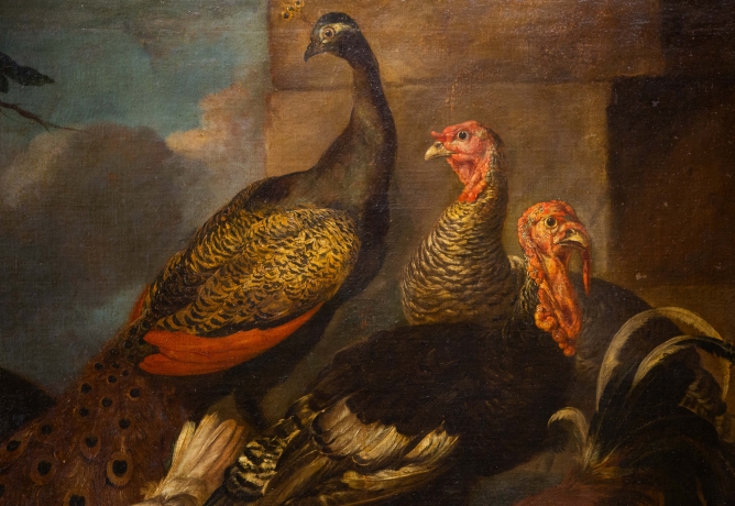 Giovanni Crivelli (detto il Crivellino), "Pavoni, tacchini e galli", olio su tela, Epoca '700