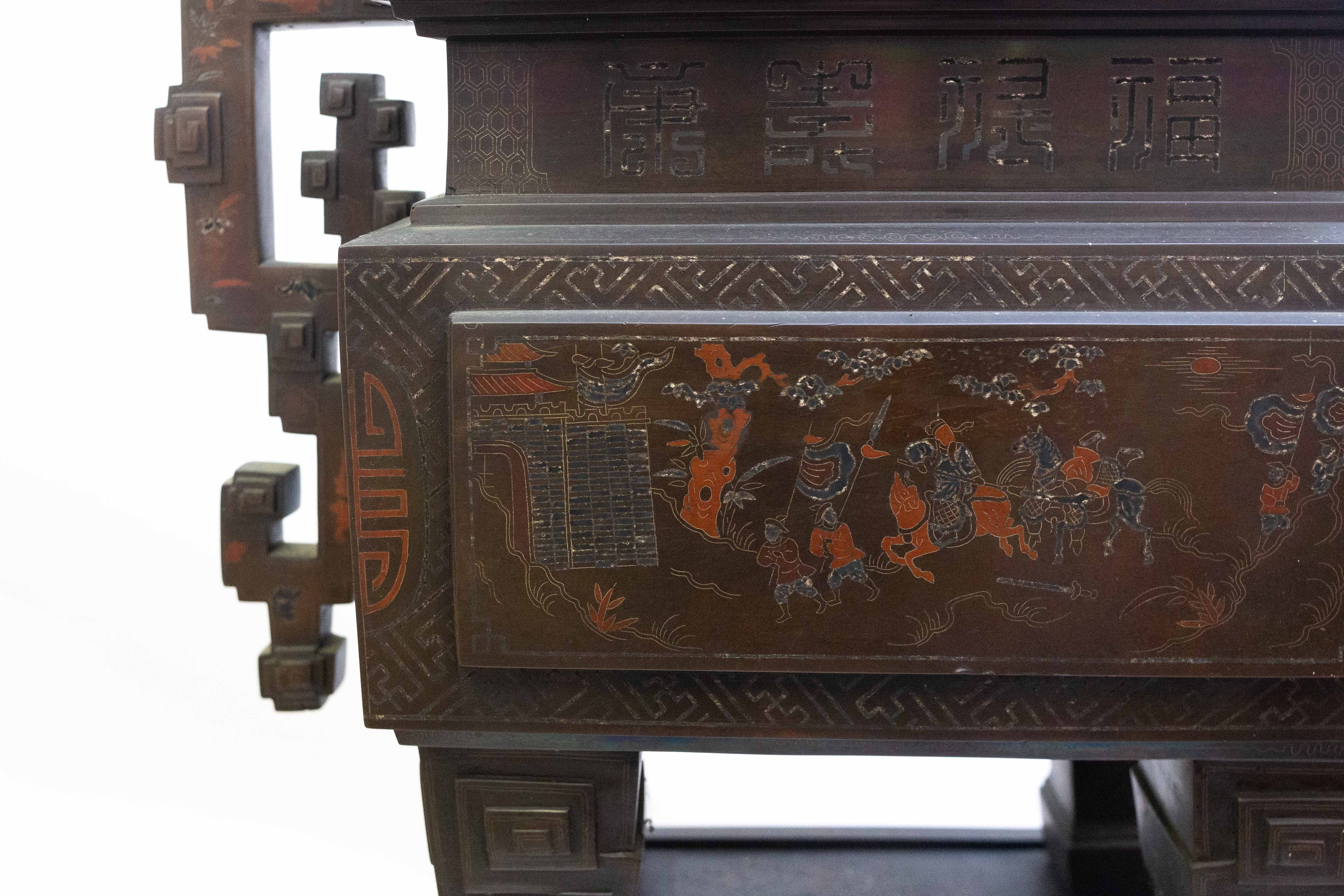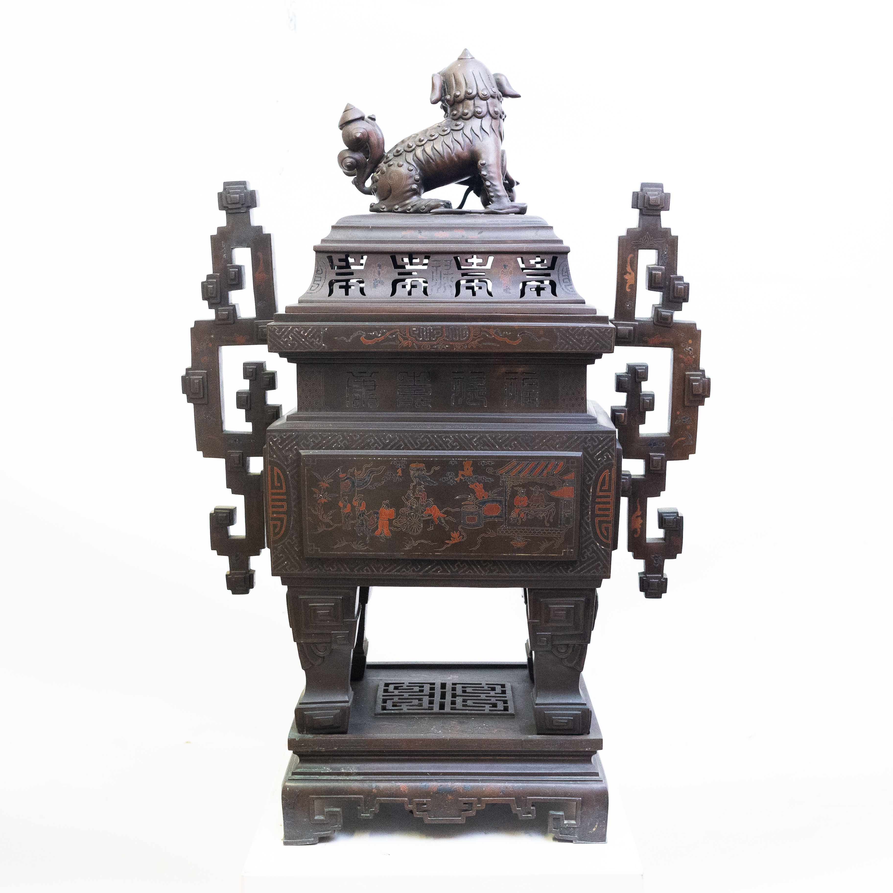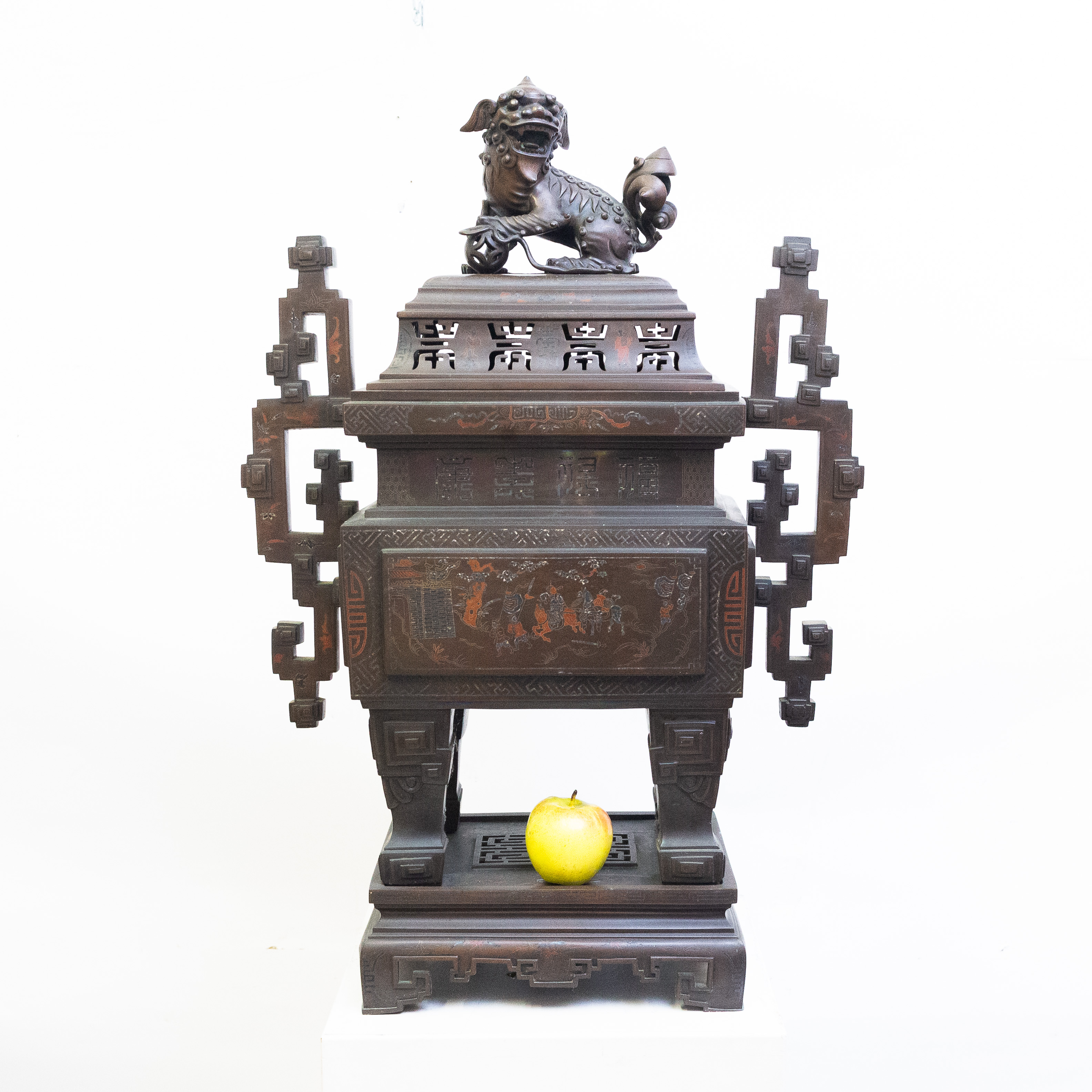 L'incensiere fuso di forma rettangolare impostato su quattro gambe con manici elaborati raffiguranti nuvole , su ciascun lato ci sono quattro personaggi di buon auspicio, con decorazioni di cavalieri in paesaggi intarsiate in argento e rame. La copertura traforata è sormontata da un grande pinnacolo a forma di cane leone 'Nghe'. Il supporto con sezione centrale rettangolare traforata ulteriormente decorato con decorazioni intarsiate di vari fiori, sostenuto da quattro piedini a cartiglio.