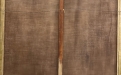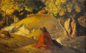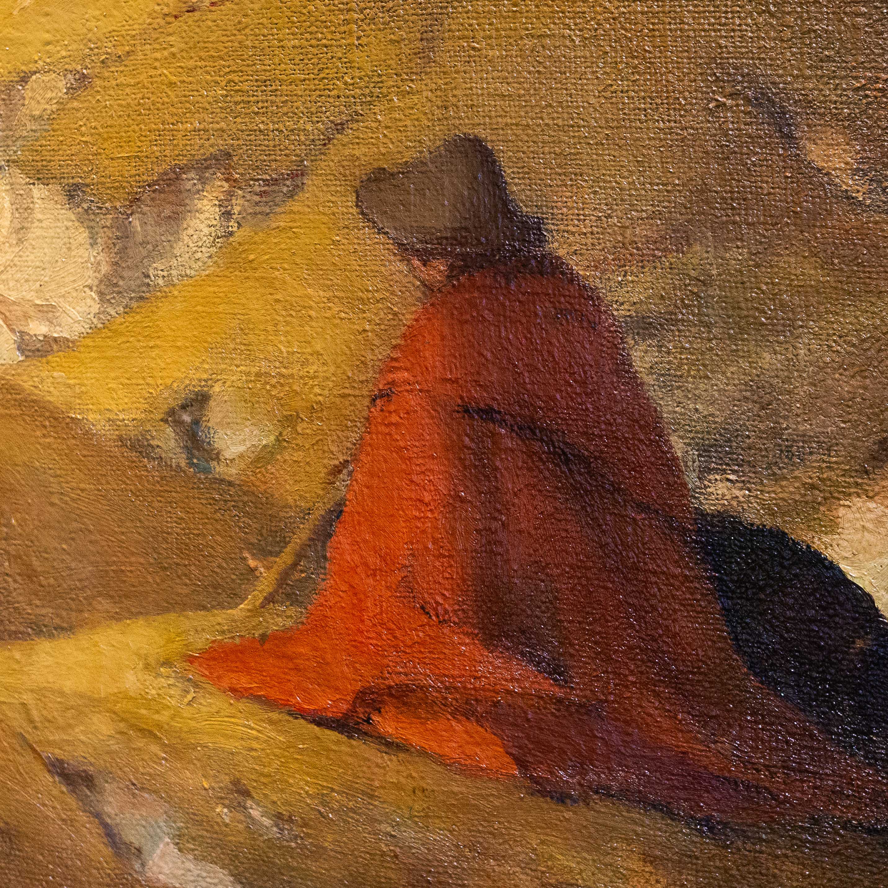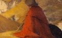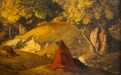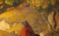La composizione raffigura un paesaggio immerso nella quiete dell’autunno, dominato da tonalità calde e terrose. Il fulcro della scena è una figura umana avvolta in un mantello rosso-bruno, seduta o accovacciata lungo un sentiero sinuoso, colta in un momento di raccoglimento silenzioso. Attorno, la natura si dispiega con alberi dalle chiome dorate e ocra, che suggeriscono il pieno della stagione autunnale, mentre il terreno ondulato accompagna lo sguardo verso una profondità morbida e meditativa.