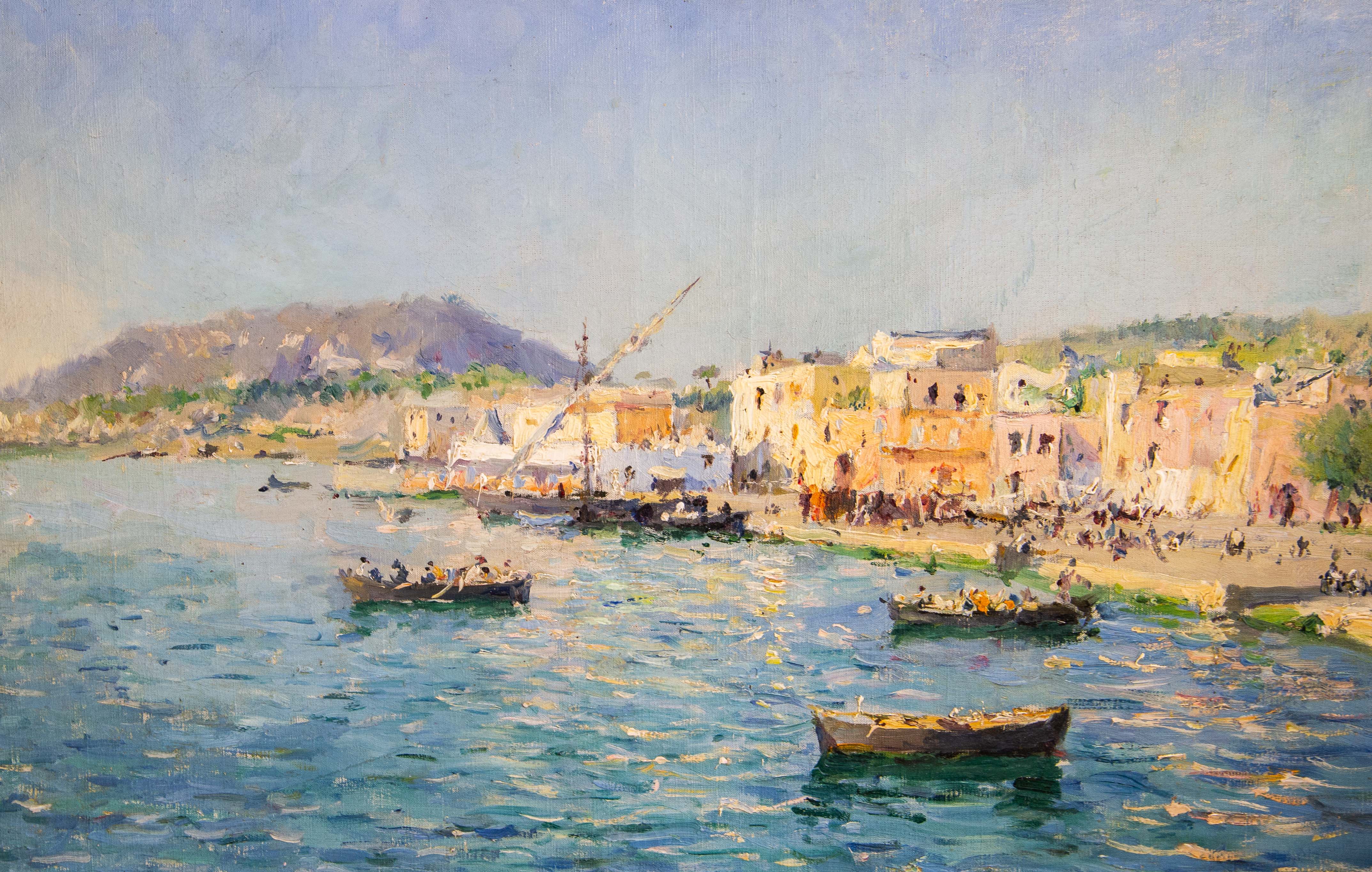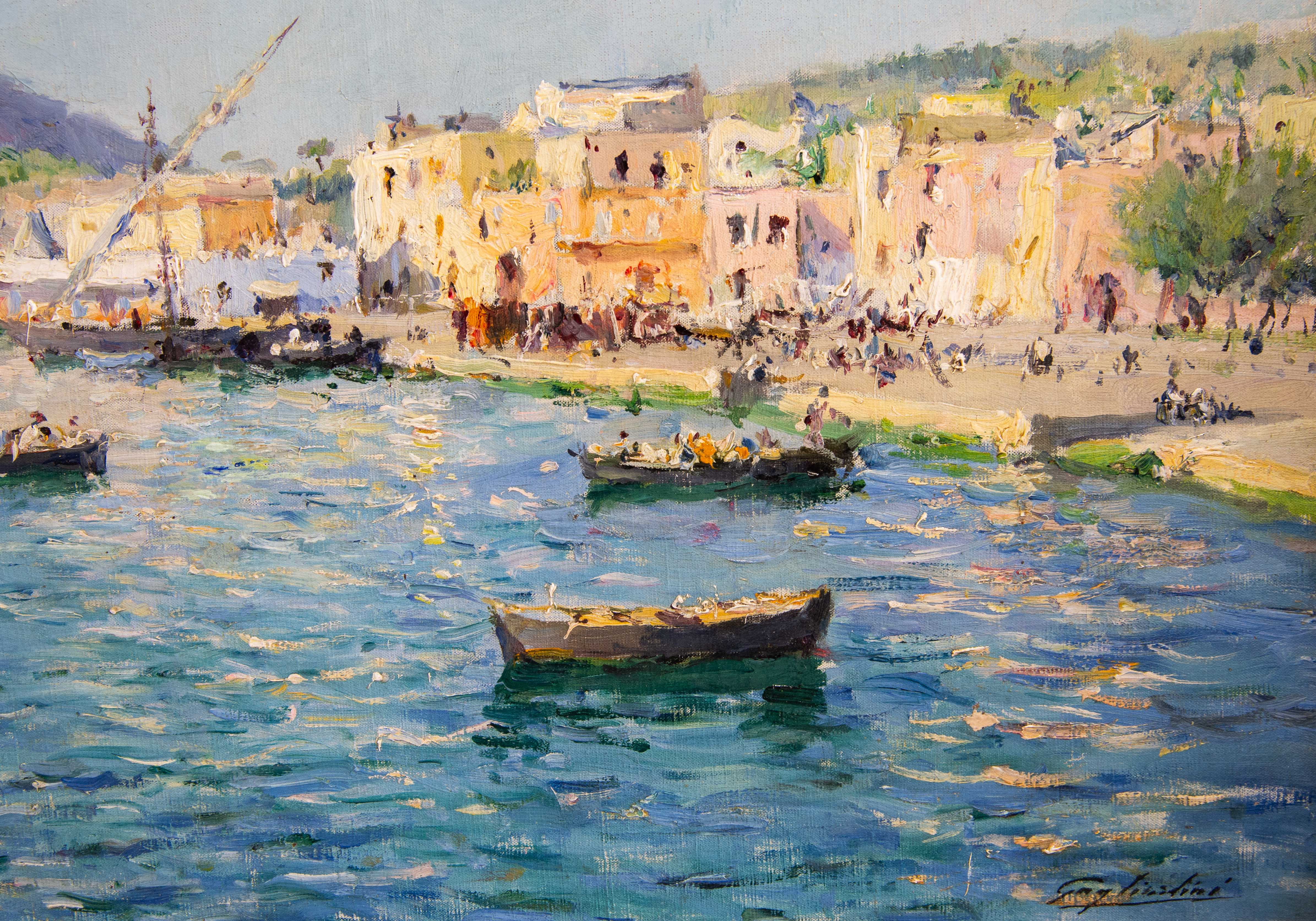 Questo dipinto ad olio di Julien Gustave Gagliardini, firmato in basso a destra e corredato da targhetta sulla cornice con il titolo “Petit port près de Toulon”, è un raffinato esempio della pittura luminosa e vibrante dell’artista francese.