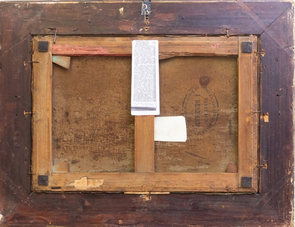 Cornice riccamente intagliata, che impreziosisce ulteriormente l’opera e reca la targhetta con il titolo.