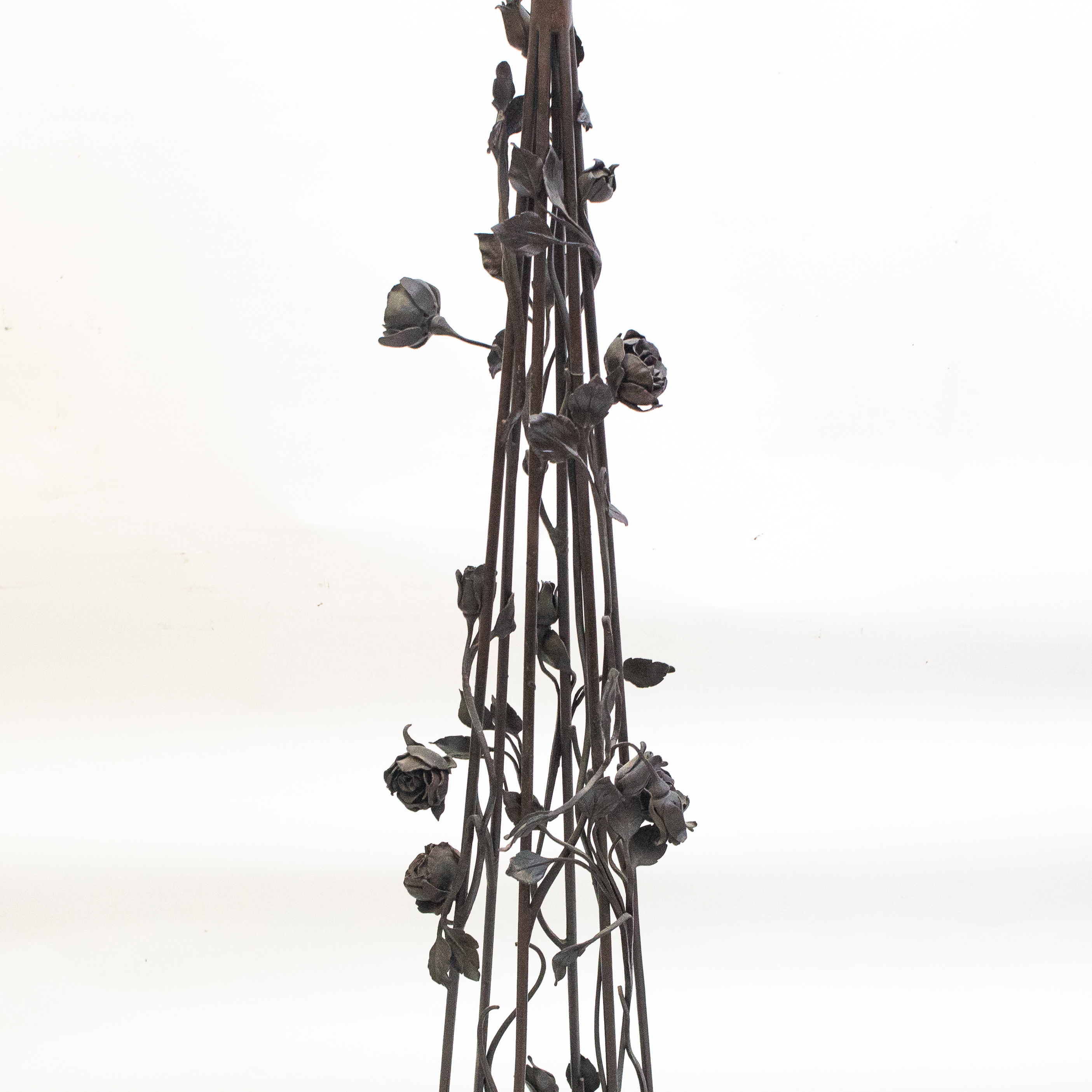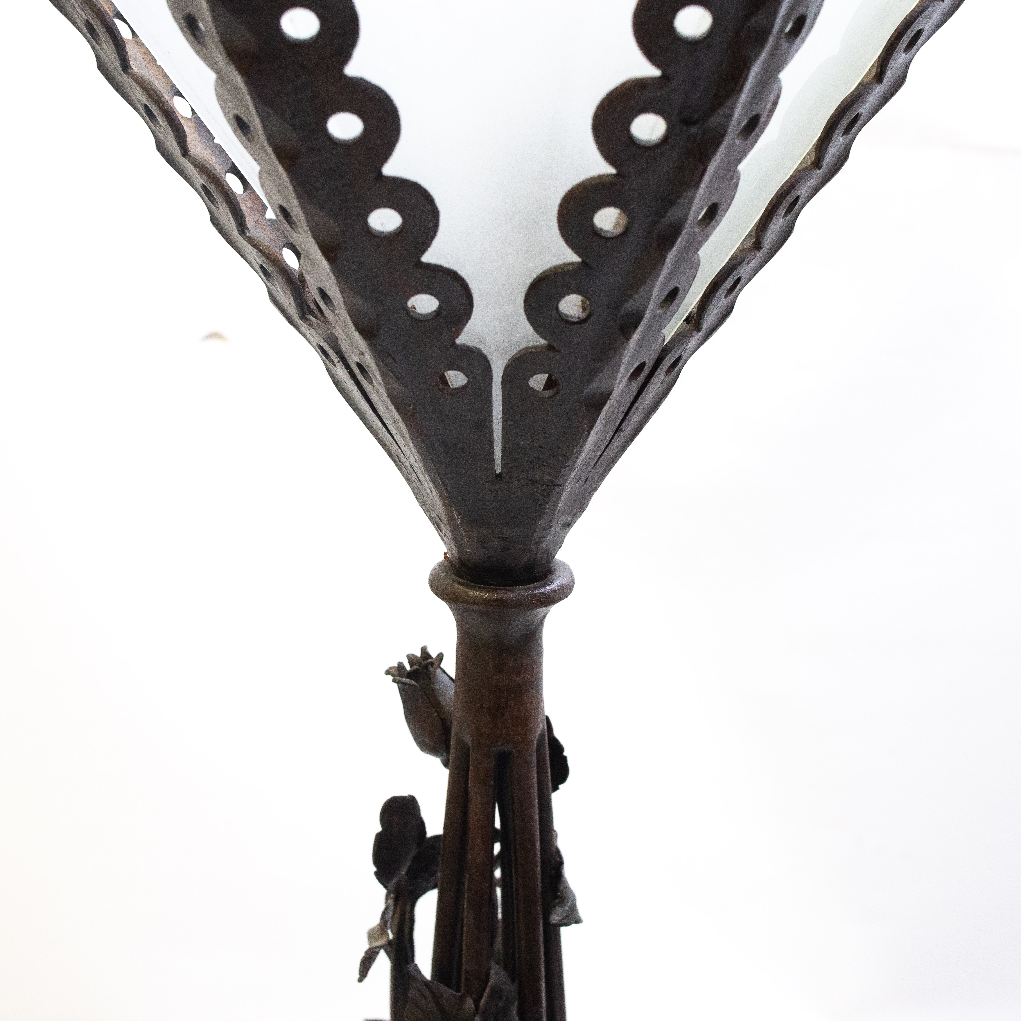 Splendida lampada in stile Liberty in ferro battuto e vetro satinato.