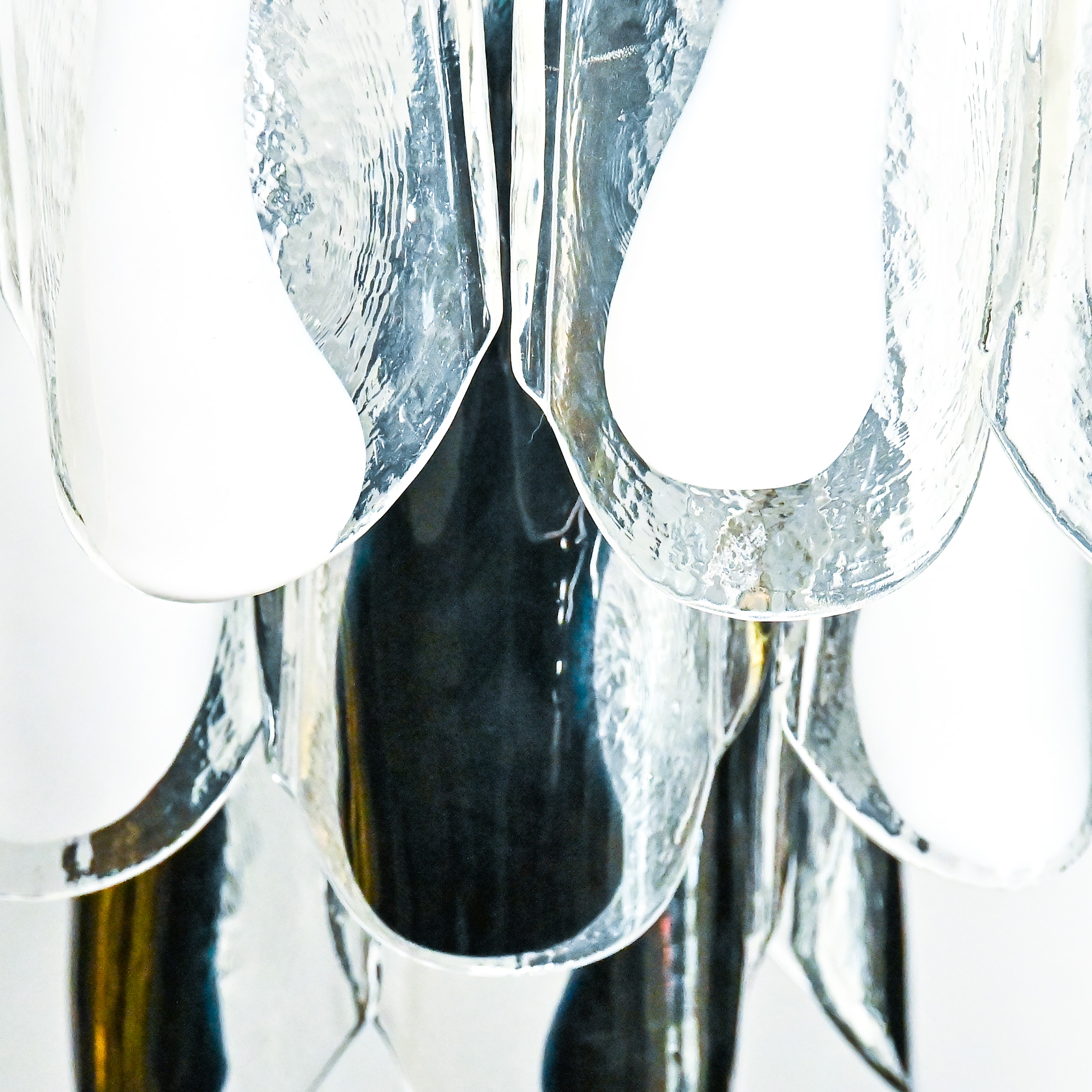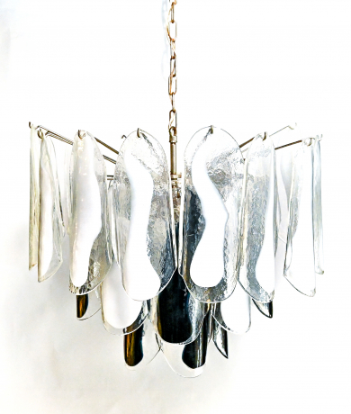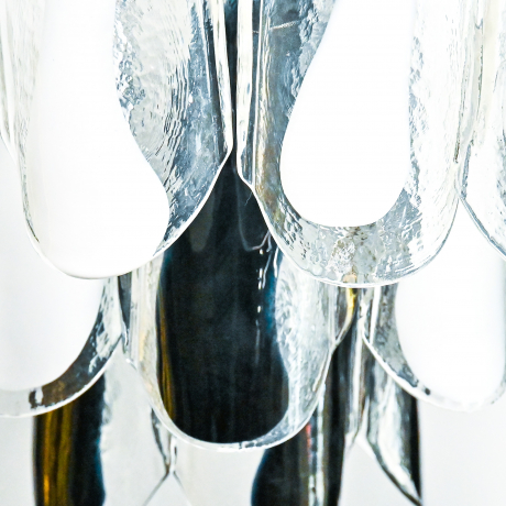 La struttura del lampadario è in metallo cromato e sostiene 30 lastre in vetro di murano trasparente con sfumature bianche o nere.