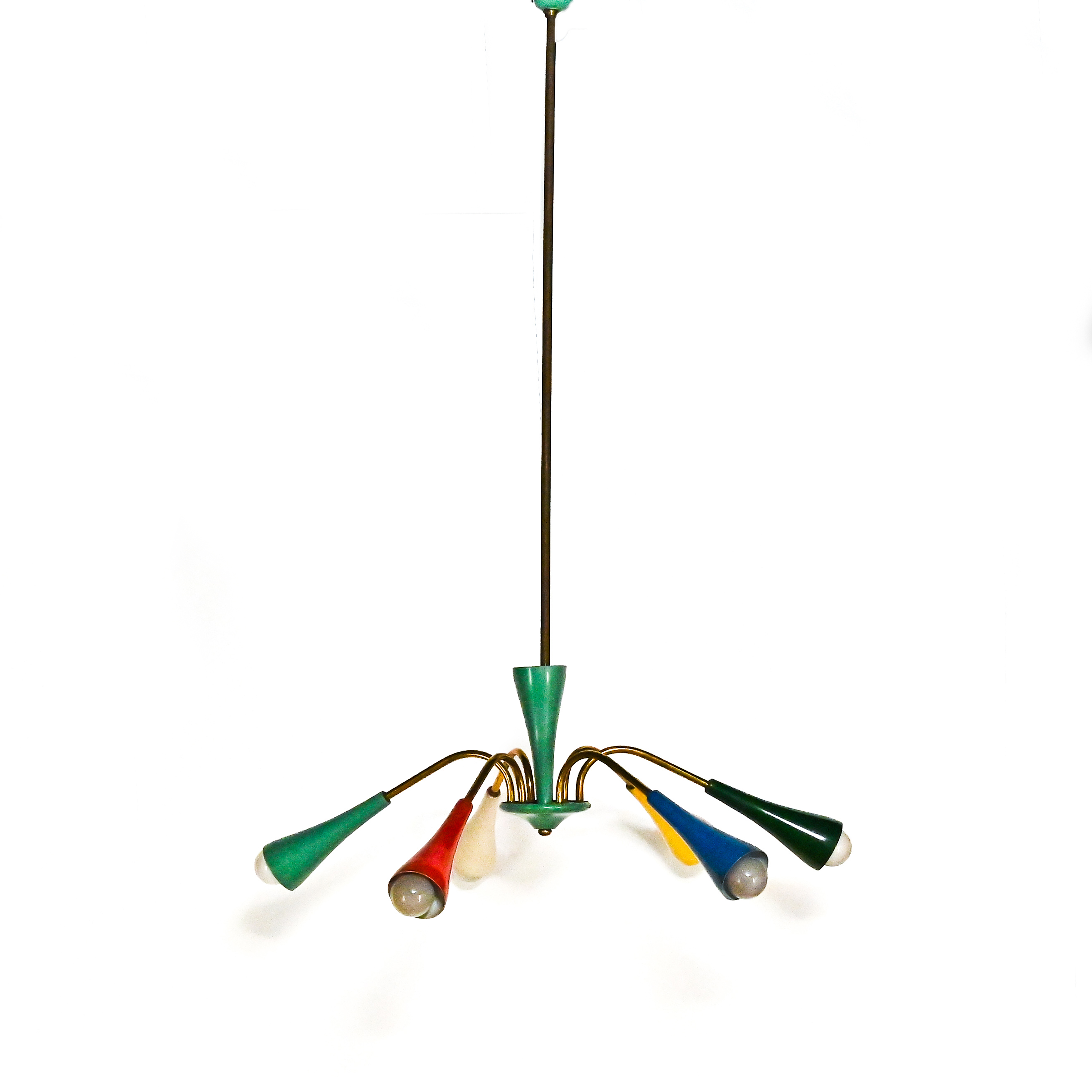 Lampadario a sei luci con struttura in ottone e paralumi colorati di tonalità diverse. In ottime condizioni.