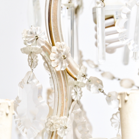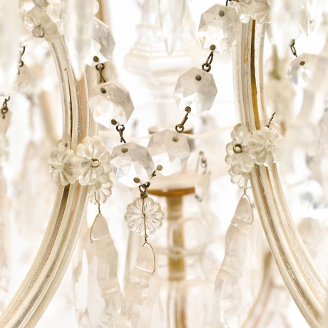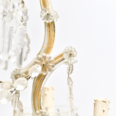 Lampadario in stile Maria Teresa, con 9 punti luce, risalente ai primi del '900. Struttura in metallo rivestita di lamine di vetro.