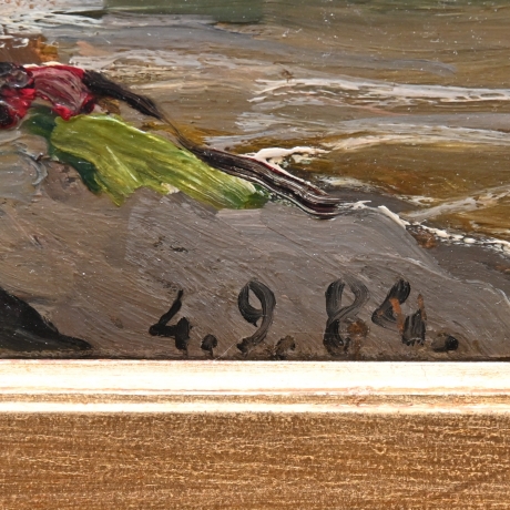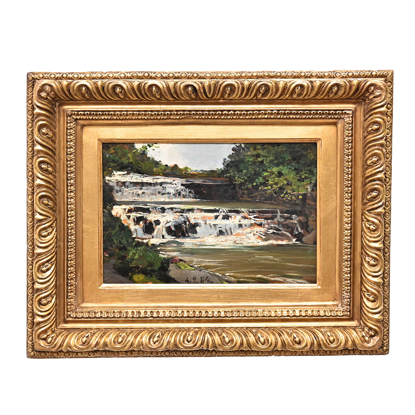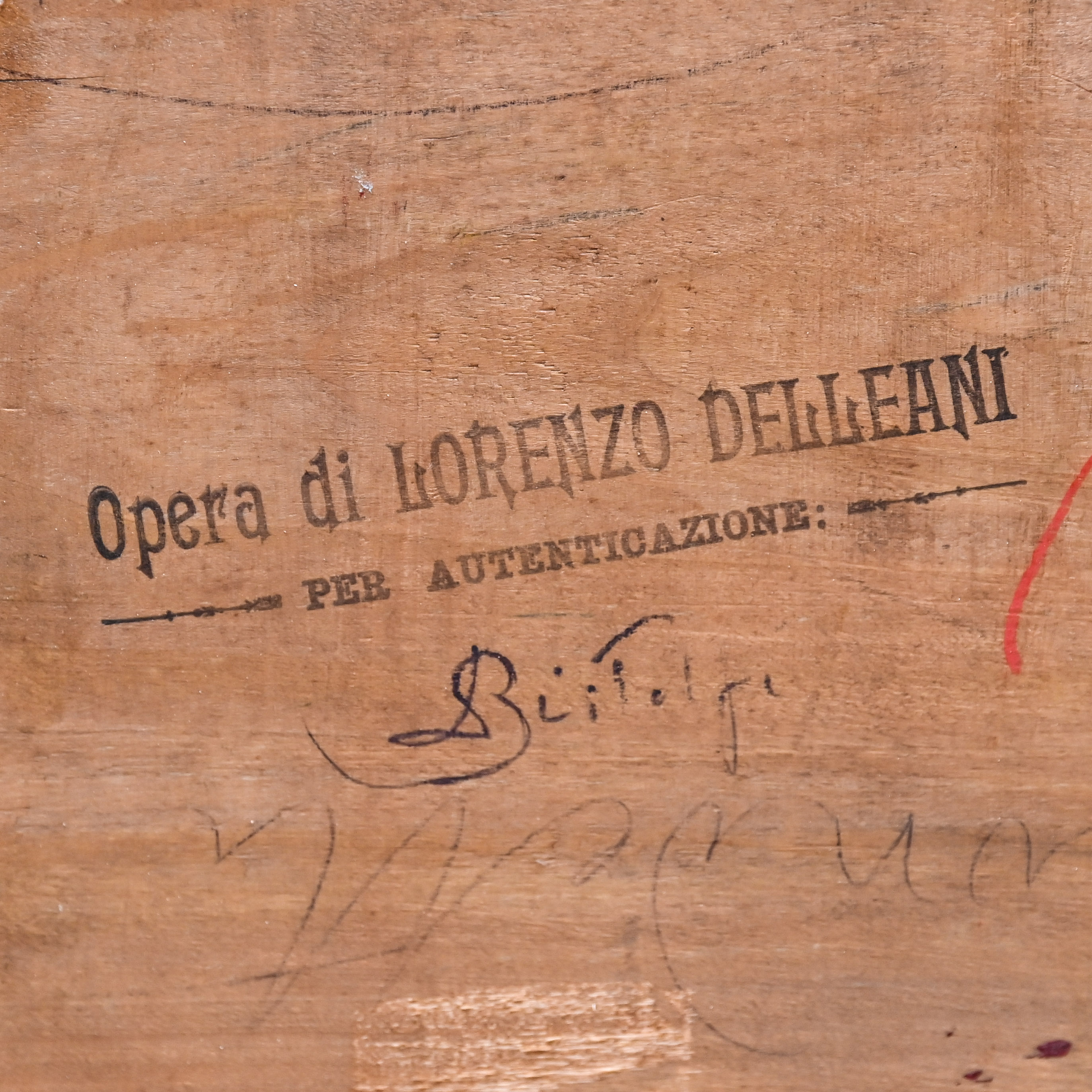 Torrente Oremo presso Biella. Lorenzo Delleani (Pollone, 17 gennaio 1840 – Torino, 13 novembre 1908) Datata in basso al centro 4.9.84. Timbro e firma al retro di Leonardo Bistolfi, riproduzione fotografica sul catalogo Dragone al N° 425.