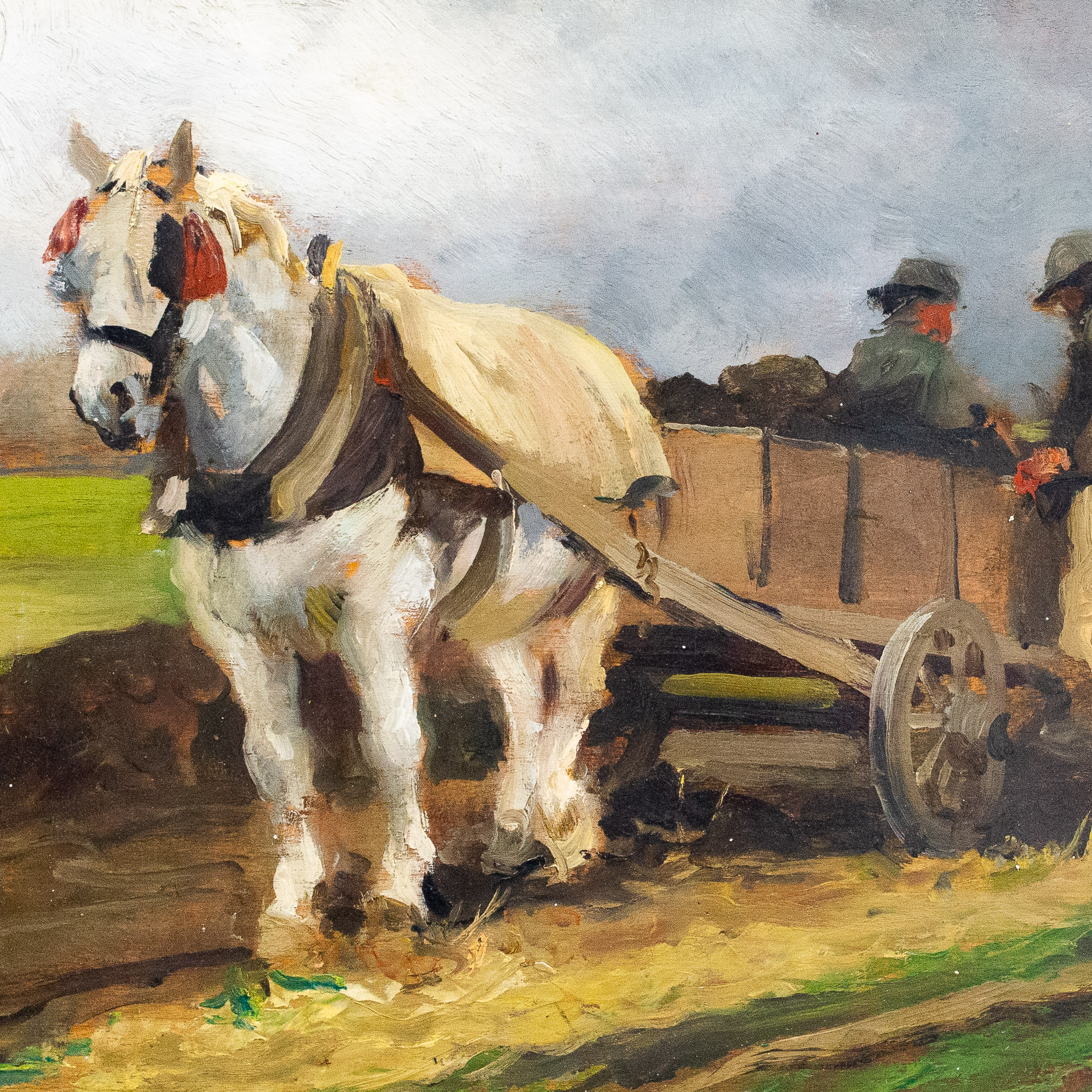 La scena cattura un momento della vita rurale in autunno, evidenziando la pratica agricola della concimazione. Un cavallo bianco, robusto e pazientemente fermo, è posto al centro dell'attenzione, trainando un carro di legno carico. I dettagli dei finimenti e la muscolatura del cavallo sono resi con tocchi pittorici vigorosi, che riflettono l'abilità di Delleani nel rappresentare il lavoro quotidiano.