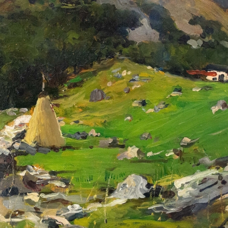 L'opera presenta una veduta di un paesaggio montano dominato da una vetta rocciosa, circondata da pendii verdi punteggiati di rocce e alberi. In primo piano si nota un covone di fieno, elemento ricorrente nei dipinti di Delleani, che richiama la vita rurale della regione. Sullo sfondo, alcune baite con tetti rossi donano profondità alla scena e suggeriscono la presenza umana nel paesaggio.