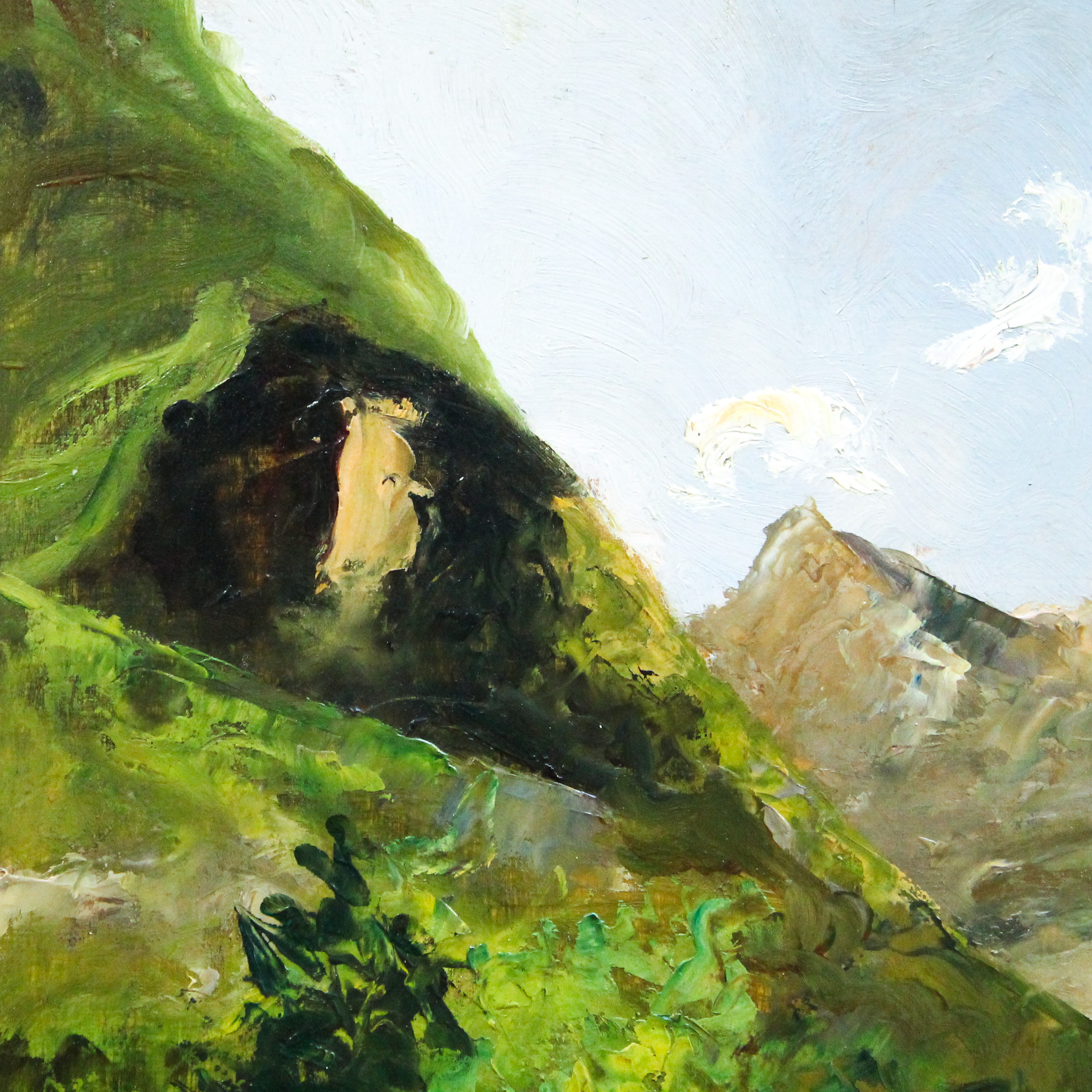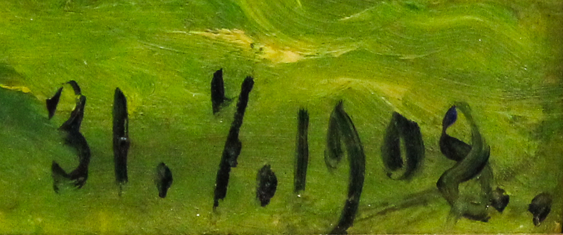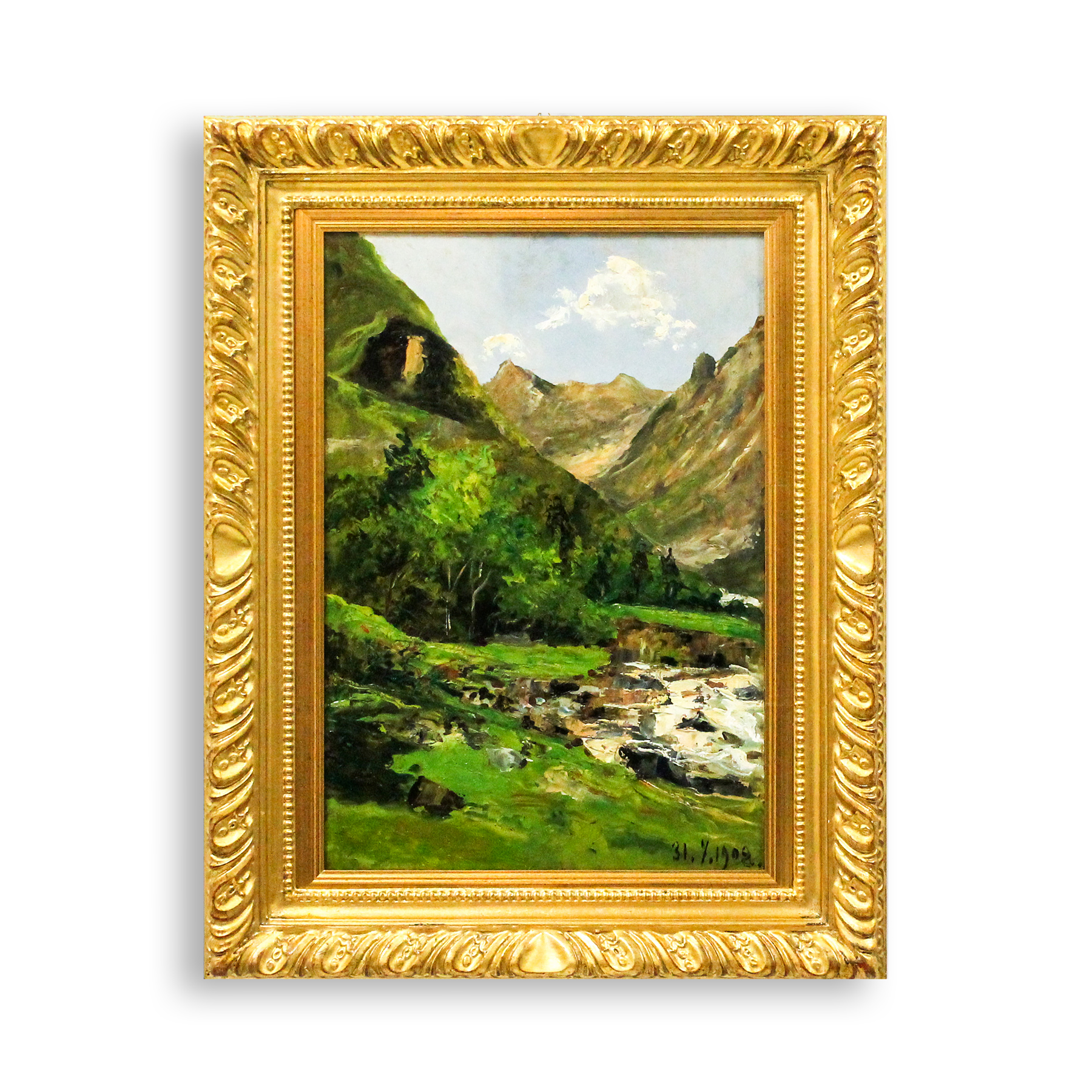 "L’ansa del torrente", di Lorenzo Delleani, olio su tavoletta, 31x45, datato in basso a destra 31.7.1908