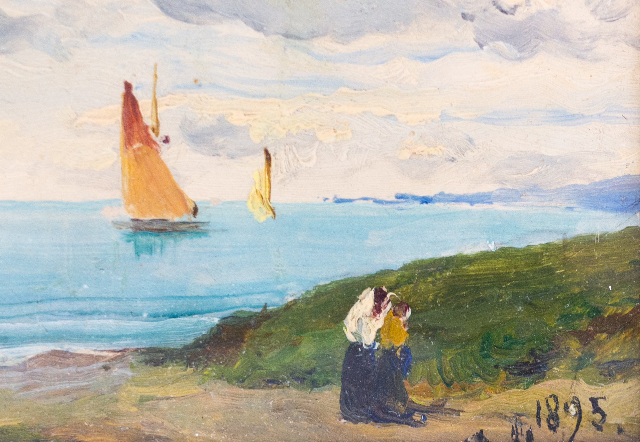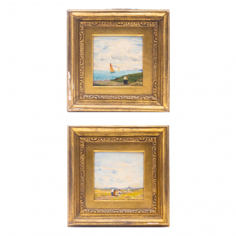 Bella coppia di oli su piastrelle di Lorenzo Delleani, raffiguranti due paesaggi, uno marino e l'altro di campagna.