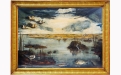 Il dipinto raffigura un’ampia distesa d’acqua circondata da canneti e bassi isolotti. In primo piano si distinguono pesci che nuotano appena sotto la superficie e uccelli acquatici posati tra le sponde fangose. Nel cielo scuro e mosso, un gruppo di anatre vola in formazione verso l’orizzonte, dove si intravede un piccolo borgo dai toni dorati, illuminato da un bagliore che contrasta con le nuvole tempestose.