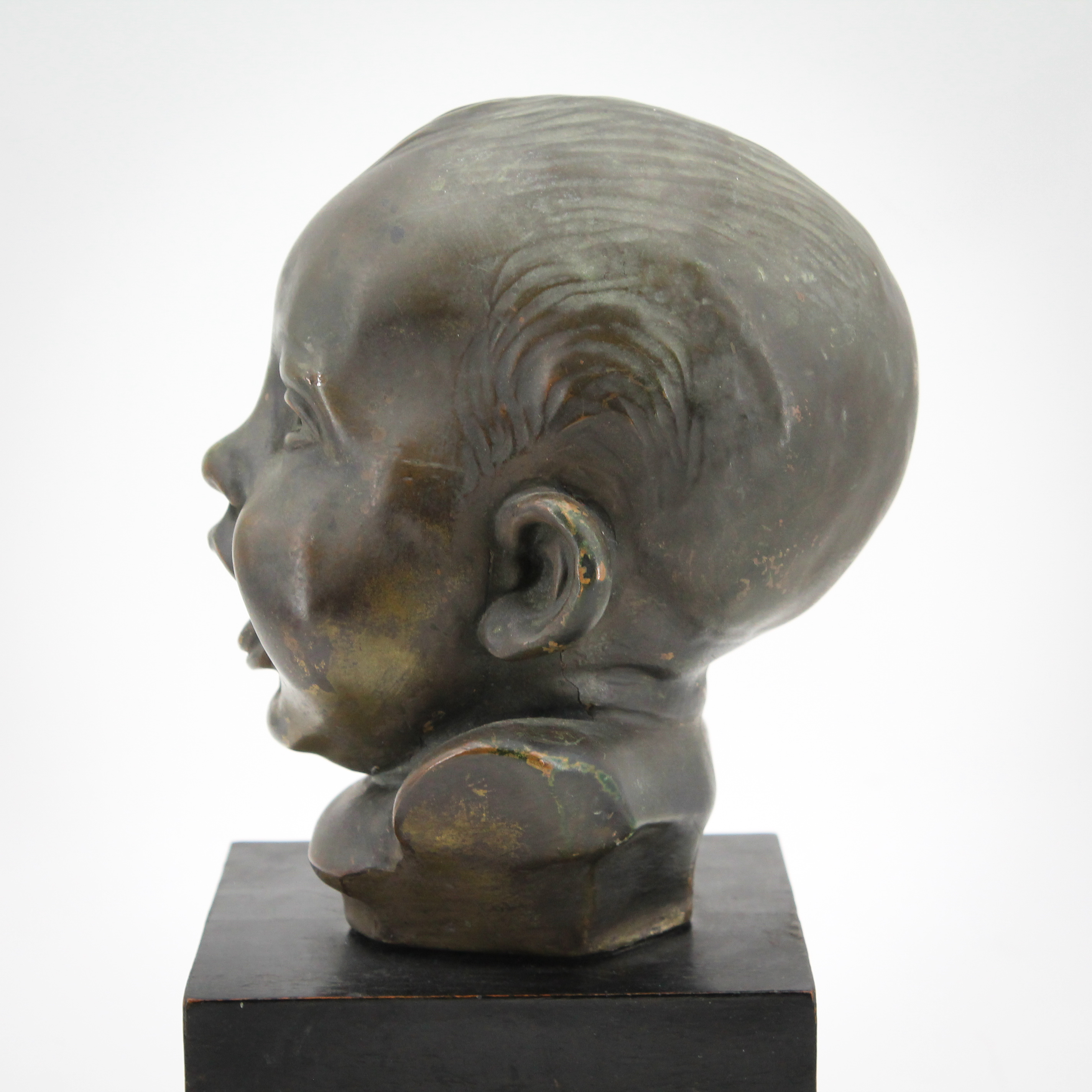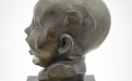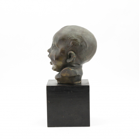 La scultura è in buono stato conservativo, presente firma nella parte posteriore in basso, in terracotta rivestita da foglia di metallo raffigurante "volto di bambino".