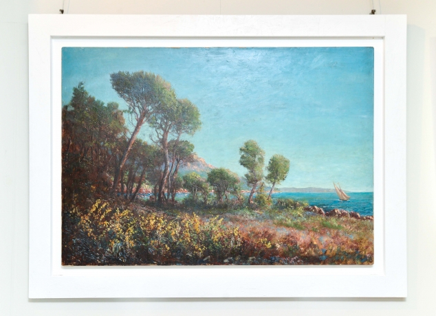 Grande olio su tela di metà '900 raffigurante un paesaggio di mare in Provenza, Francia.