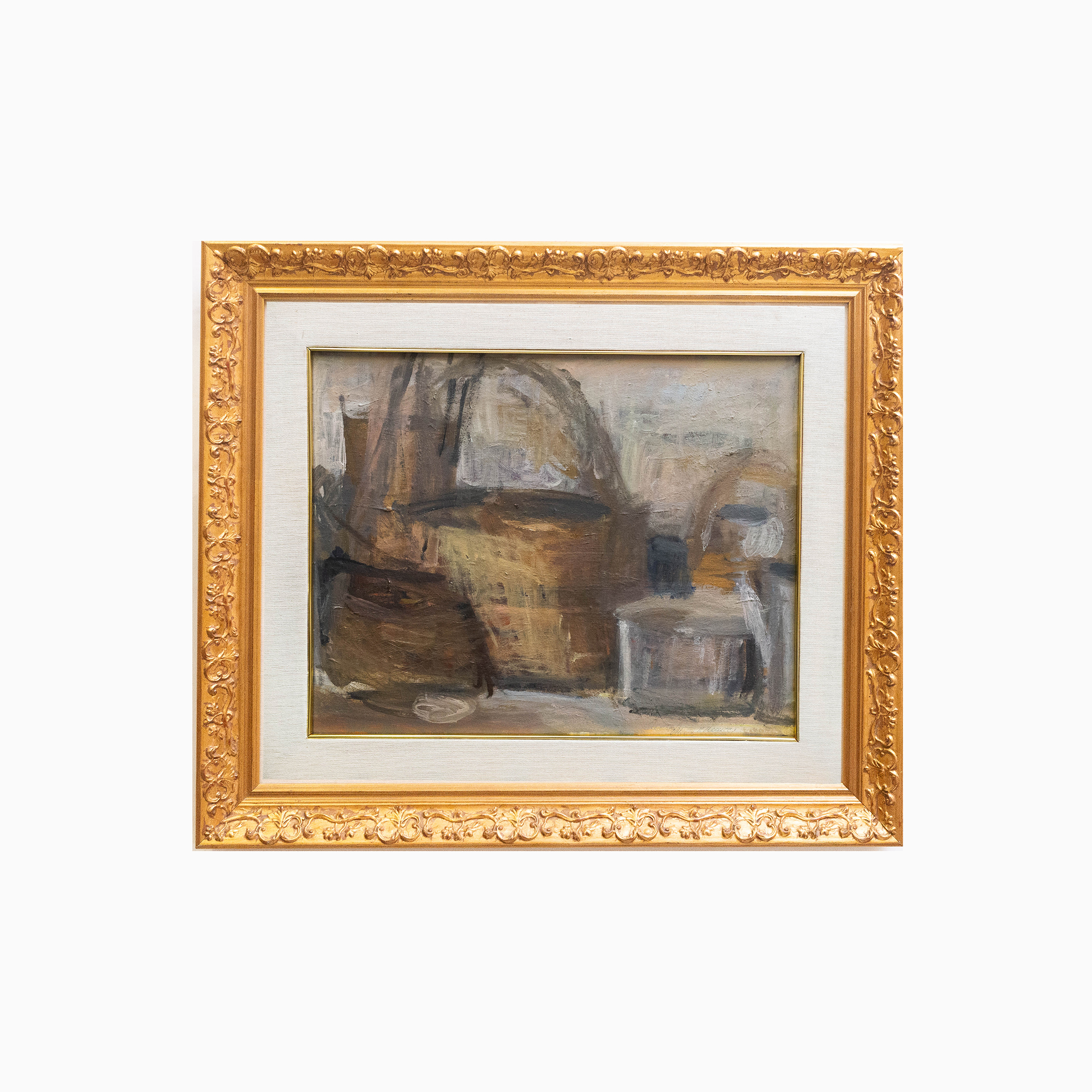 Bel dipinto raffigurante natura morta, tavolo con pentole e pentolini