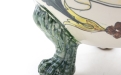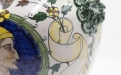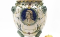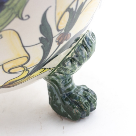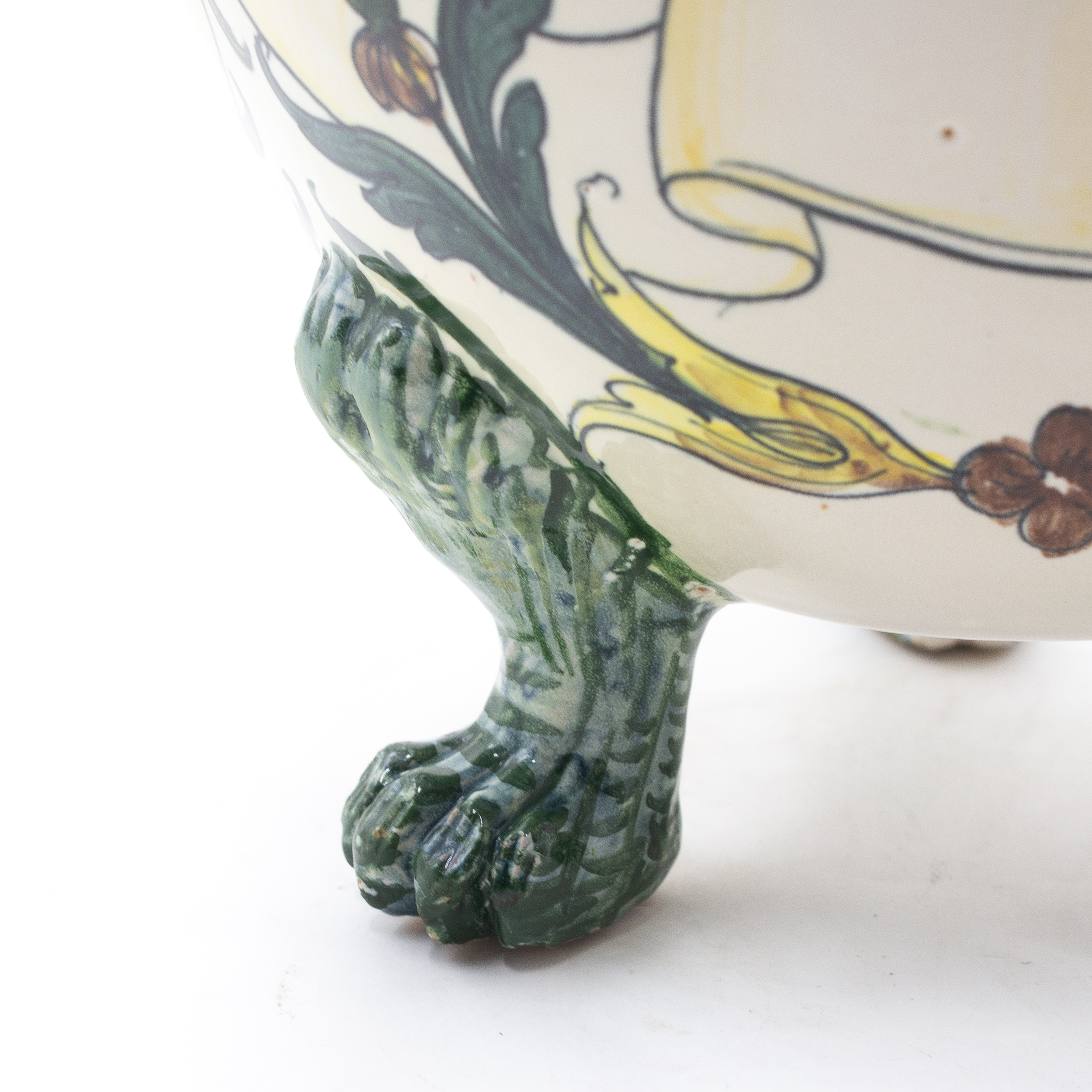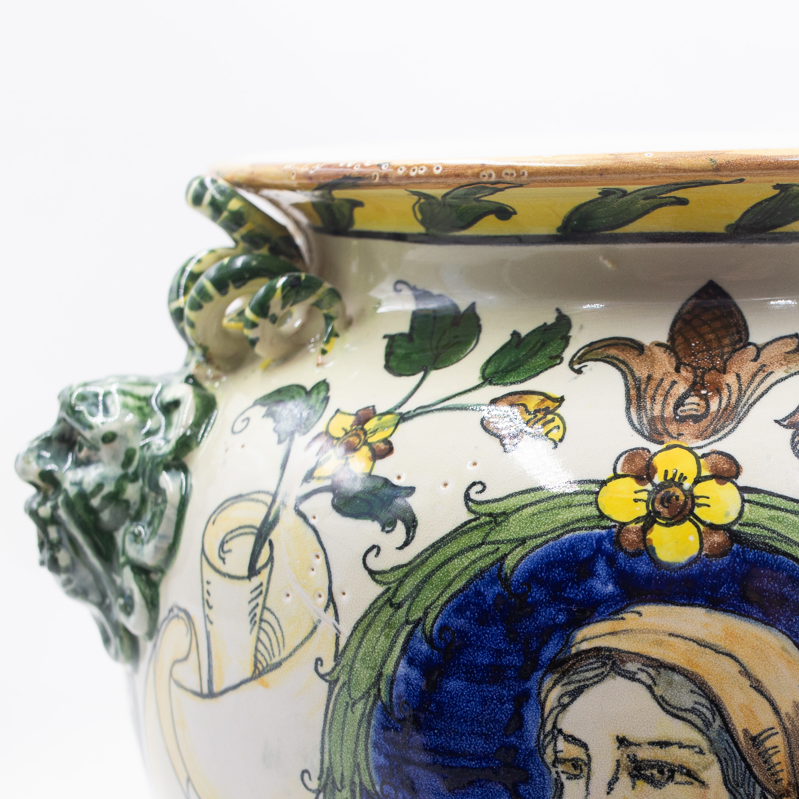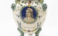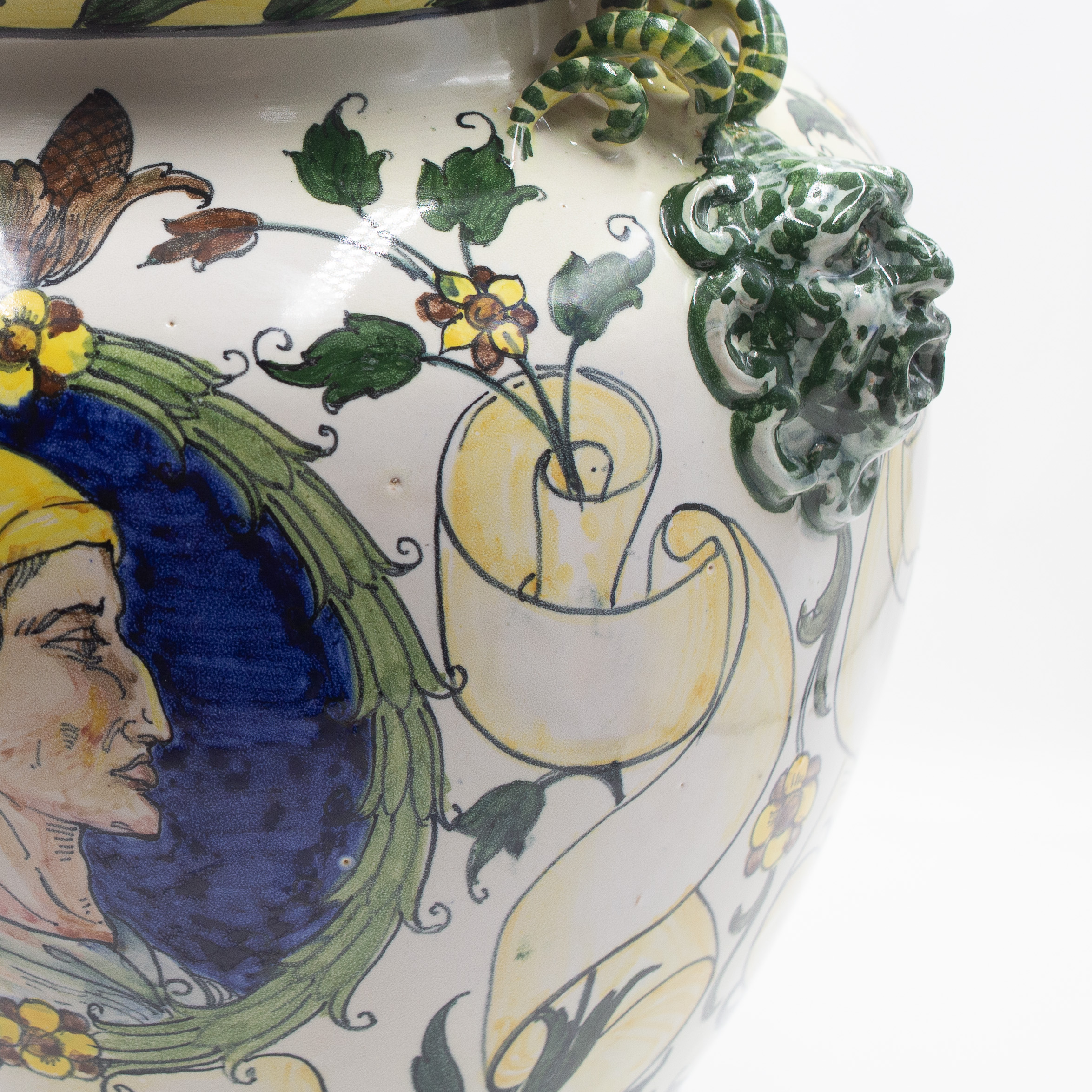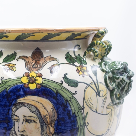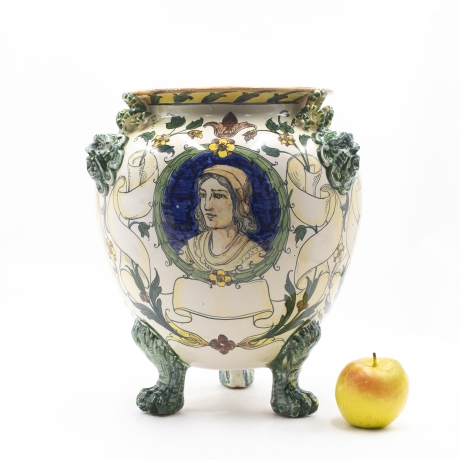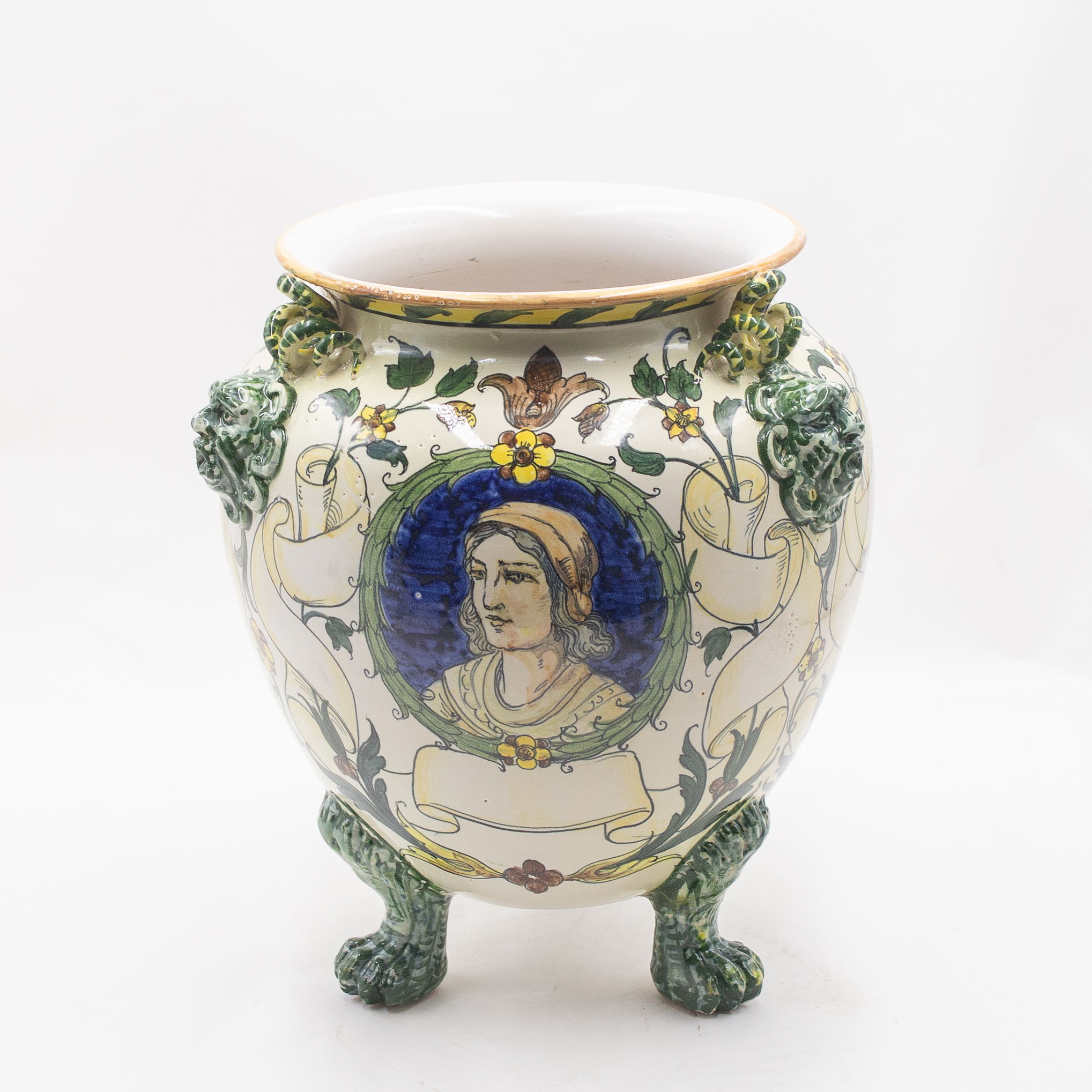 Il vaso presenta corpo globulare sorretto da tre piedi plastici a forma di zampa, anse applicate modellate a mascherone e ricca decorazione policroma. Sul fronte campeggia un medaglione centrale con ritratti, circondato da motivi floreali e nastri svolazzanti.