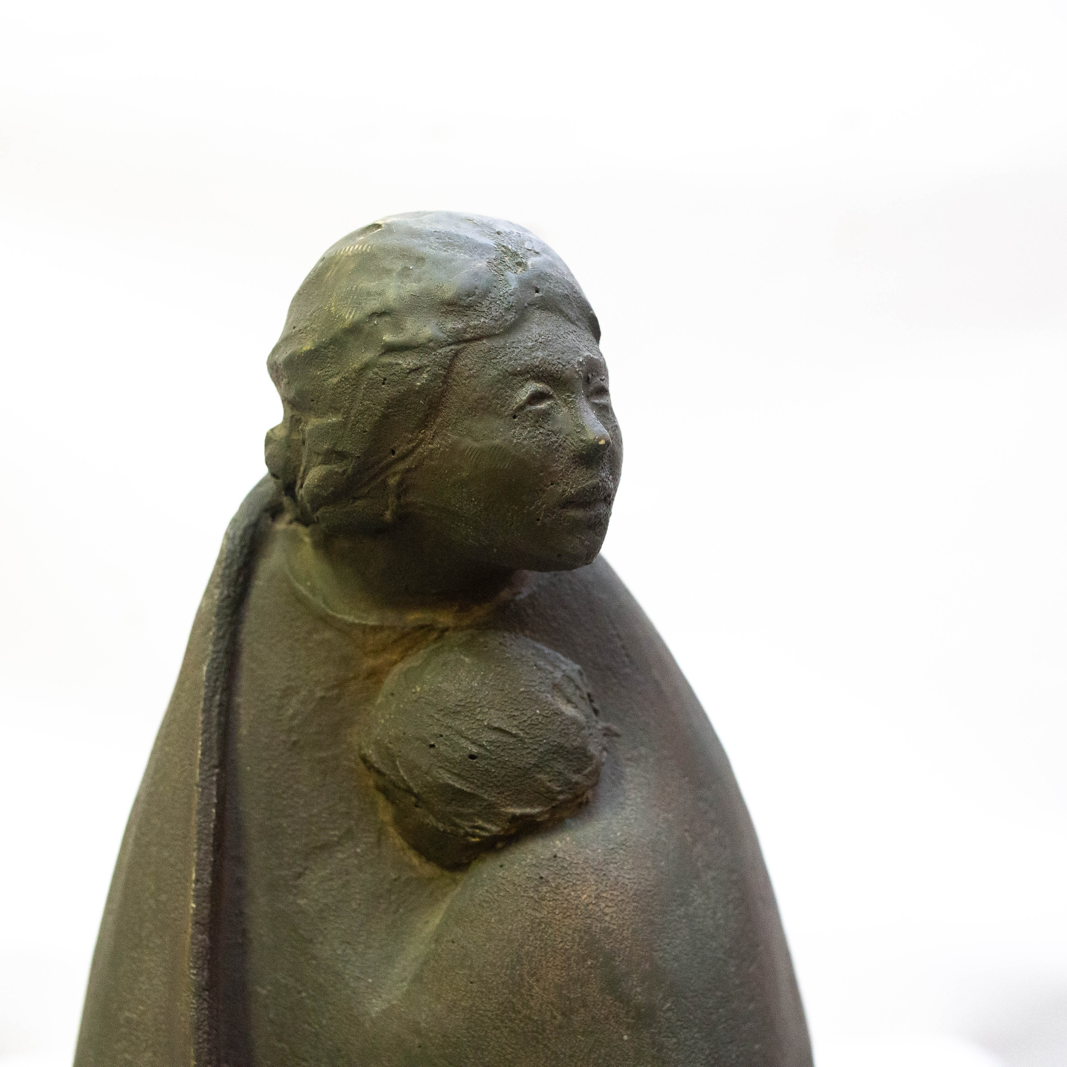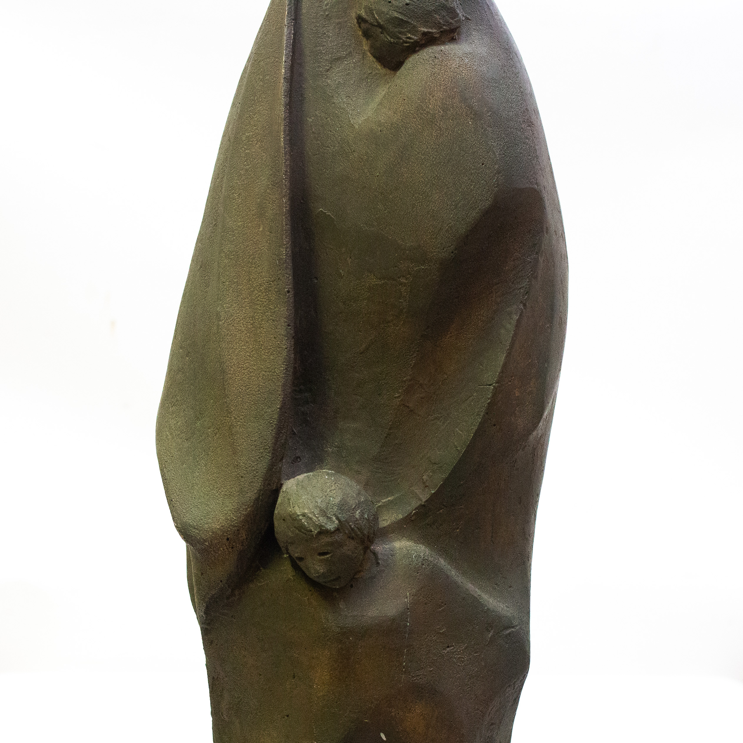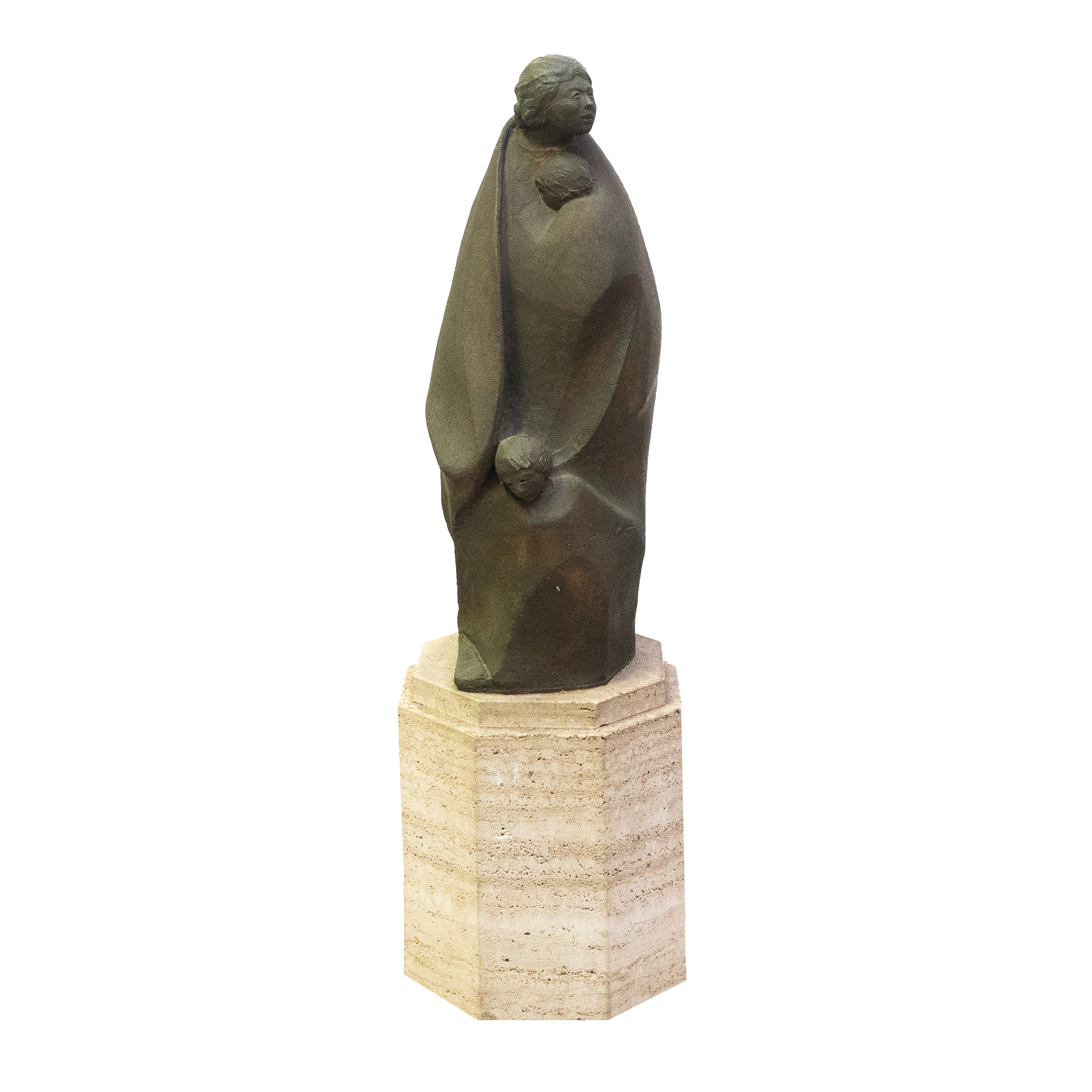Elegante scultura in resina patinata color bronzo raffigurante una Maternità, con madre avvolta in un ampio mantello che accoglie e protegge due bambini. L’opera, dal linguaggio stilizzato e raccolto, rimanda alla poetica plastica di Antonio Martini, interprete di una scultura intimista e solenne, attenta alla forma e alla spiritualità del gesto.