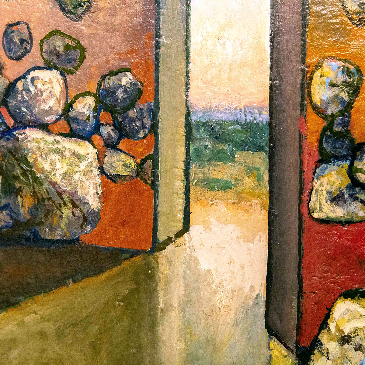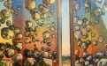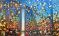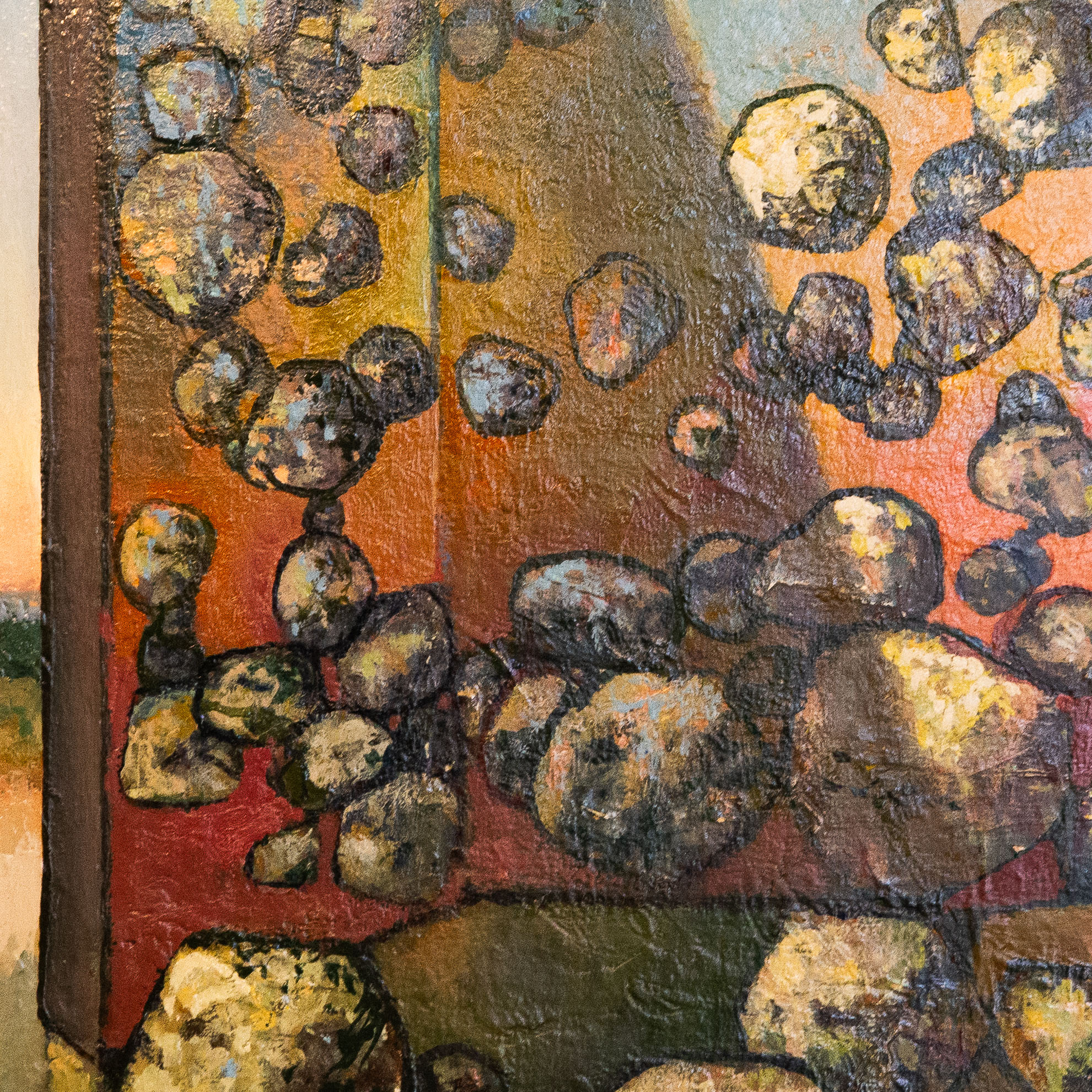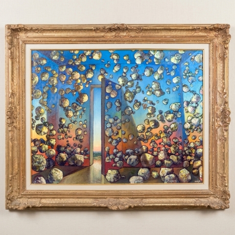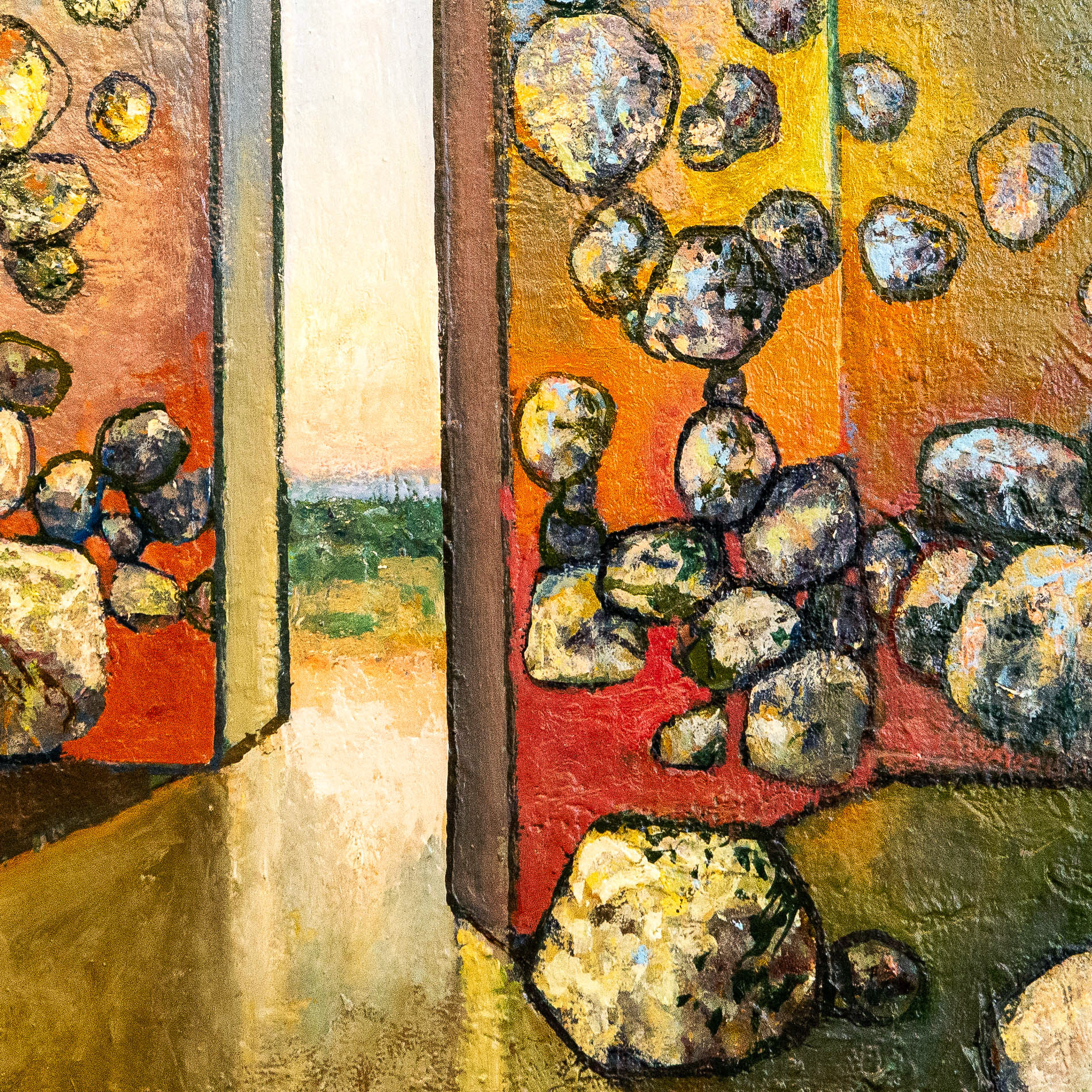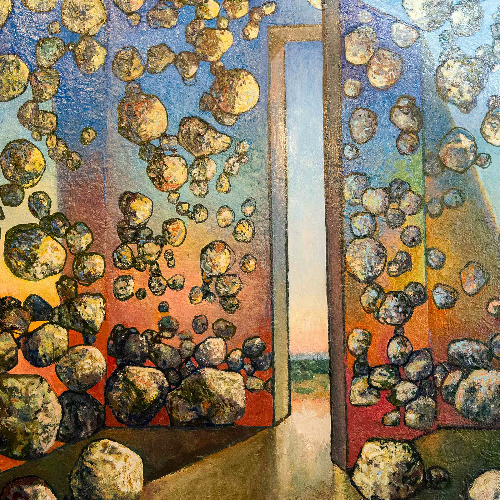 La composizione si articola attorno a una struttura architettonica essenziale: aperture e varchi geometrici si stagliano in un paesaggio irreale, mentre una moltitudine di forme sferoidali e pietrose sembra fluttuare nello spazio, sospesa tra interno ed esterno.