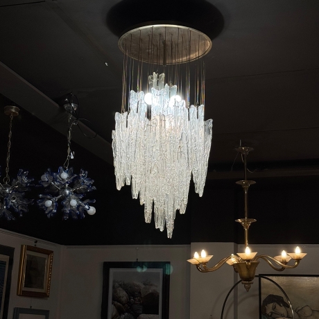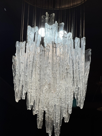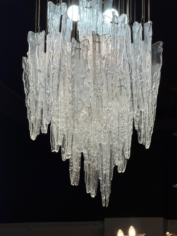 In Vetro di Murano lavorato a mano, con un effetto che ricorda formazioni di ghiaccio o stalattiti.