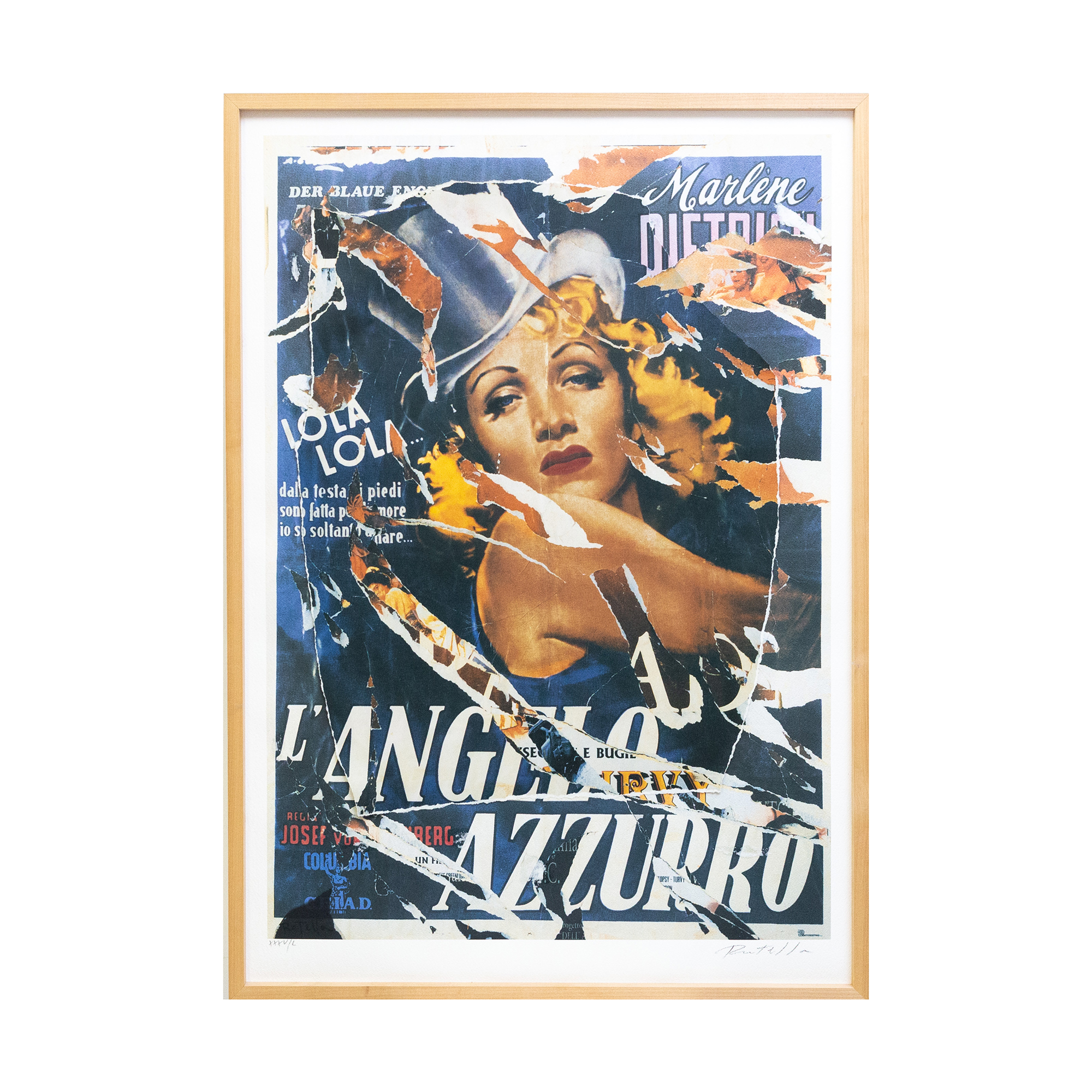 Il seridécollage dell'artista Mimmo Rotella riproduce il manifesto del film "Angelo Azzurro" del 1930 con Emil Jannings, Marlene Dietrich, Kurt Gerron diretto da Josef von Sternberg. Gli strappi fatti a mano dall'artista rendono unico ogni esemplare.