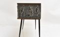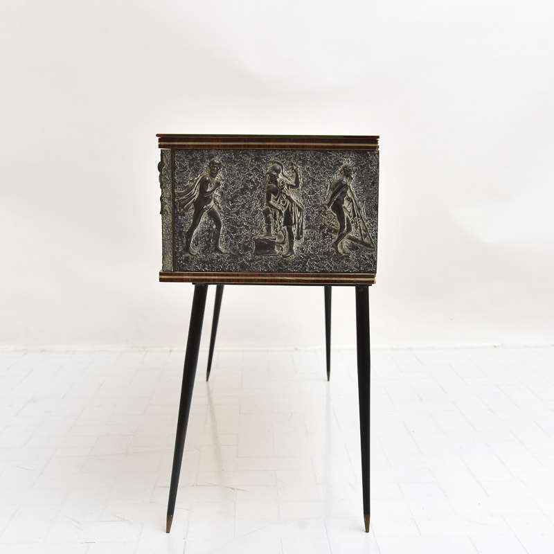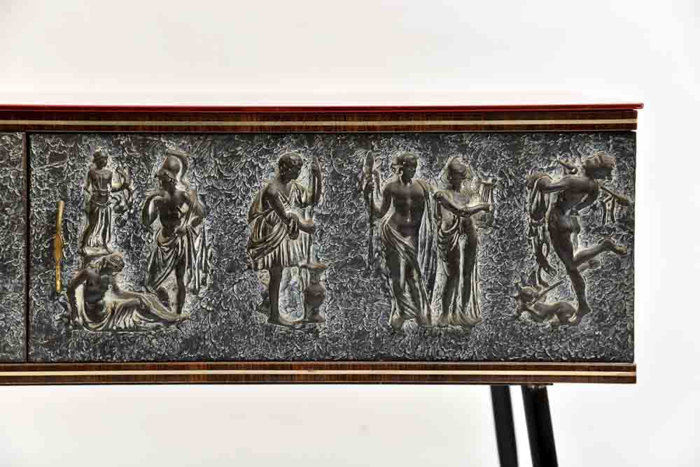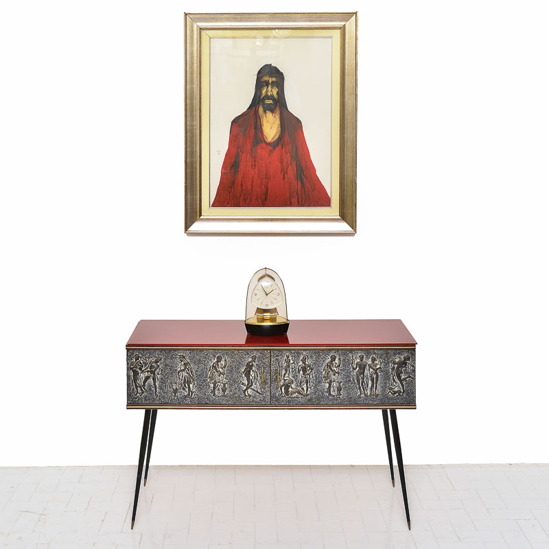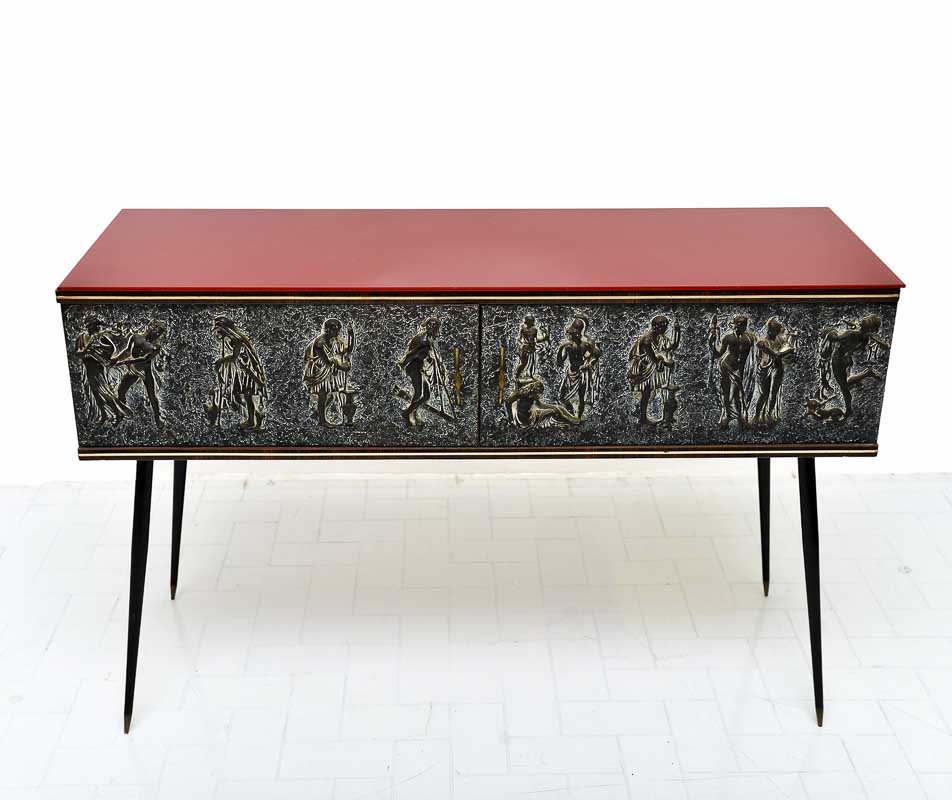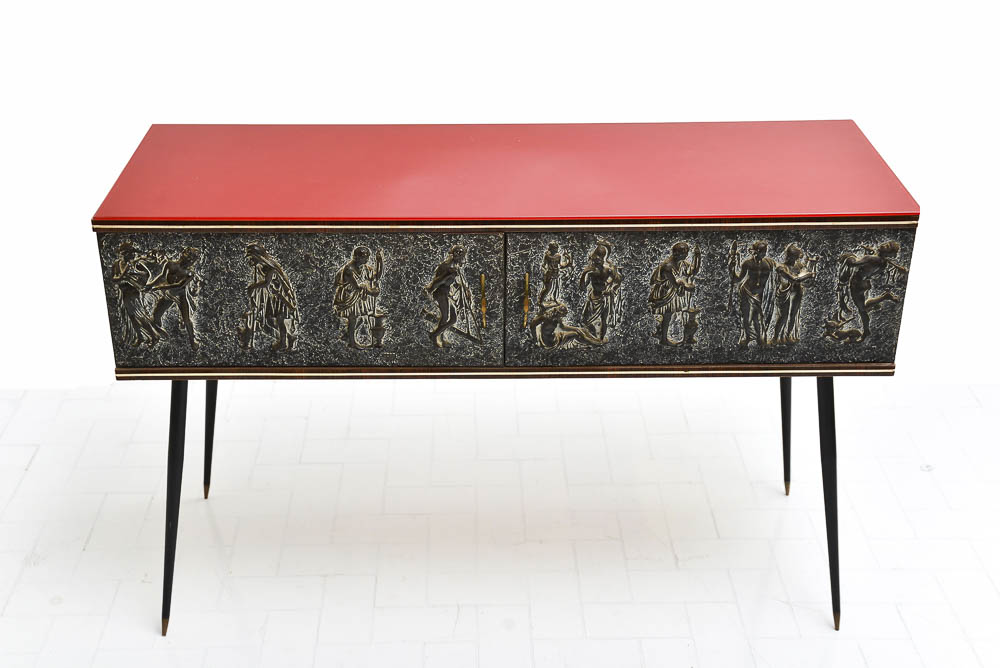 Mobiletto anni '50 con top in vetro rosso e antine con bassorilievo in resina. Ottime condizioni.
