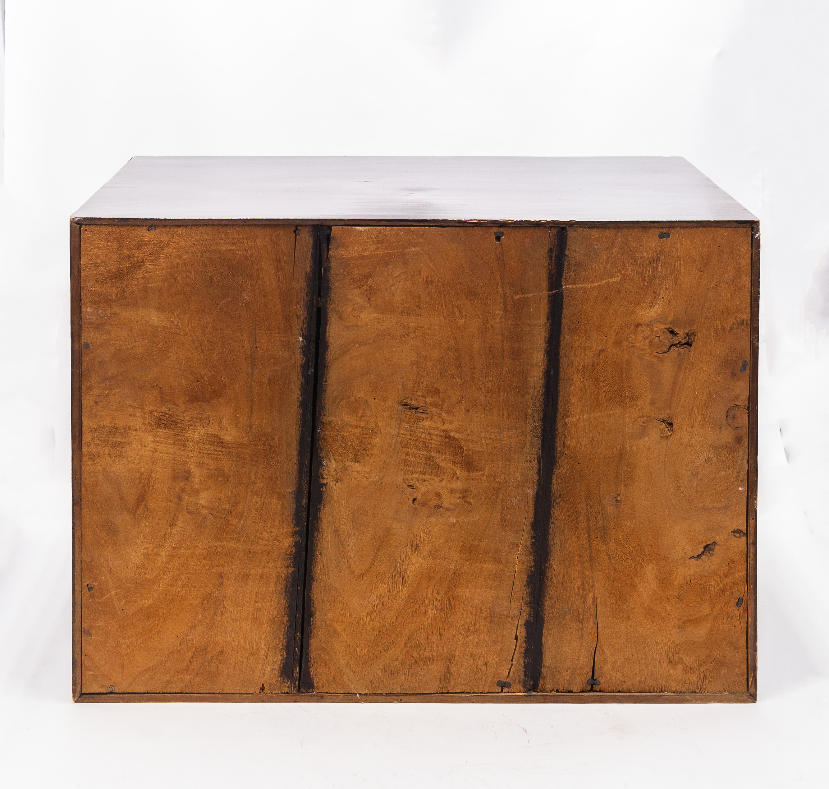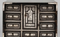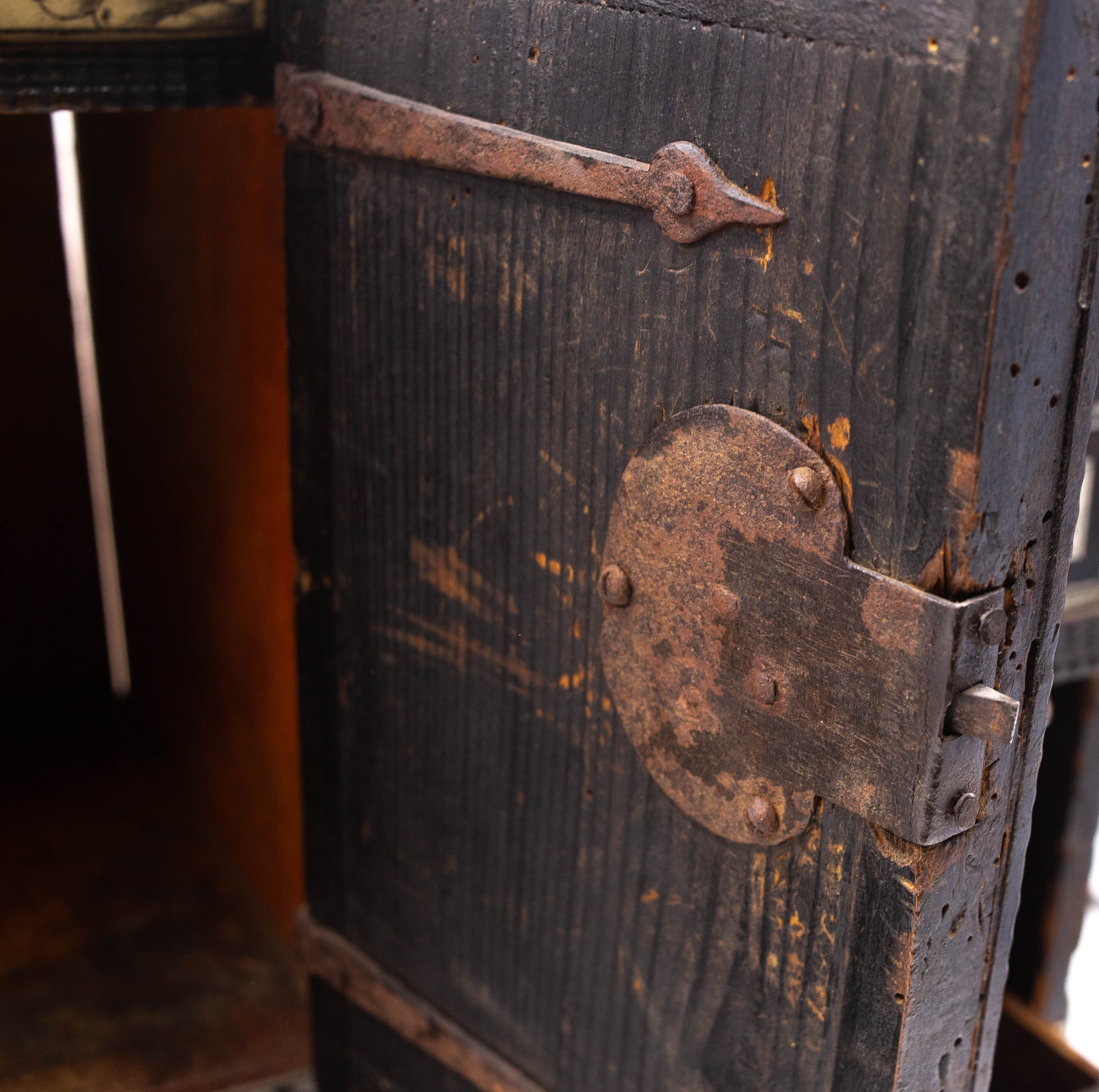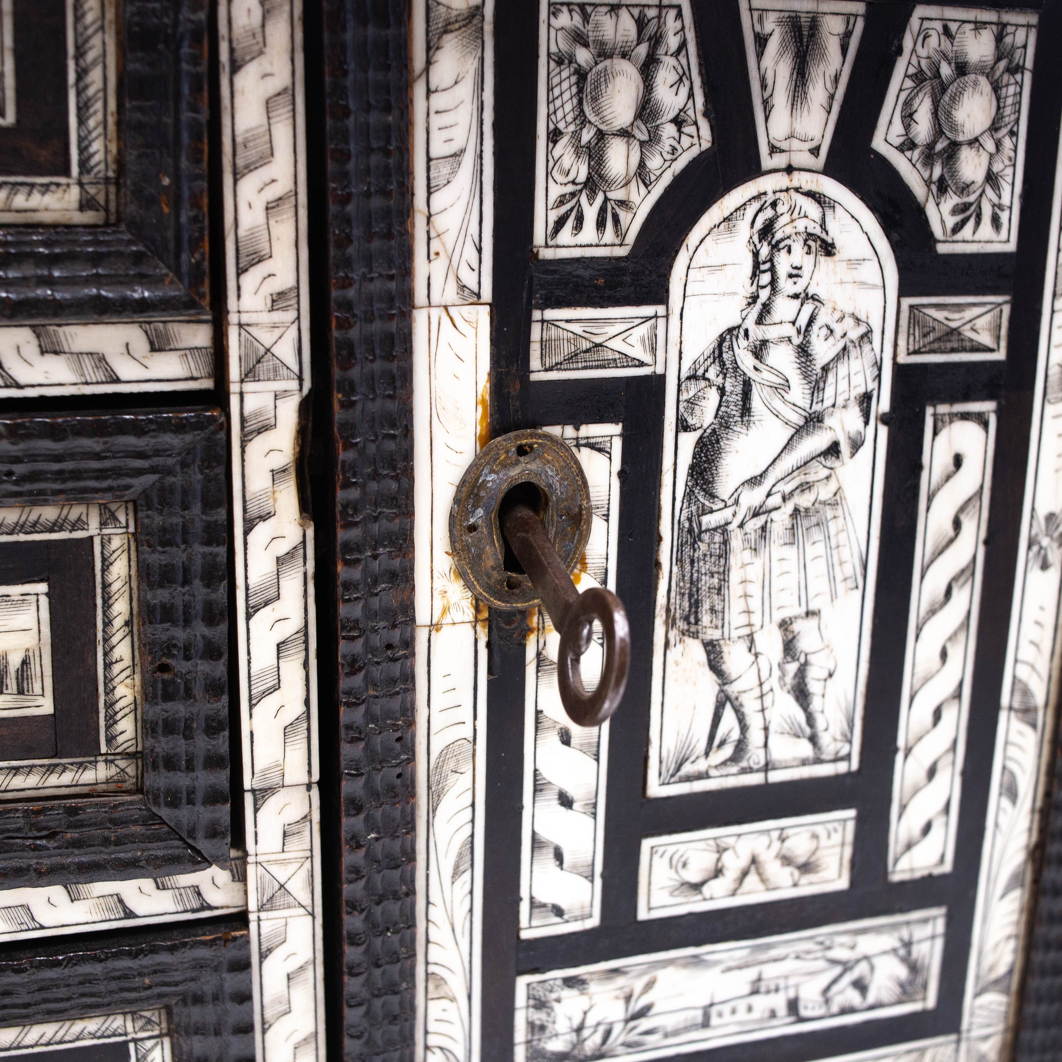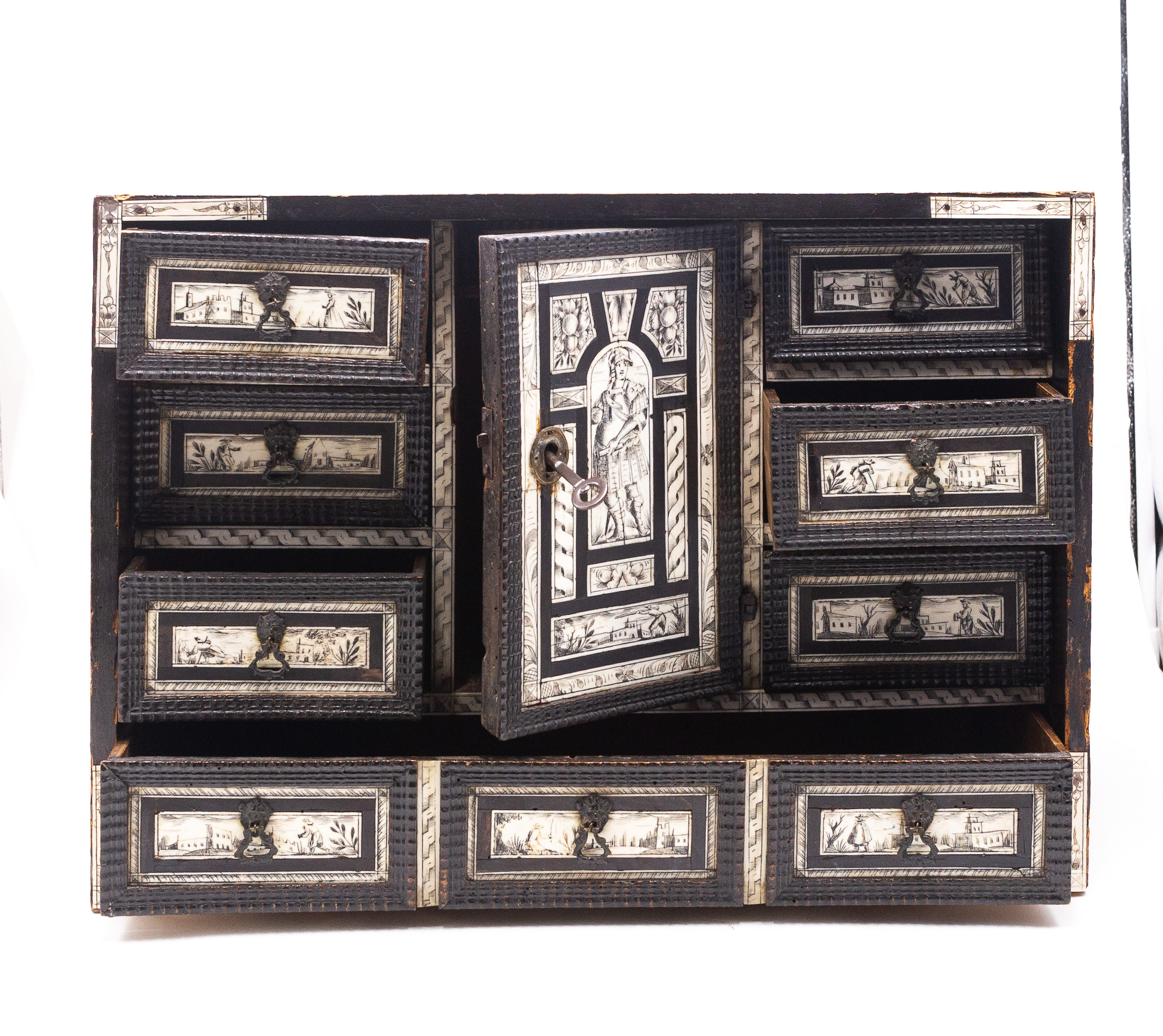 Lo sportello centrale cela un ulteriore vano, caratteristica frequente nei mobili da collezione del Seicento.
