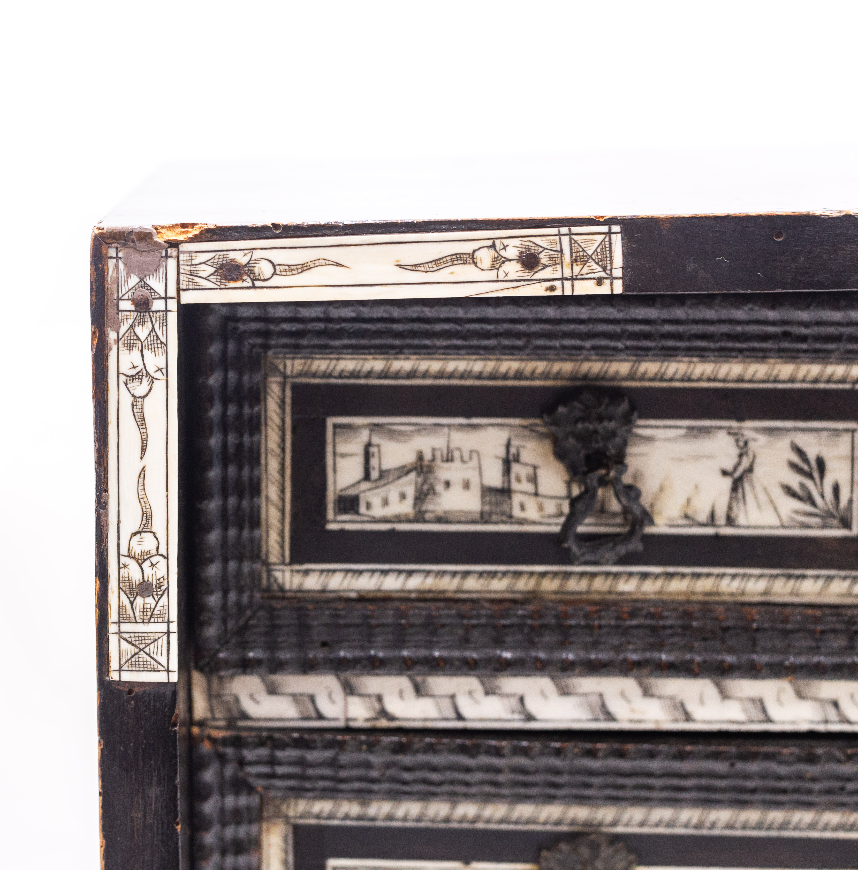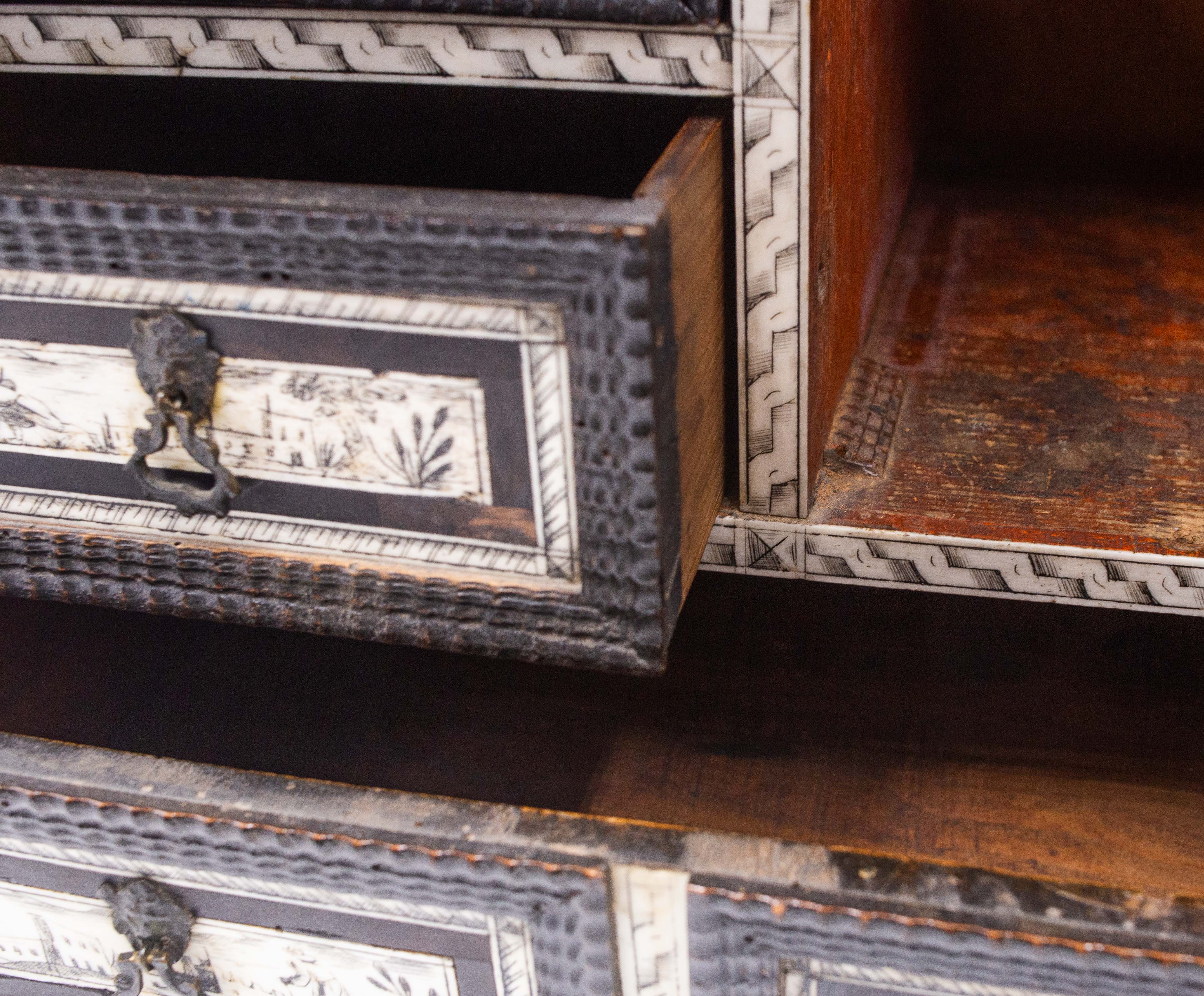 La tecnica decorativa è quella tipica dei monetieri italiani o ispano-italiani del XVII secolo, dove pannelli chiari incisi venivano inseriti in una struttura scura per creare contrasti molto eleganti.