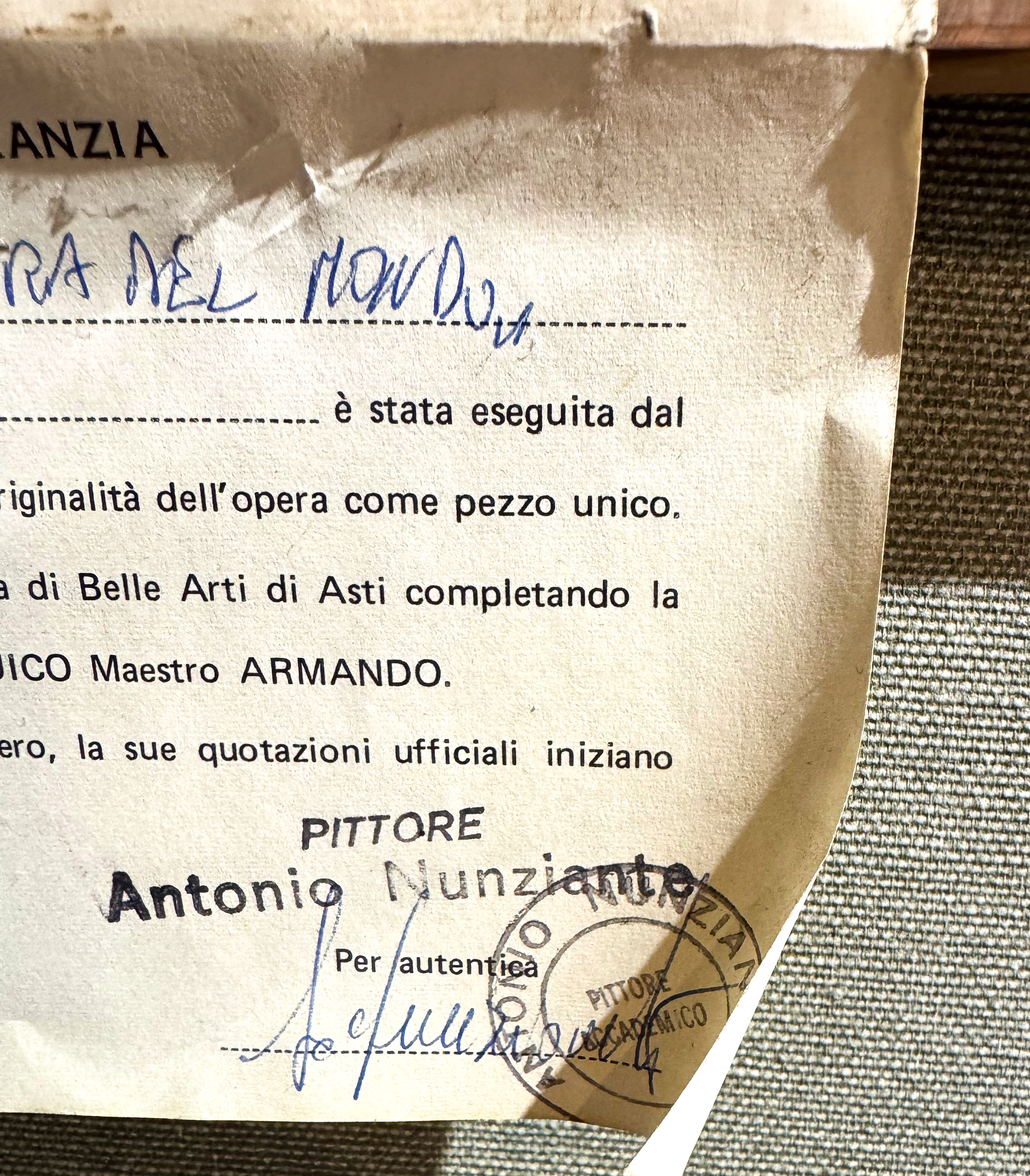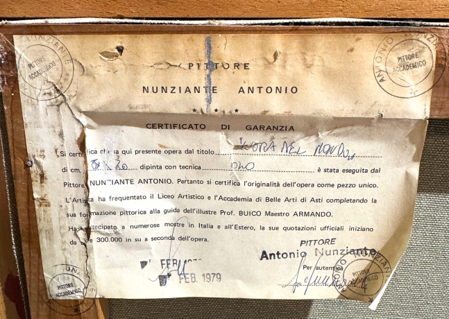 etichetta di autenticità con firma e timbro Antonio Nunziante