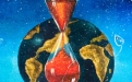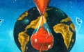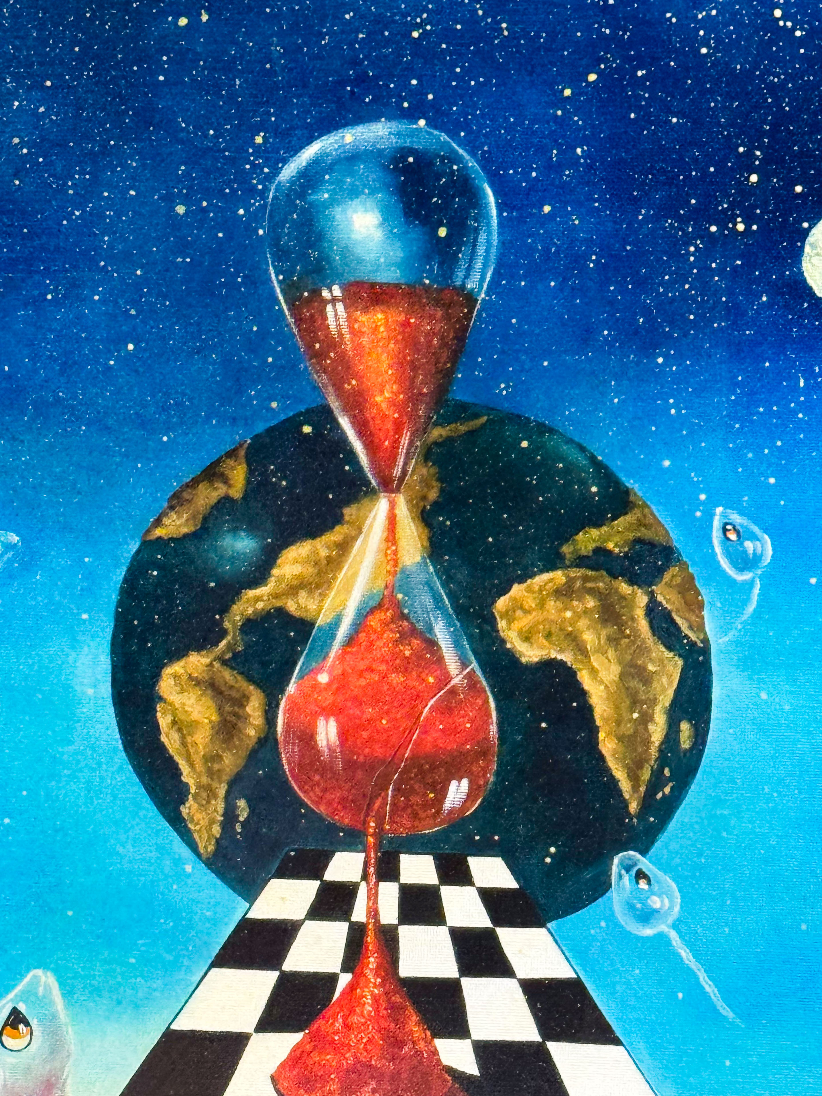 La composizione è dominata da una clessidra sospesa, elemento centrale e ricorrente nell’iconografia di Nunziante, qui posta davanti a un globo terrestre che sembra fluttuare in uno spazio cosmico. La sabbia rossa che scorre all’interno della clessidra diviene metafora del tempo universale, del destino e della fragilità dell’equilibrio umano.