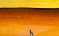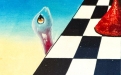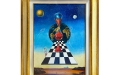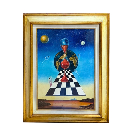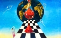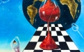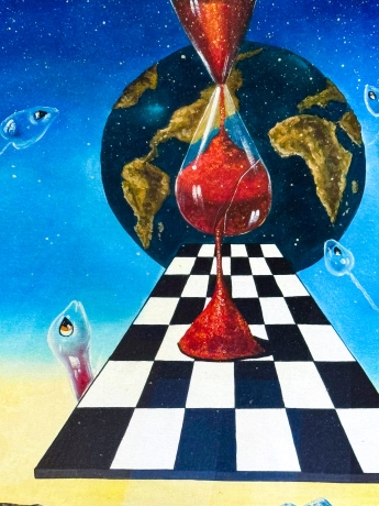Sotto la clessidra si sviluppa una scacchiera in prospettiva, simbolo del gioco della vita, delle scelte e delle strategie dell’esistenza, che guida lo sguardo verso un paesaggio silenzioso e sospeso, tipico dell’artista: una distesa d’acqua calma, terre lontane e un orizzonte rarefatto, immersi in una luce crepuscolare.