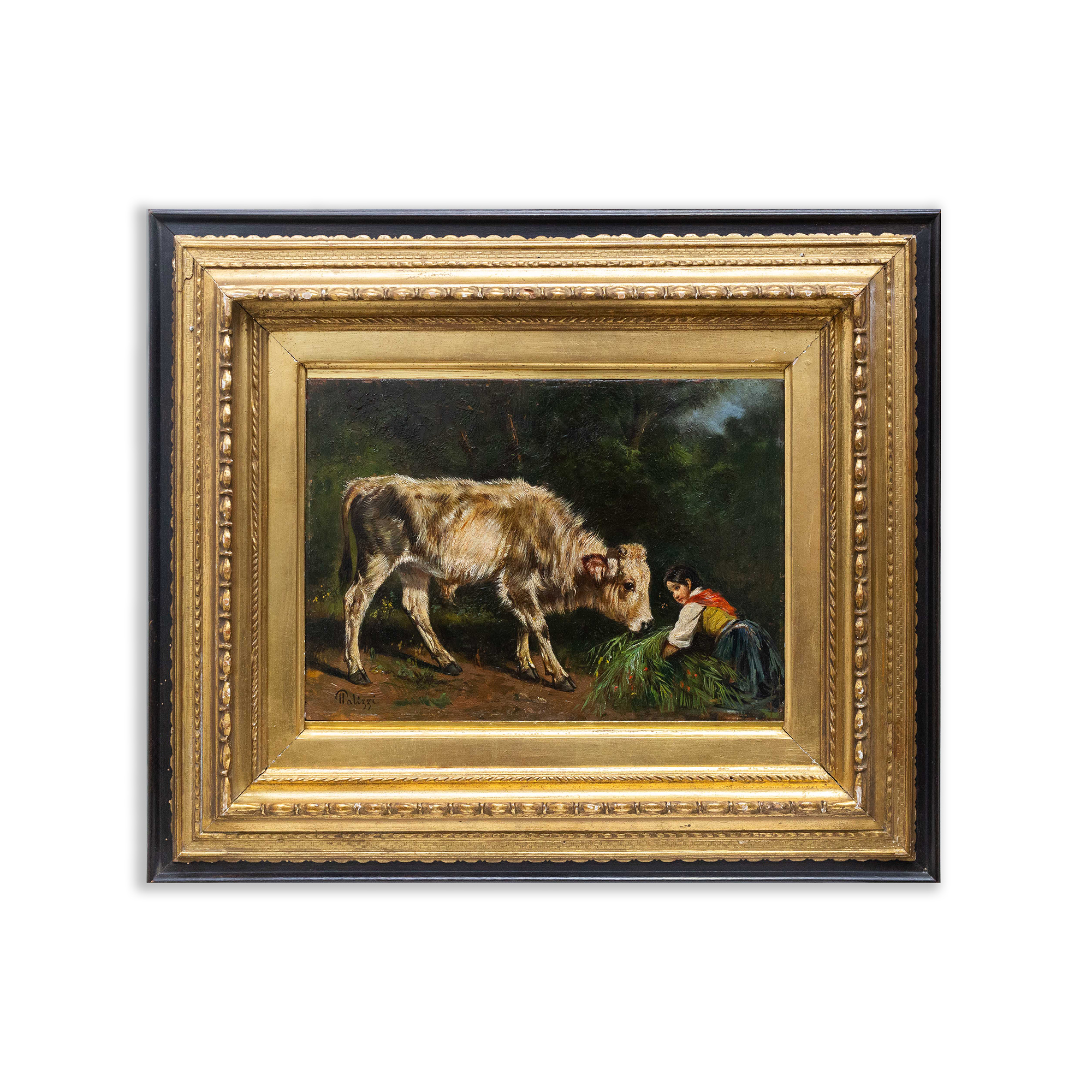 Palizzi, olio su tavola, "Contadinella e vitellino", firmato, Epoca '800