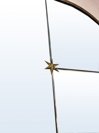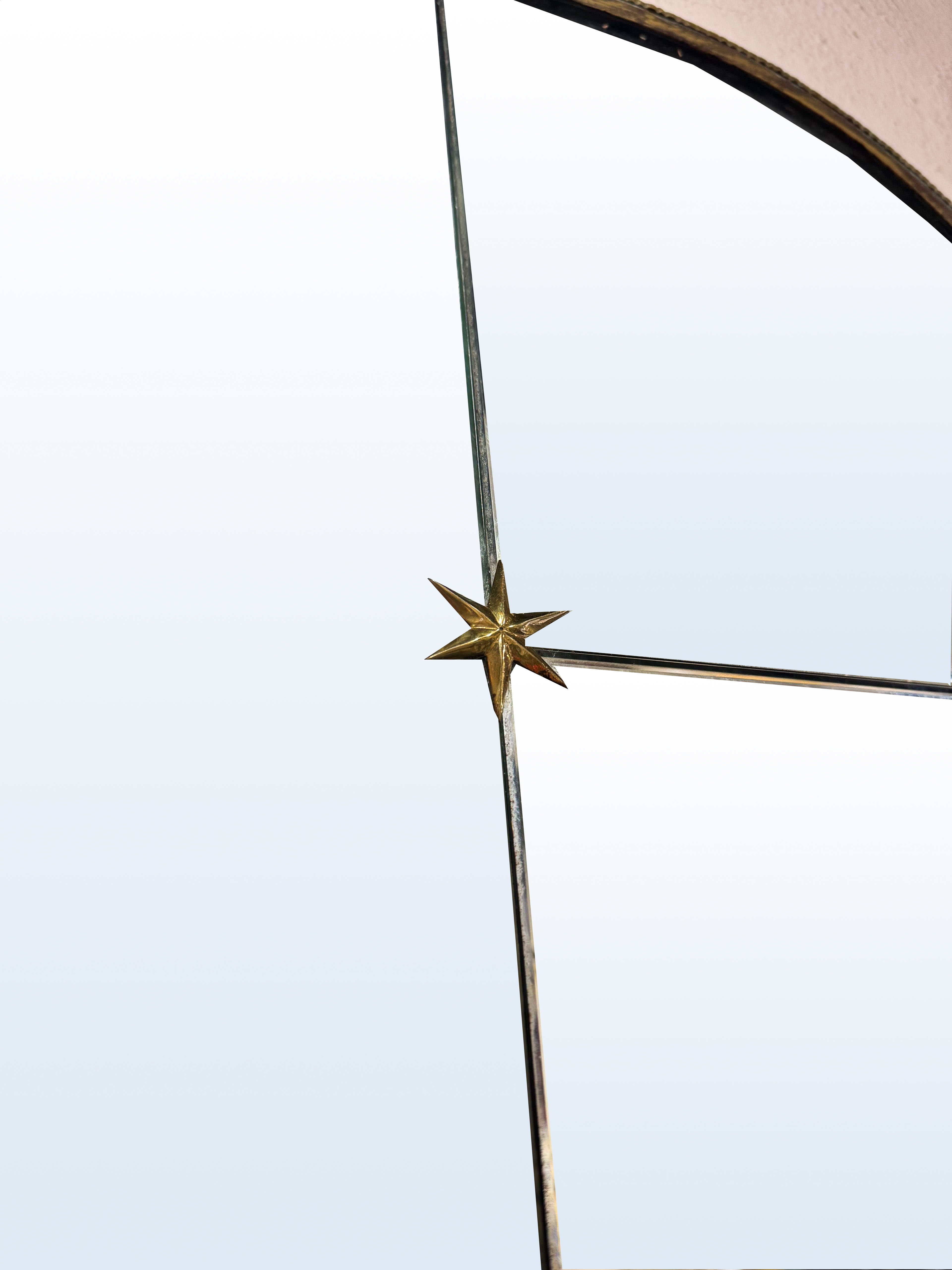 Lo specchio, di ampie dimensioni, è incorniciato da un sottile profilo in metallo coordinato alla consolle. La superficie è scandita da eleganti incisioni lineari e impreziosita da piccoli dettagli decorativi a forma di stella, che richiamano il linguaggio ornamentale dell’epoca.