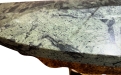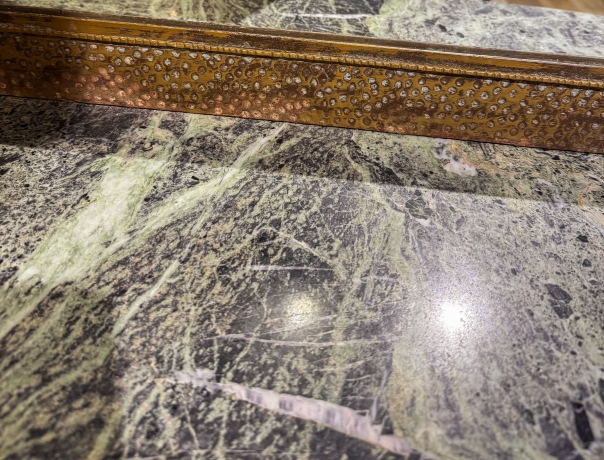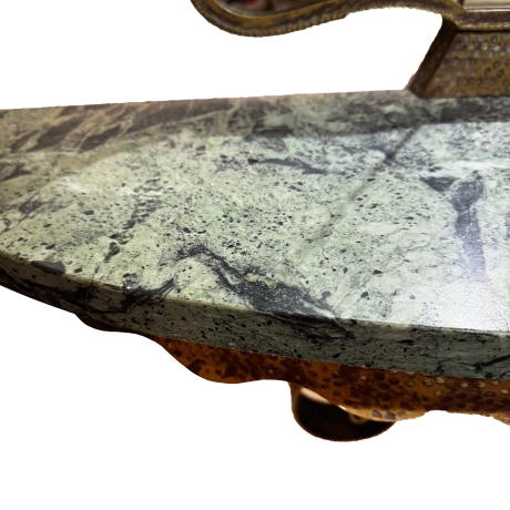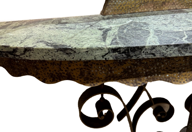 Il piano è realizzato in marmo verde venato, con bordo sagomato e profilo leggermente ondulato, che aggiunge movimento e ricercatezza. Il marmo, con le sue naturali sfumature, crea un piacevole contrasto con la struttura metallica.