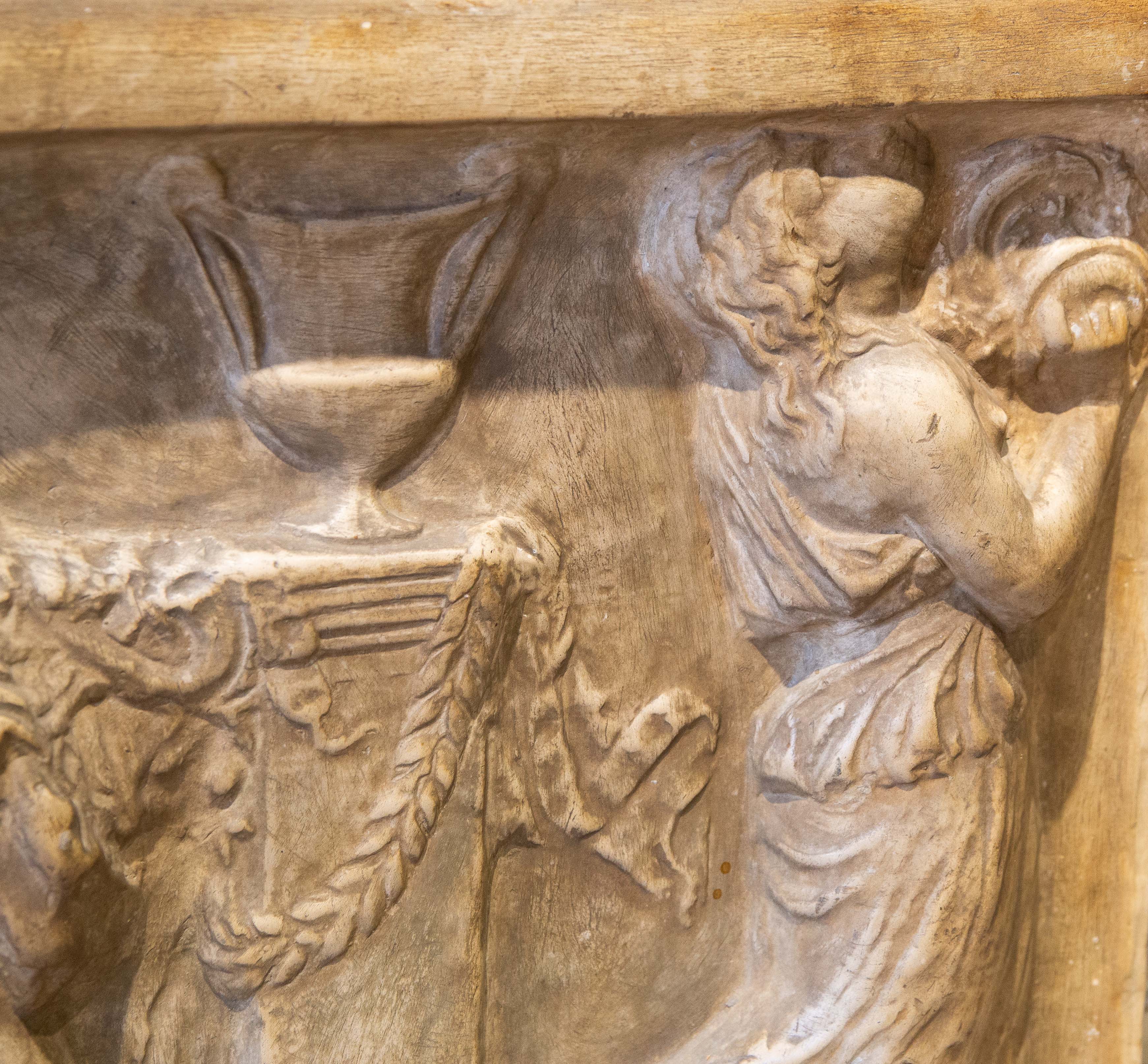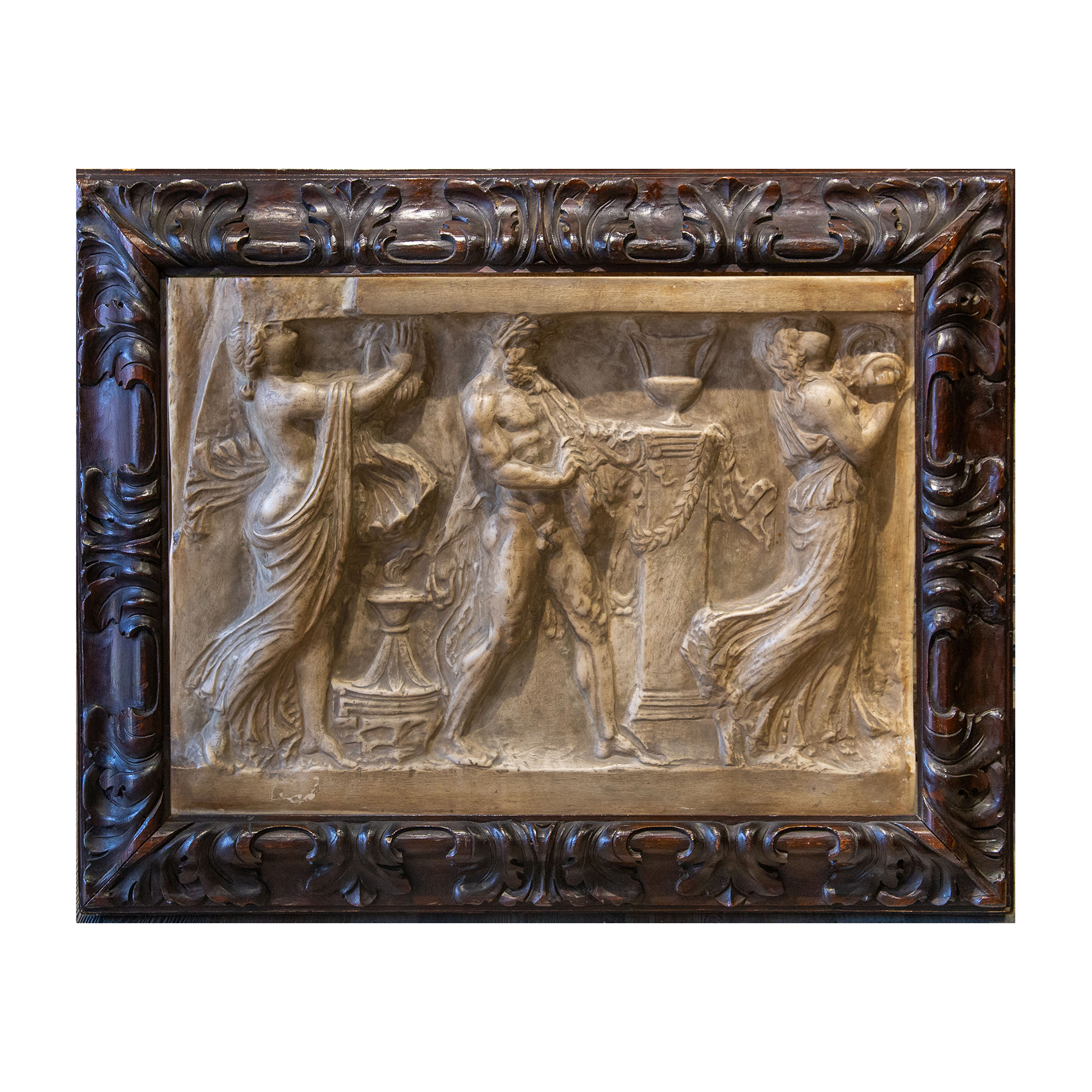 La superficie della pietra, morbida e luminosa, esalta i volumi e i chiaroscuri, conferendo profondità e vibrazione all’insieme. La cornice lignea scolpita, riccamente decorata, incornicia l’opera con eleganza, sottolineandone il carattere decorativo e collezionistico.