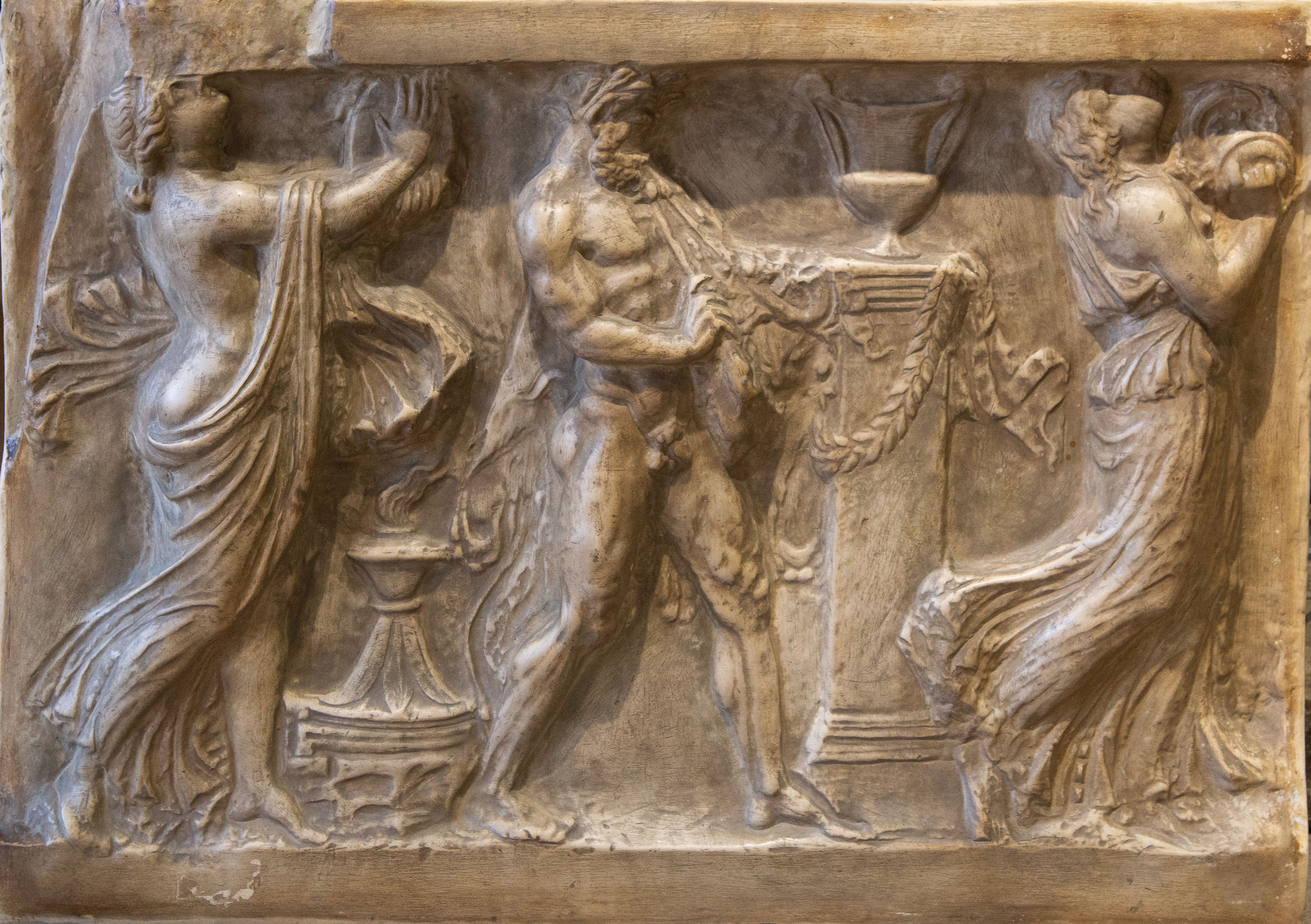Al centro della scena, un satiro, colto nell’atto di suonare l’aulos, diviene fulcro dinamico dell’intero racconto: la musica invisibile sembra propagarsi nello spazio, animando le due menadi che lo affiancano. Le figure femminili, avvolte in panneggi mossi e leggeri, sono rese con una grazia fluida che richiama modelli classici, mentre le loro pose suggeriscono una danza estatica, abbandonata all’ebbrezza del rito.