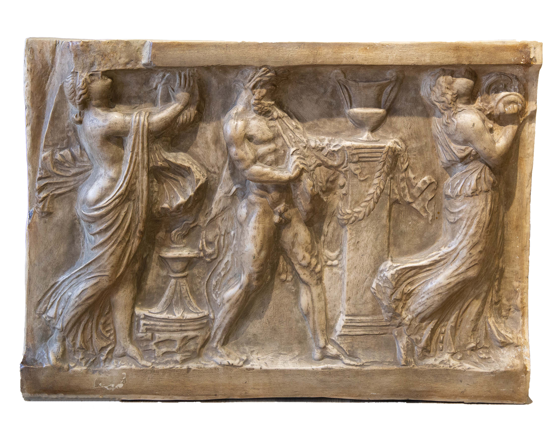 Suggestivo bassorilievo di gusto neoclassico, L’Eco di Dioniso traduce in forma plastica il fascino intramontabile del mito antico, evocando un rituale dionisiaco sospeso tra armonia e trasporto sensoriale. Realizzata in Pietra di Signa, la composizione si distingue per la finezza dell’intaglio e per la capacità di rendere movimento e ritmo attraverso la tridimensionalità della superficie scolpita.