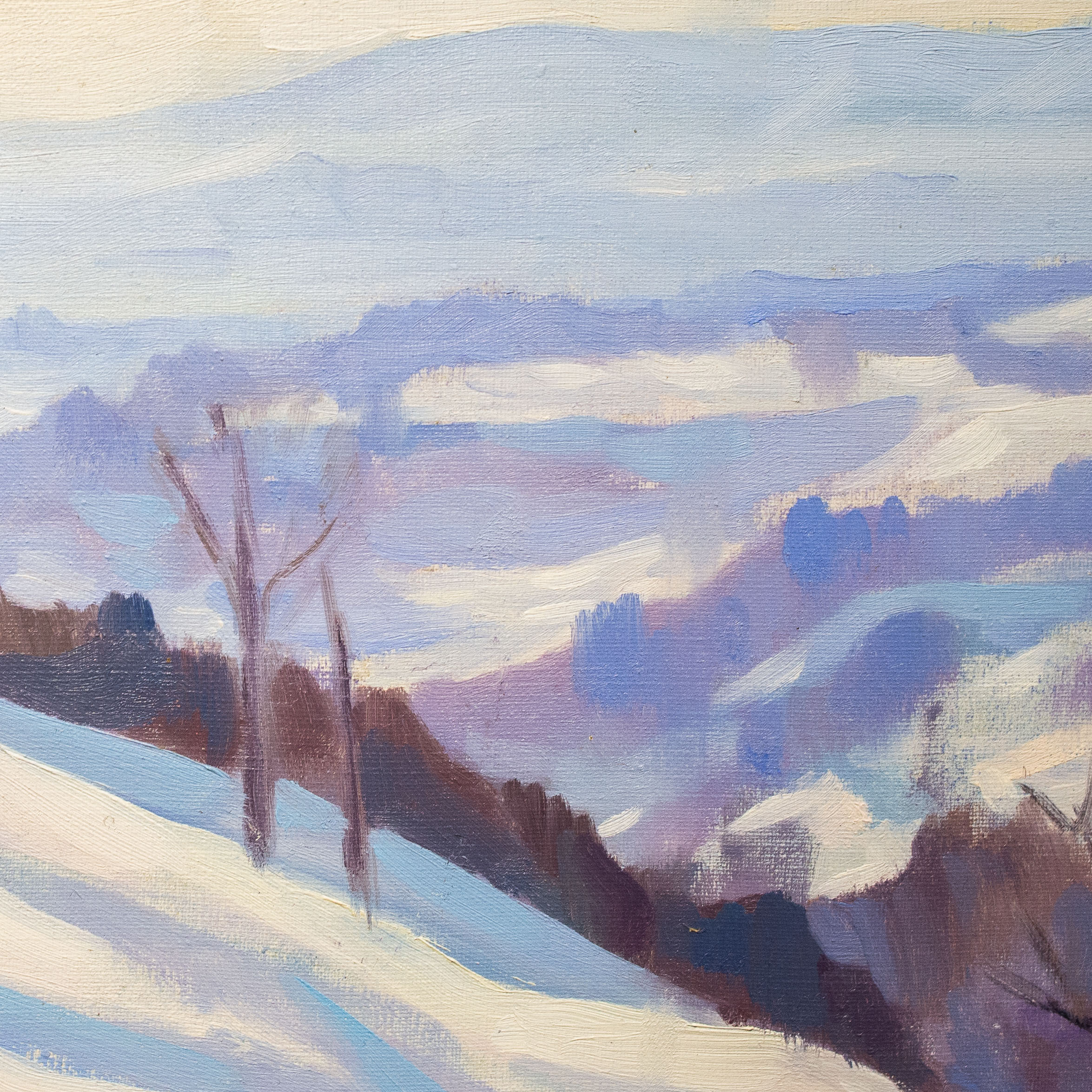 Cromatismo: La tavolozza è dominata dai toni freddi e luminosi tipici dell'inverno. I bianchi della neve sono ricchi di sfumature azzurre, indaco e violette, utilizzate per rendere le ombre e i volumi dei crinali. Il cielo è di un azzurro tenue, sereno, che contribuisce alla sensazione di quiete e silenzio dell'opera.