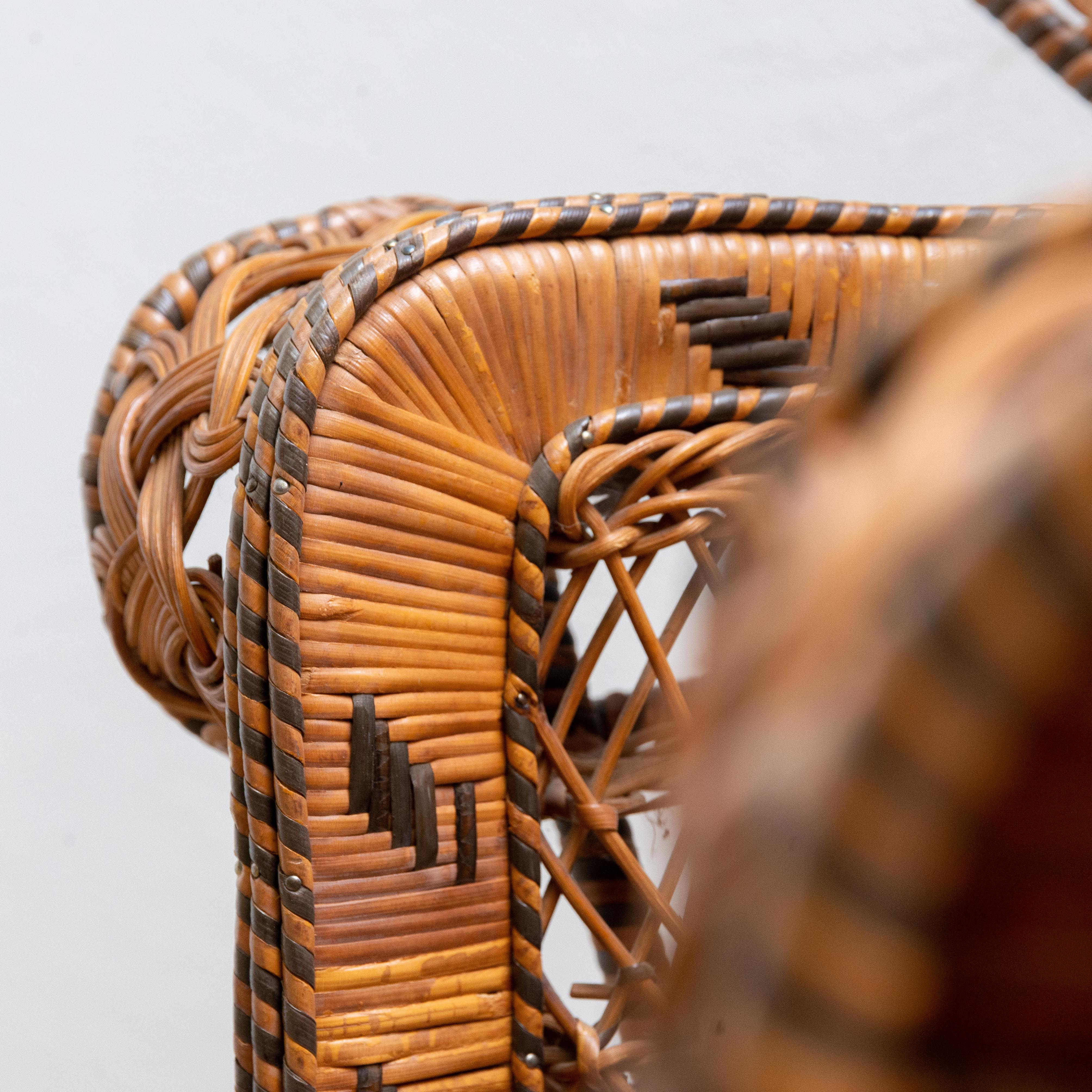 Poltrona Emmanuelle Pavone in vimini. Prodotta dalla famosa azienda francese Kok Maison, e pubblicizzata in un film degli anni '70 che porta lo stesso nome, Emmanuelle. La sedia si presenta in buone condizioni anche se sono presenti alcune rotture nella trama dello schienale e nel rivestimento di una delle aste di supporto sul retro.