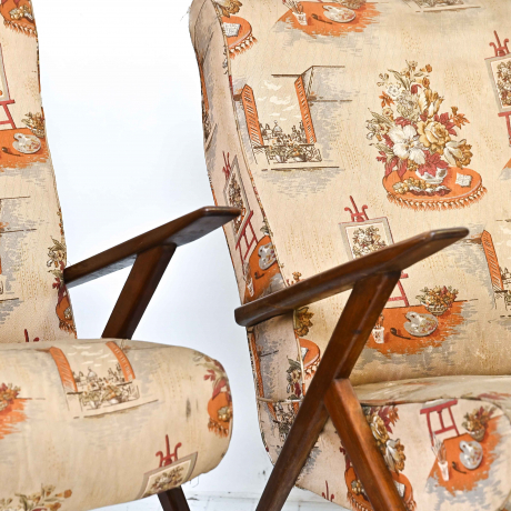Coppia di poltrone anni '50 di produzione italiana. Le poltrone sono in ottime condizioni, e hanno la loro stoffa originale.