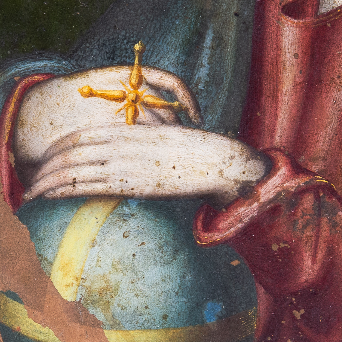 L’iconografia classica ritrae il Cristo con lo sguardo solenne, circondato da un’ampia aureola a raggiera finemente cesellata, mentre regge il globo crucifero sormontato da una piccola croce d'oro. Il dipinto è inserito nella sua cornice d'epoca ebanizzata e dorata, che ne incornicia con rigore ed eleganza la sacralità. La superficie pittorica reca i segni autentici del tempo, con alcune ossidazioni e cadute di colore che ne sottolineano il fascino storico e l’originalità, rendendolo un pezzo di grande interesse per chi desidera un oggetto devozionale capace di raccontare una storia secolare.