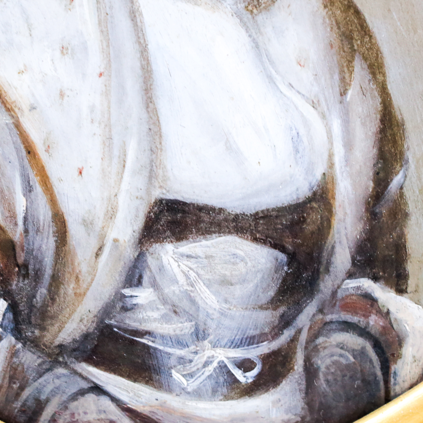 Bel ramino ad olio raffigurante donna in tipici vestiti del periodo, inizio '800