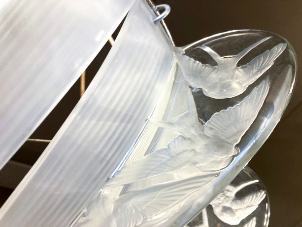 La calotta inferiore forma un nido stilizzato in bassorilievo, L'insieme è sorretto da sei cavi decorati con passamaneria. Firmato con un "R. Lalique".