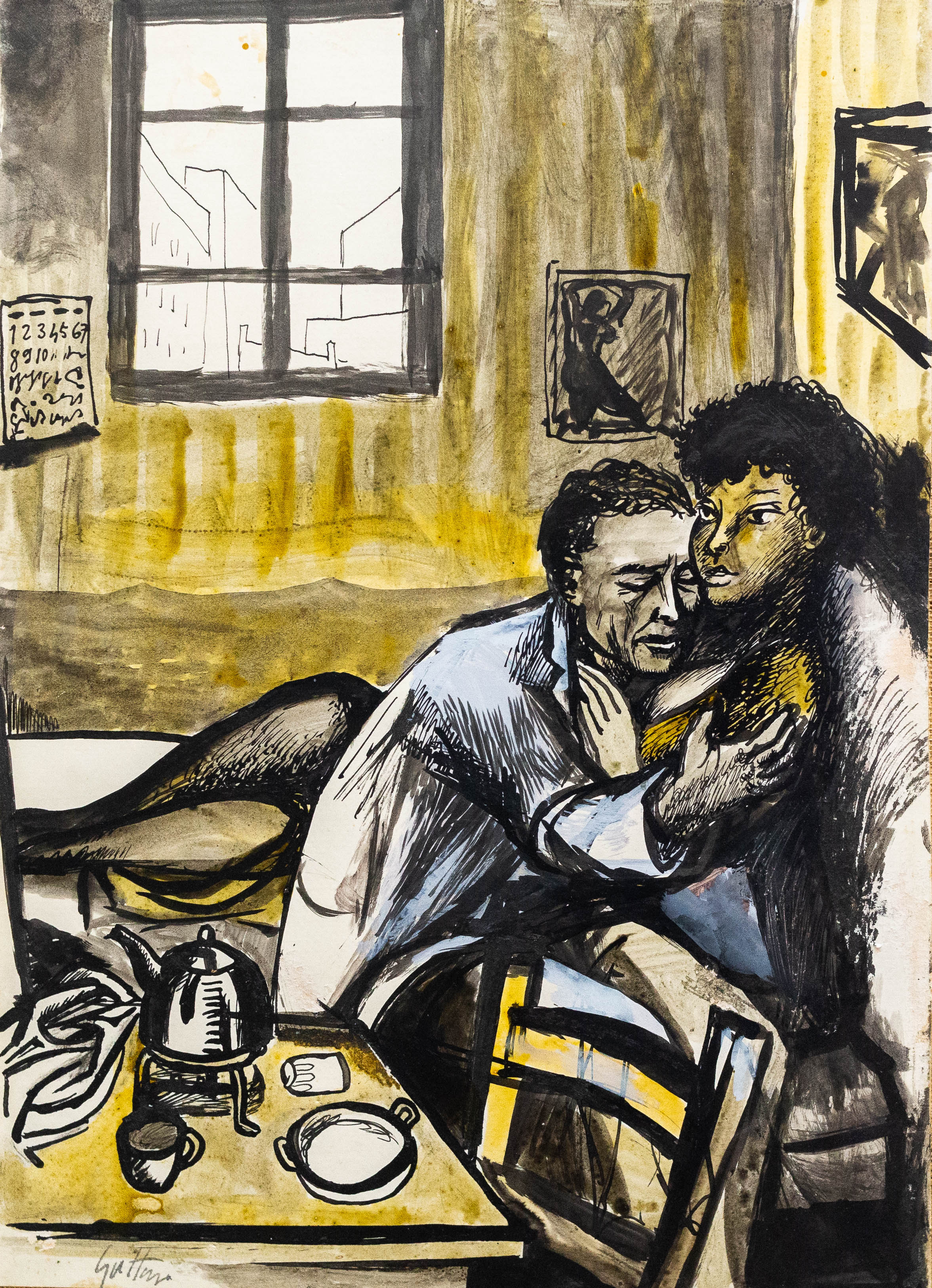 Renato Guttuso, "Amanti", gouache su carta intelata, firmato, 1960