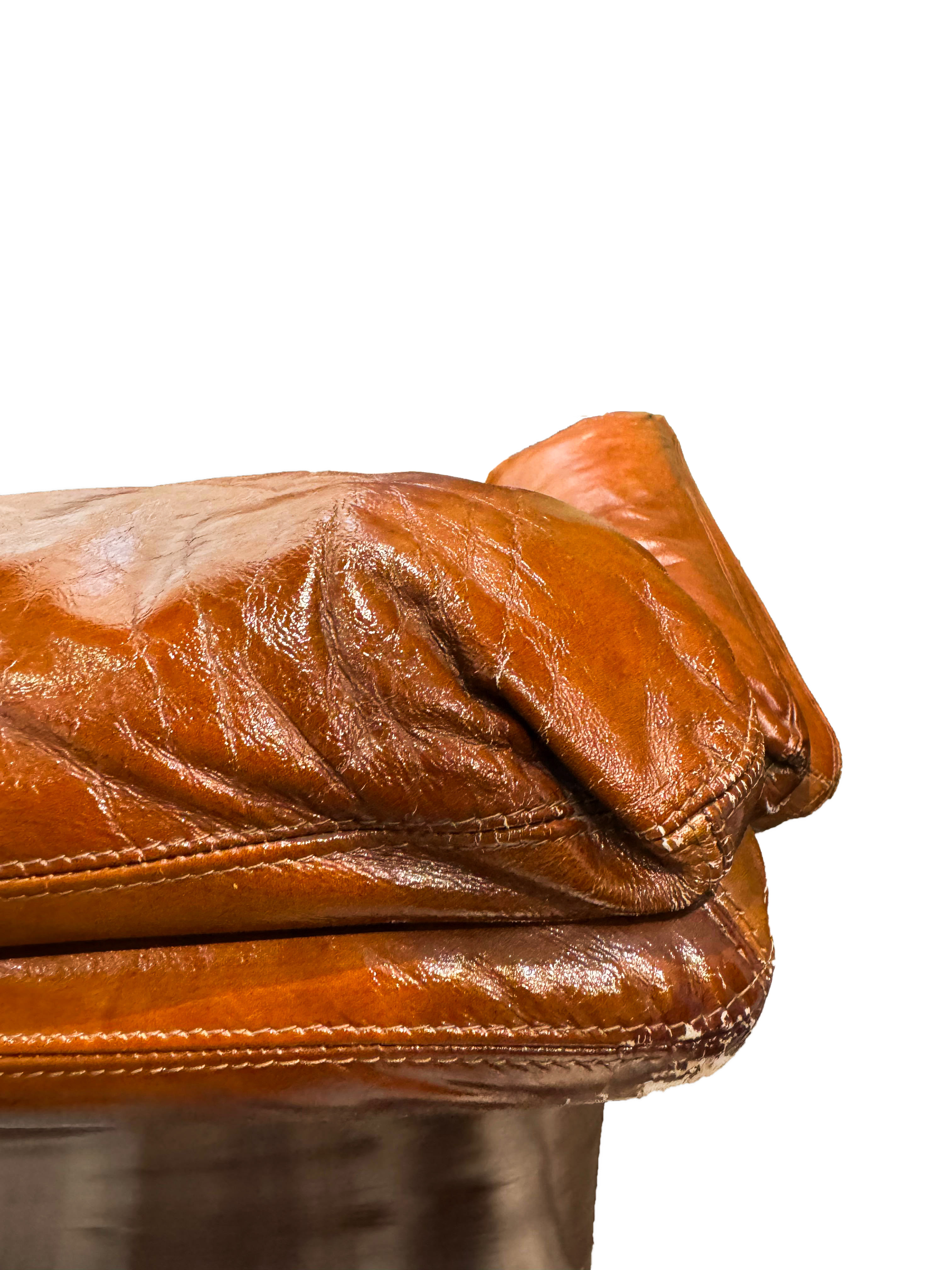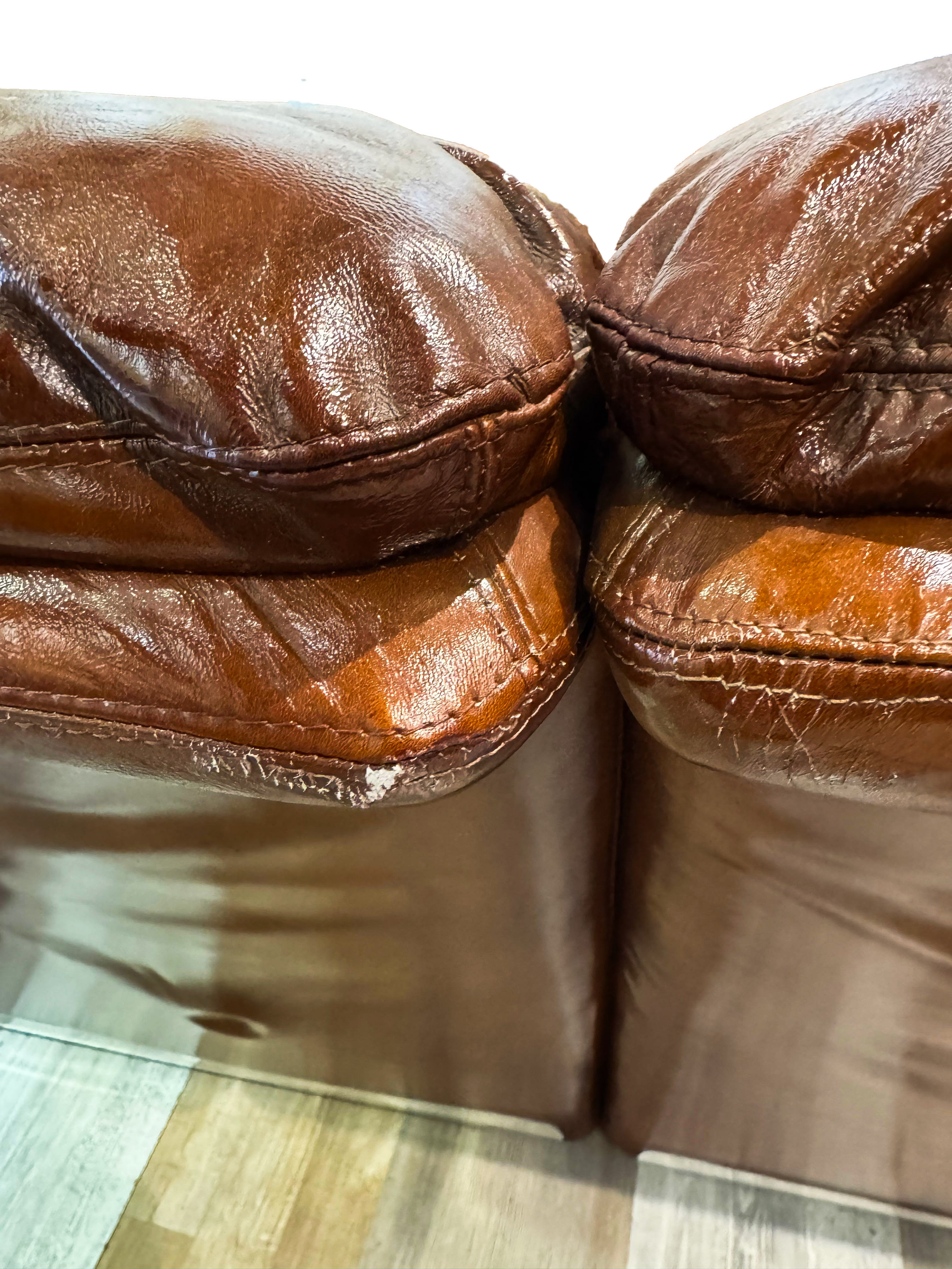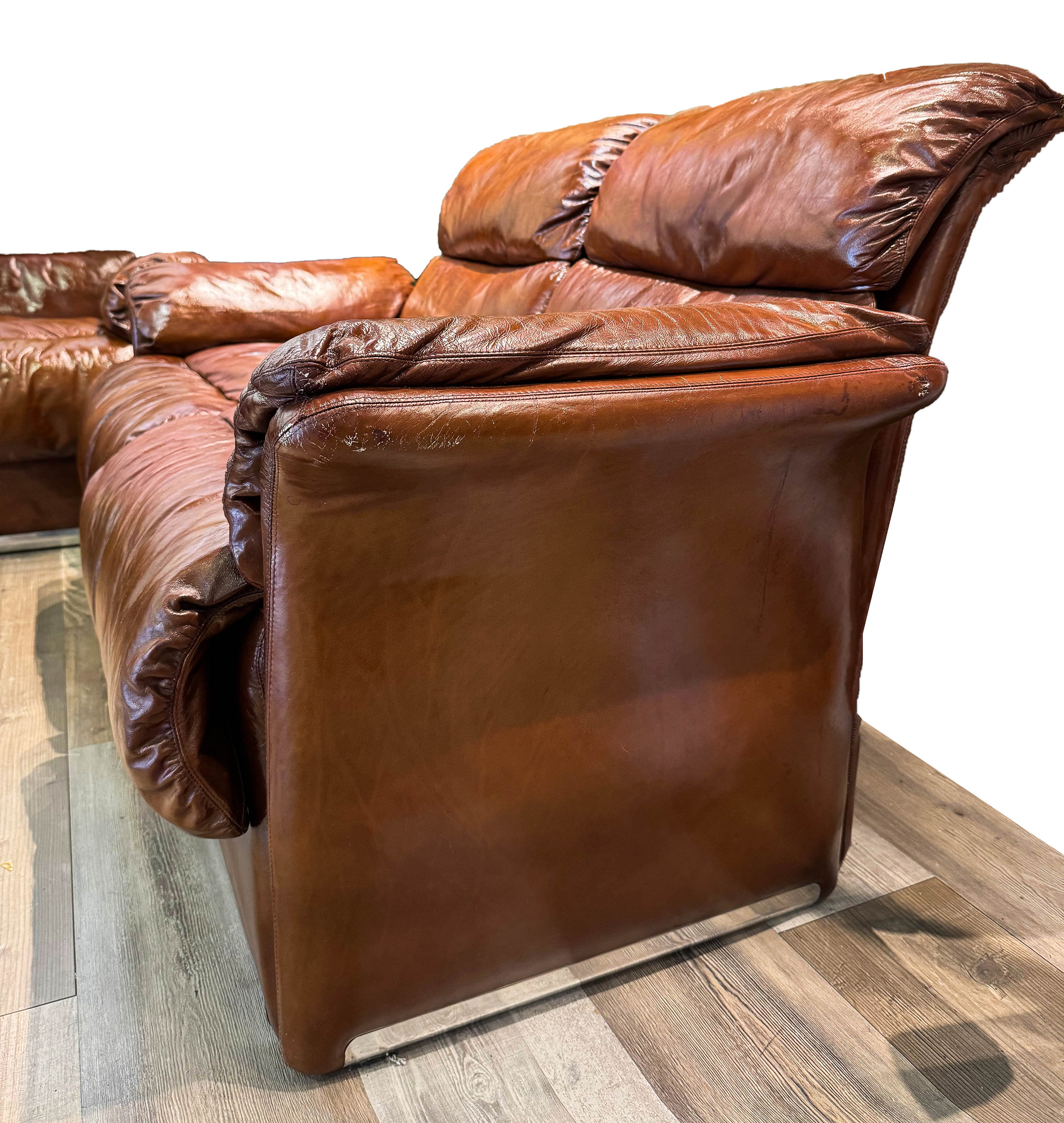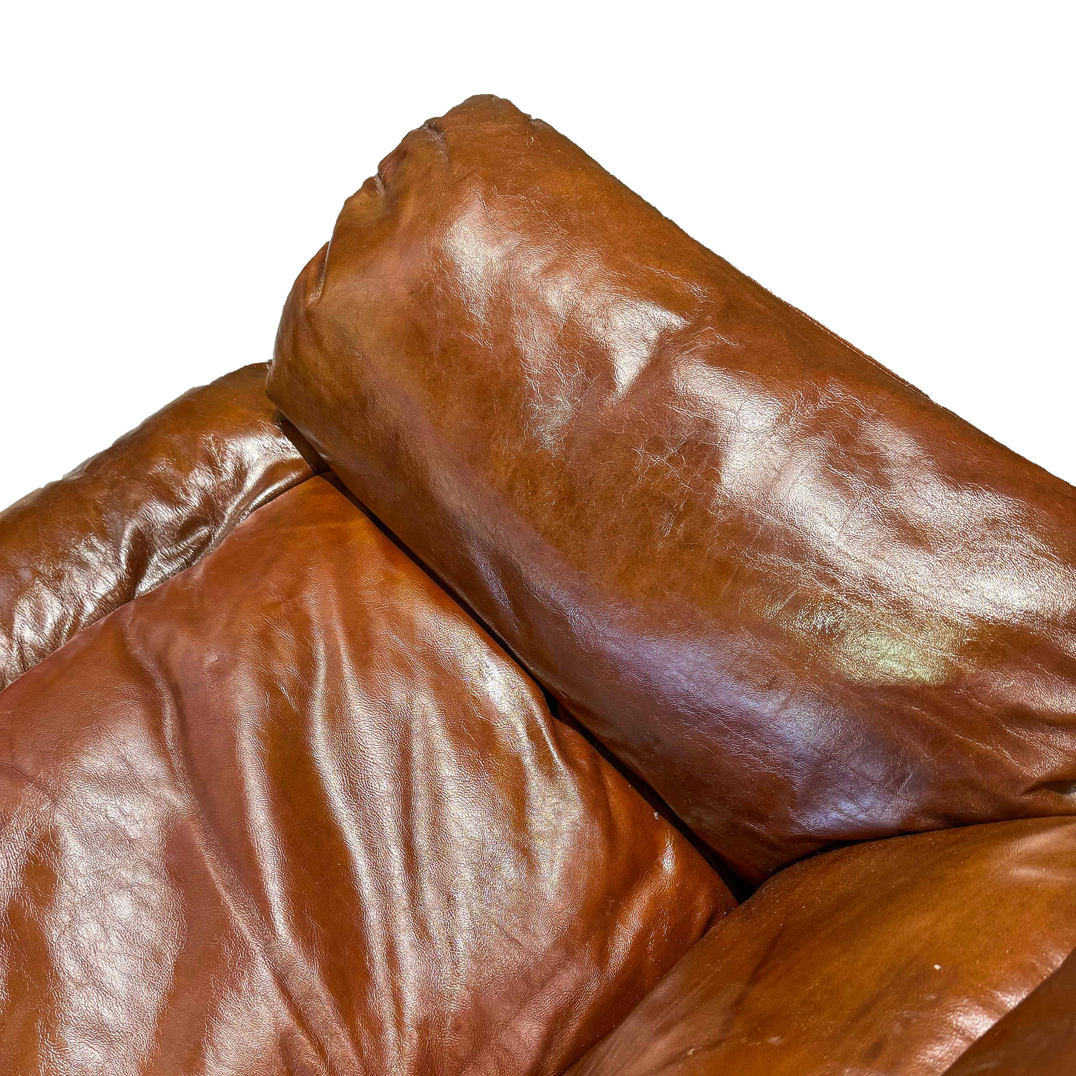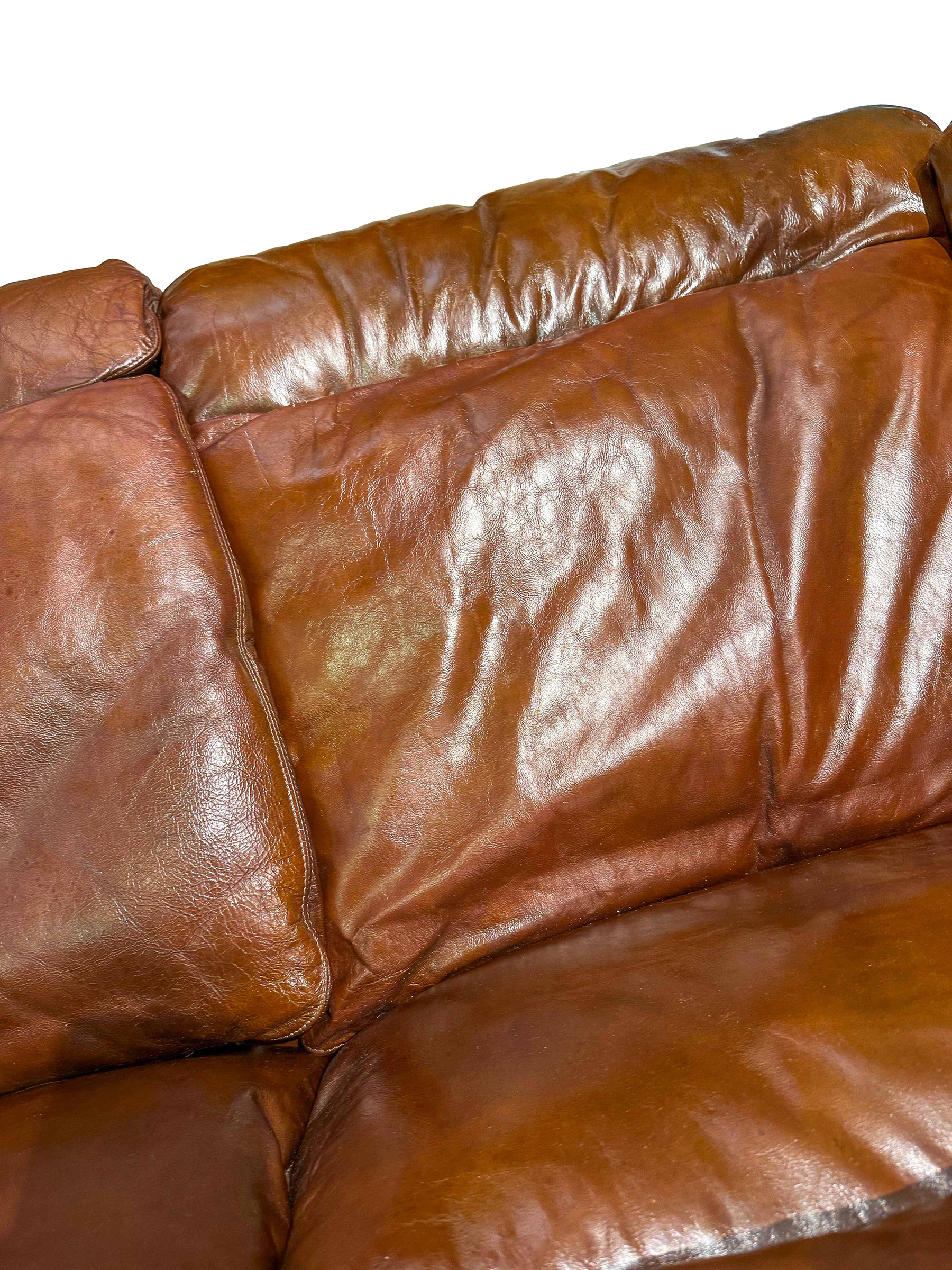Elegante coppia di divani realizzati da Saporiti Italia negli anni Settanta, rivestiti in pelle naturale color cuoio con una splendida patina d’uso che ne esalta il carattere autentico.