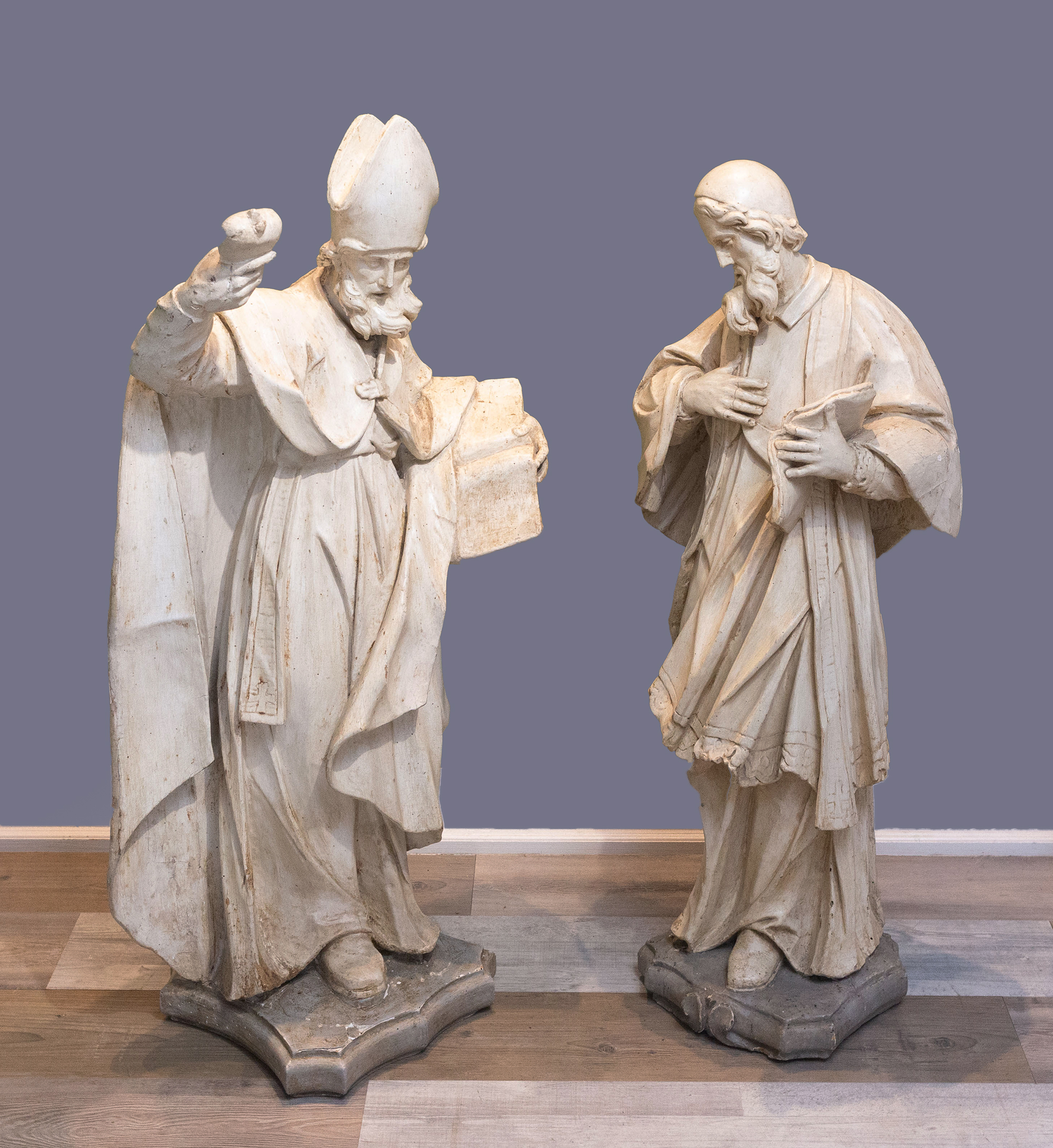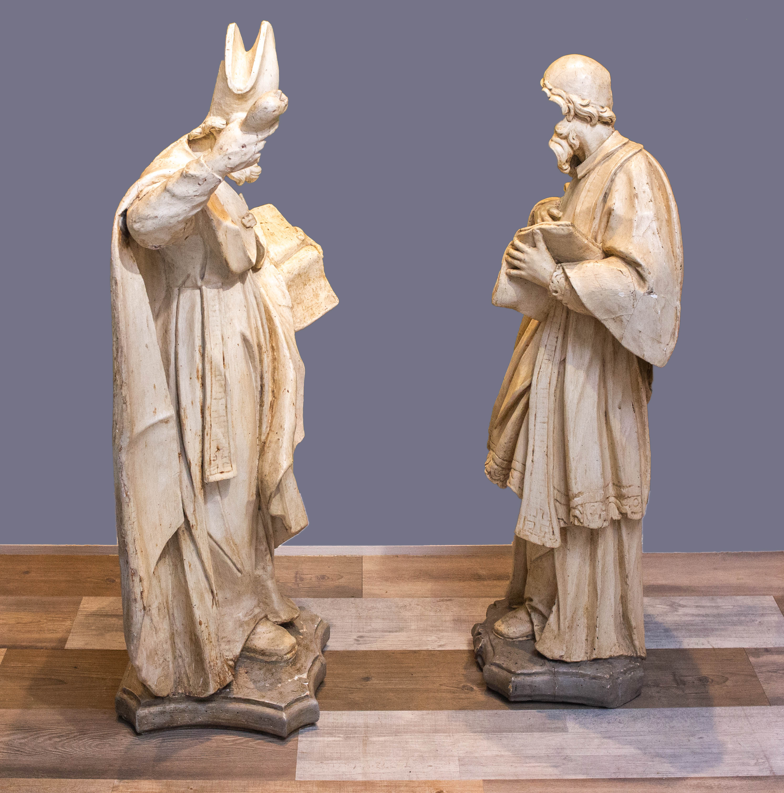 Belle e rare sculture in legno laccato di importanti dimensioni raffiguranti Sant' Onorato di Vercelli con libro e "cuore sacro", mentre Sant' Luigi con libro in mano.