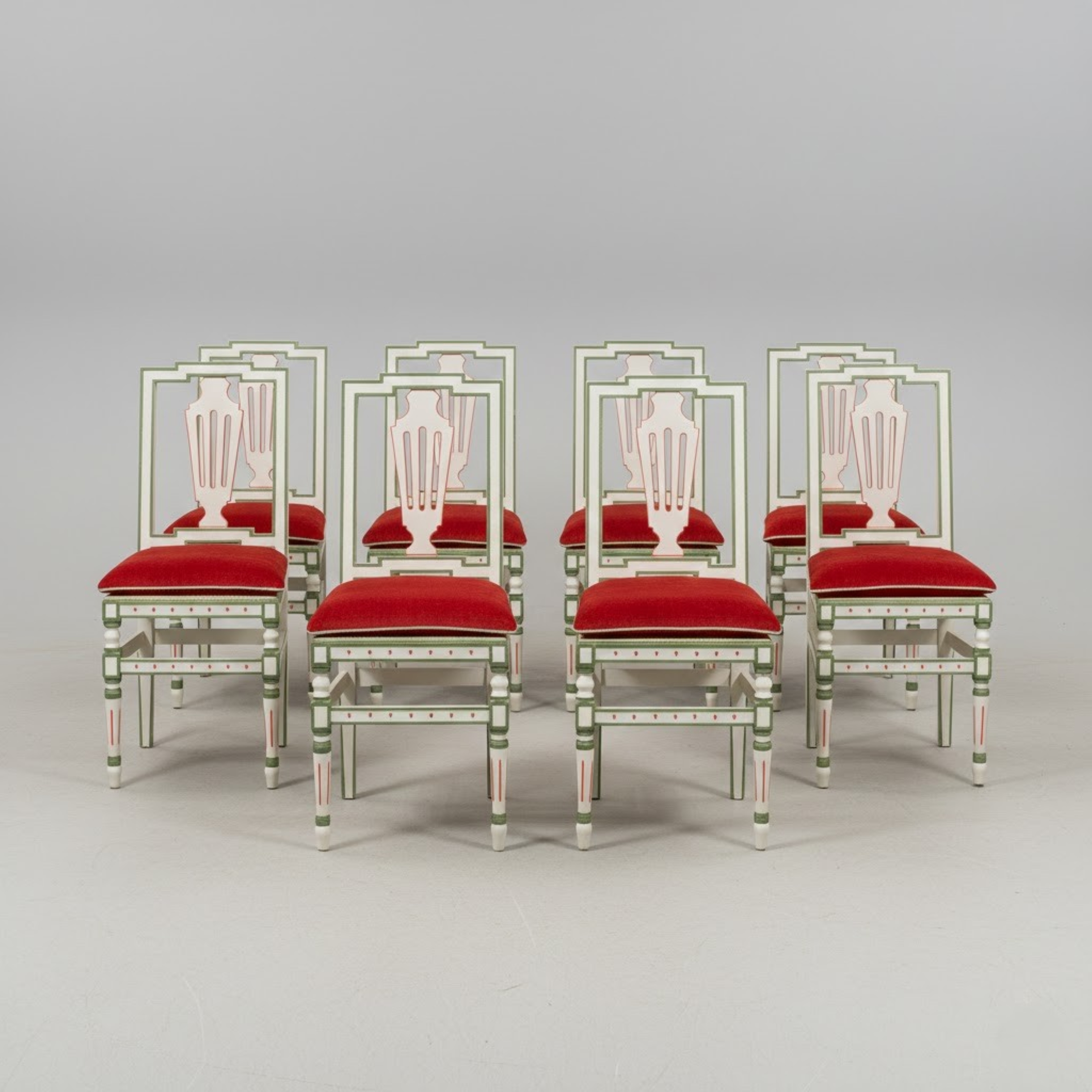 Belle ed antiche sedie in legno finemente intagliate e laccate con dettagli verdi e rossi.