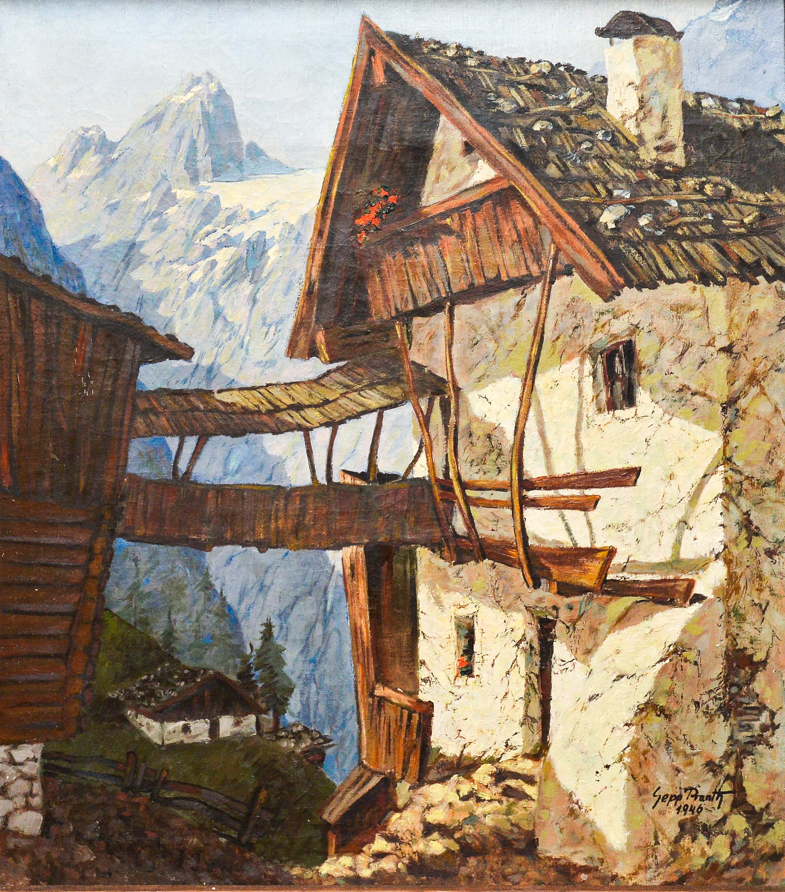 Bel dipinto ad olio su tela di Sepp Pranth rappresentante delle baite di montagna. Firmato e datato in basso a destra.