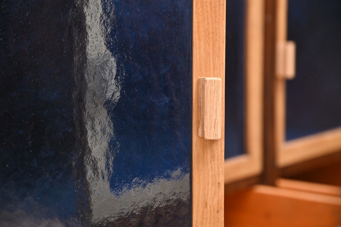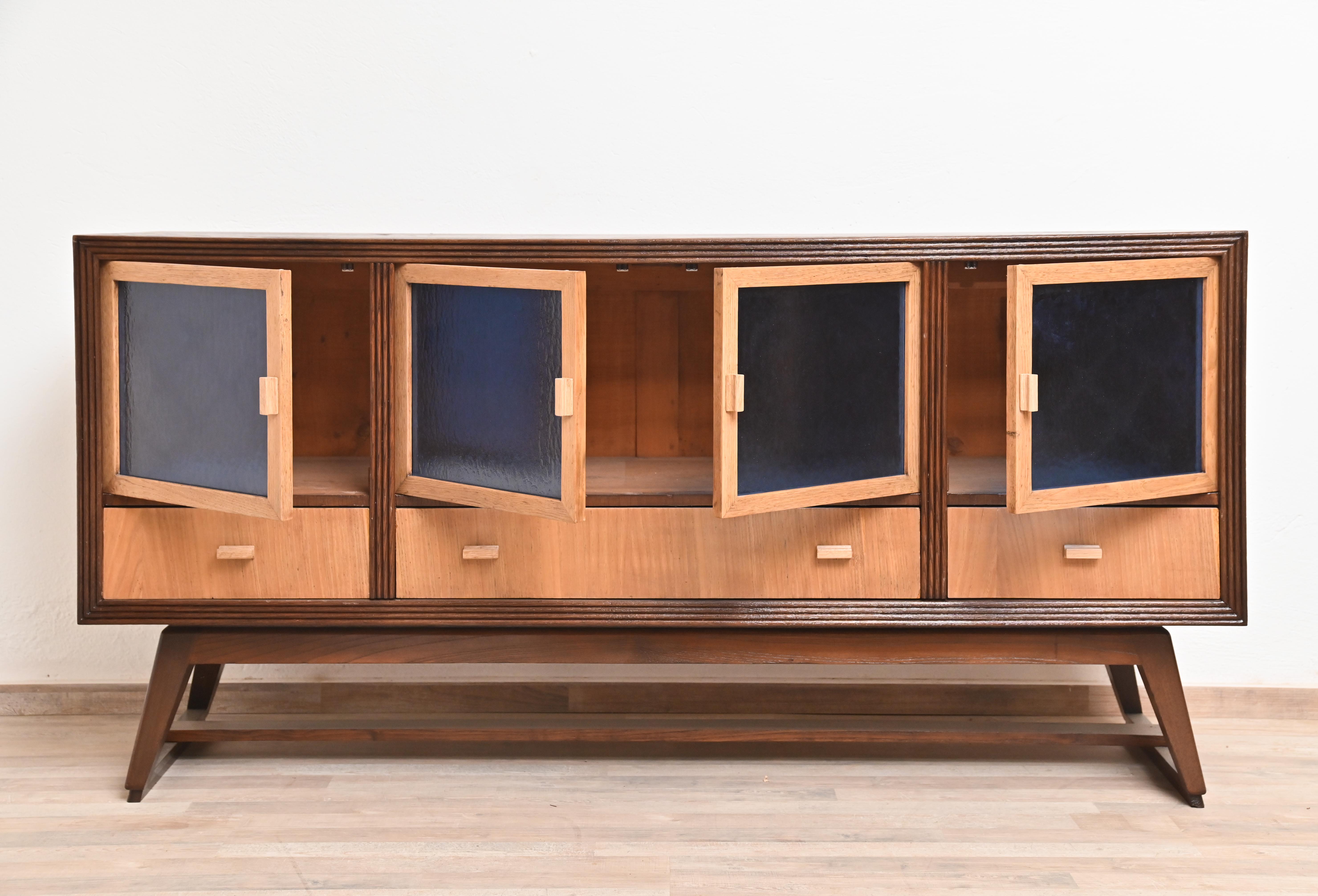 Credenza anni '50 impiallacciata in castagno, composta da 4 ante a vetro, cassetti alla base. In ottime condizioni. È possibile acquistarla in coppia con https://www.beggiantichita.com/credenza-anni50