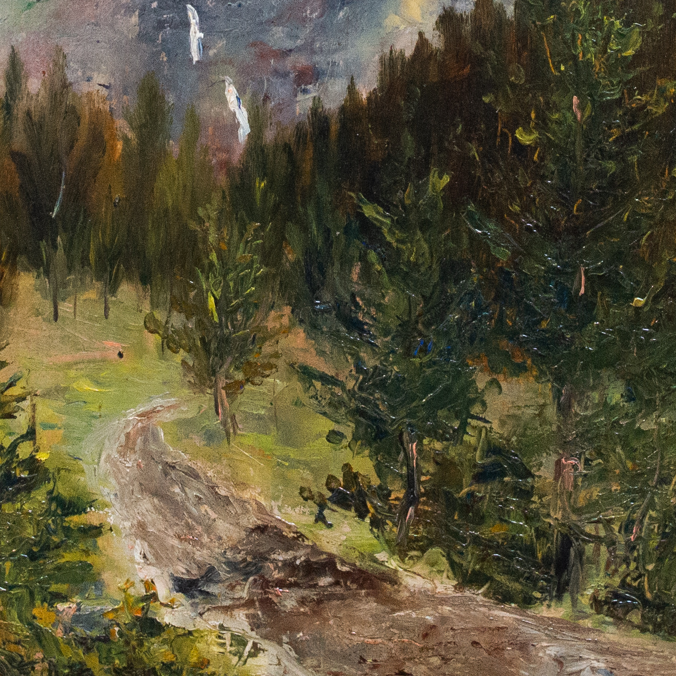 Bel dipinto raffigurante sentiero nel paese valdostano di la Thuile, sullo sfondo viene rappresentato il Monte Bianco in tutta la sua maestosità.