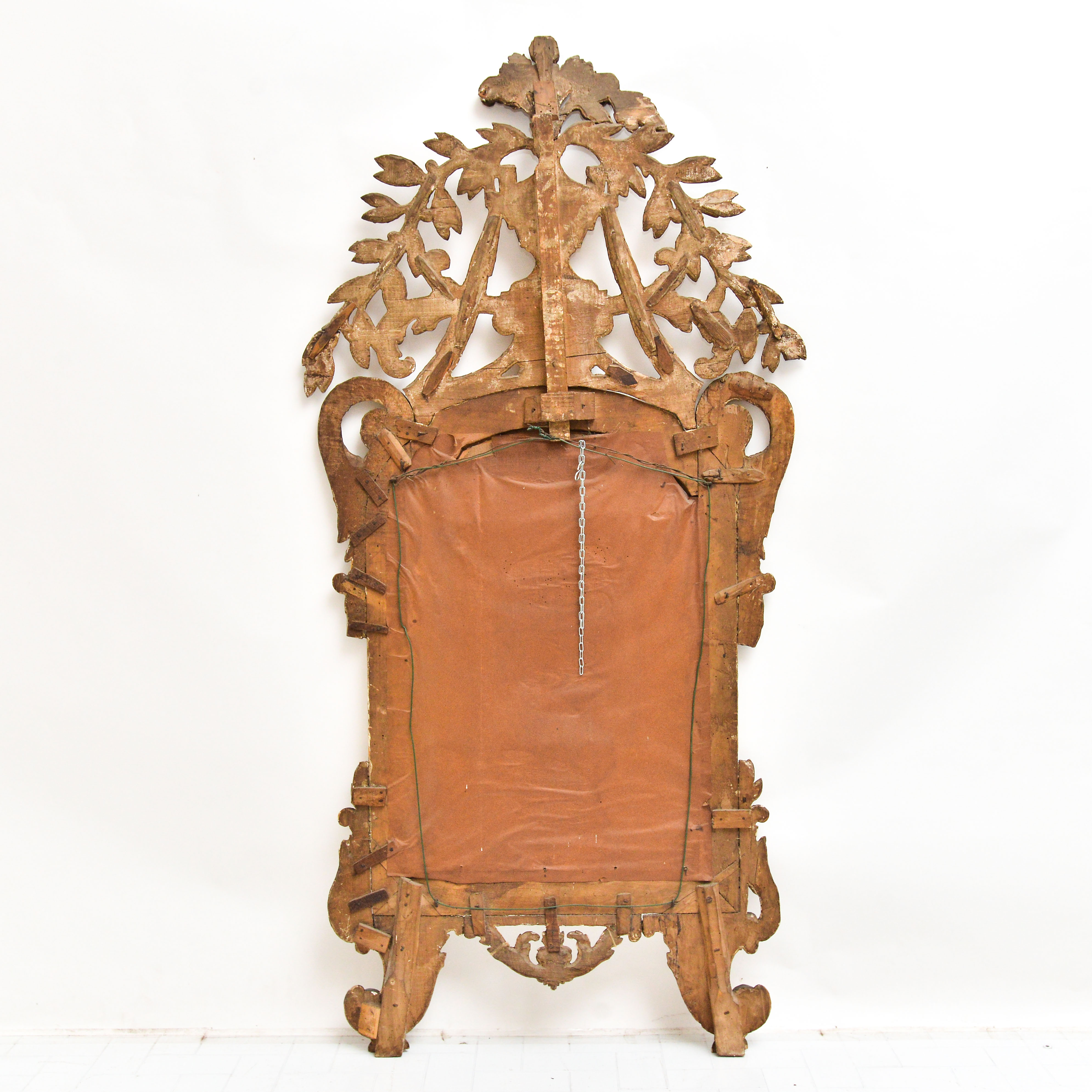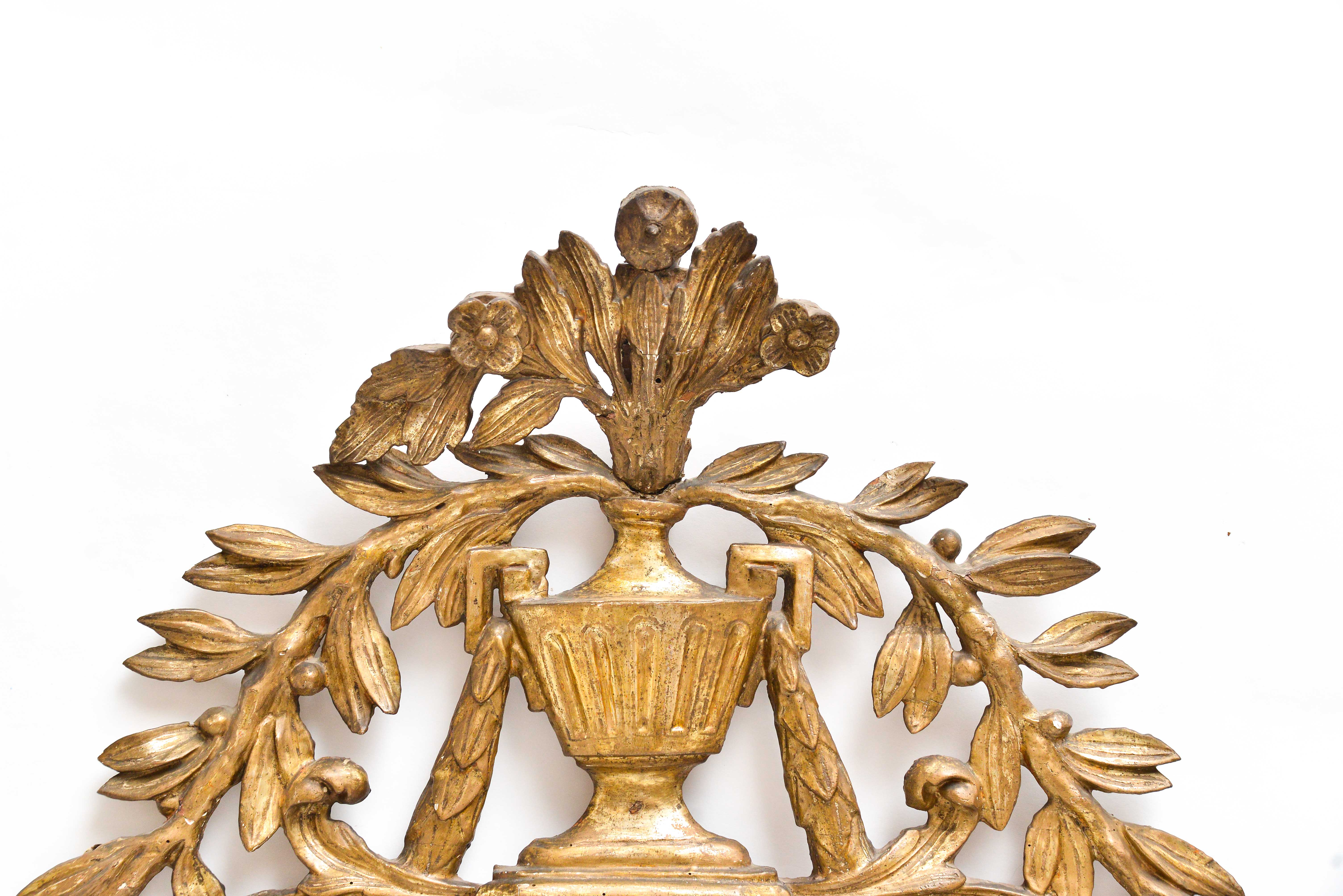 Piedmontese mirror in Transition style, dating from the late 1700s / early 1800s. Carved and gilded mecca wood frame. Part of the molding is missing.