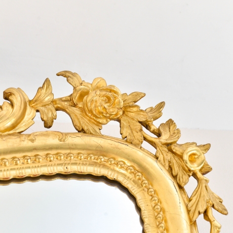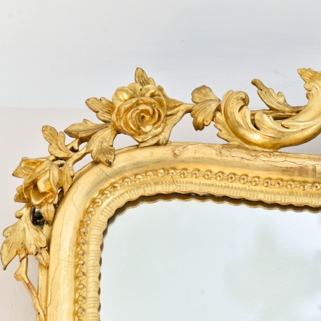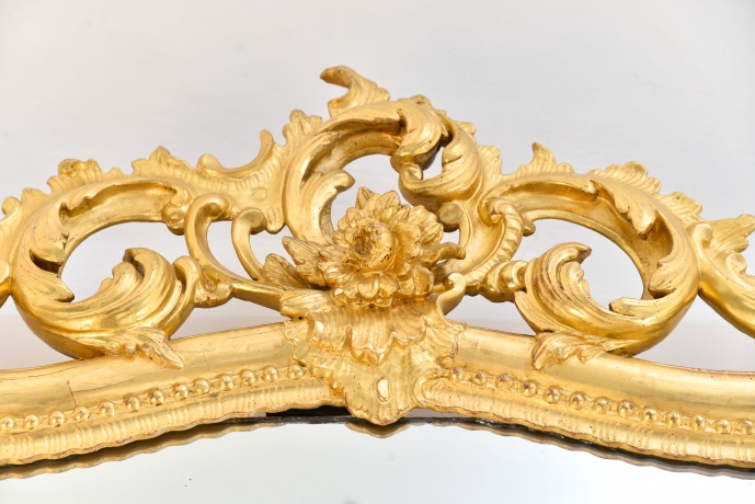 Grande specchiera caminiera piemontese in legno finemente intagliato e dorato a guazzo, risalente alla seconda metà dell'800